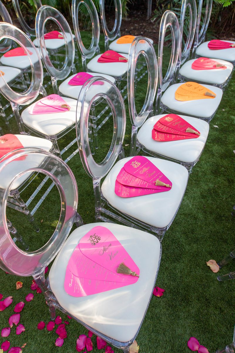 The mood was set with a joyful and bold color palette that matched the couple’s lively personalities. Everything from the décor to the details radiated happiness. Instead of traditional place cards, guests received tickets to the show, setting the tone for the night ahead.
