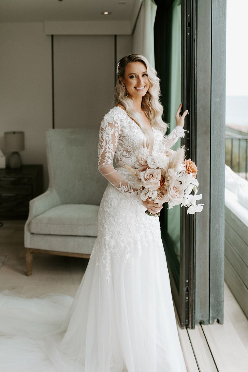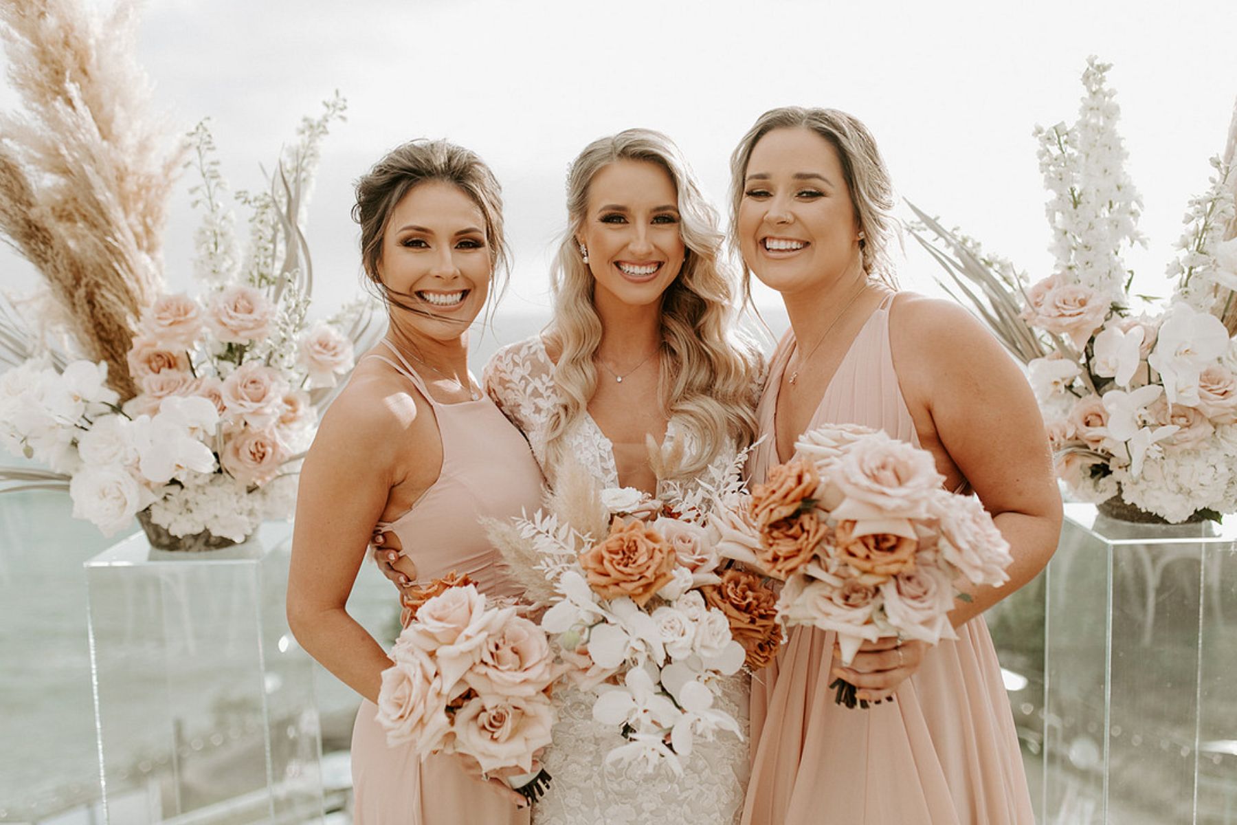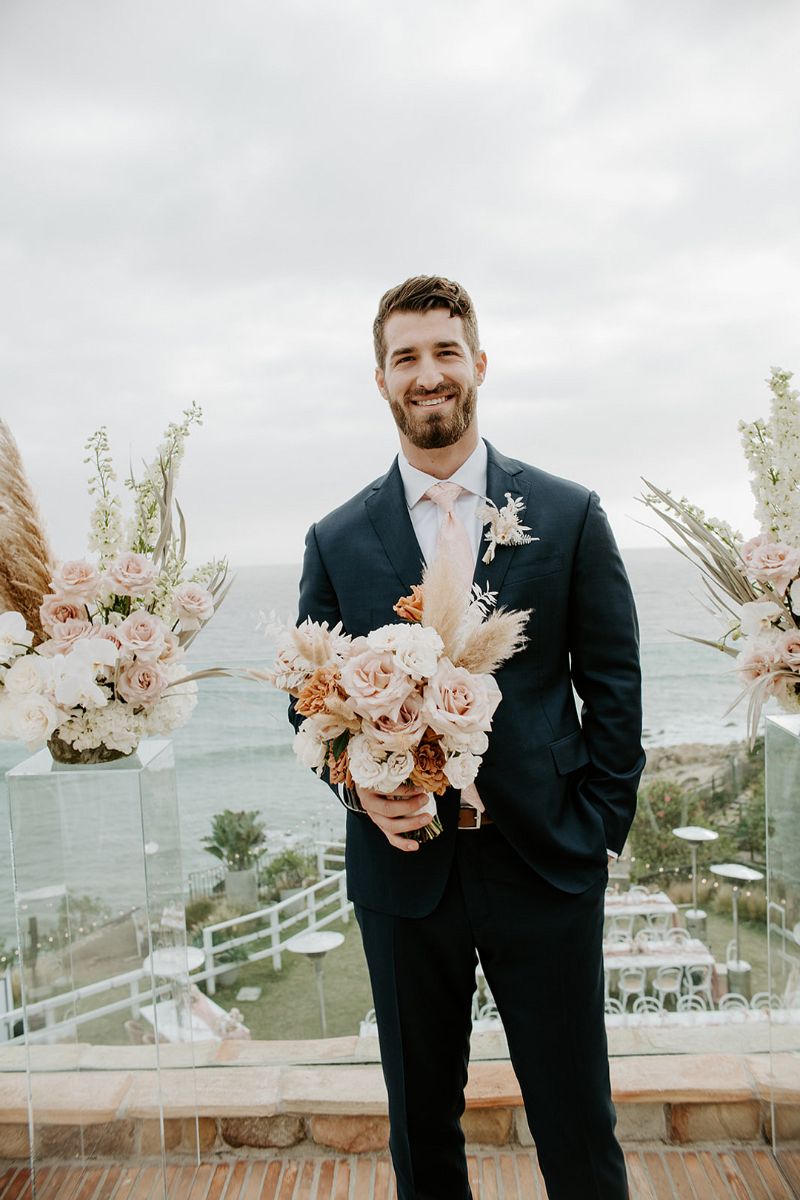 The coastal setting spoke for itself, so décor was kept simple and elegant with soft blush tones, acrylic details, and floral arrangements that transitioned seamlessly from ceremony to reception. The bride carried a bouquet of blush and toffee roses, orchids, and pampas grass, while the groom looked sharp in his custom-tailored suit.