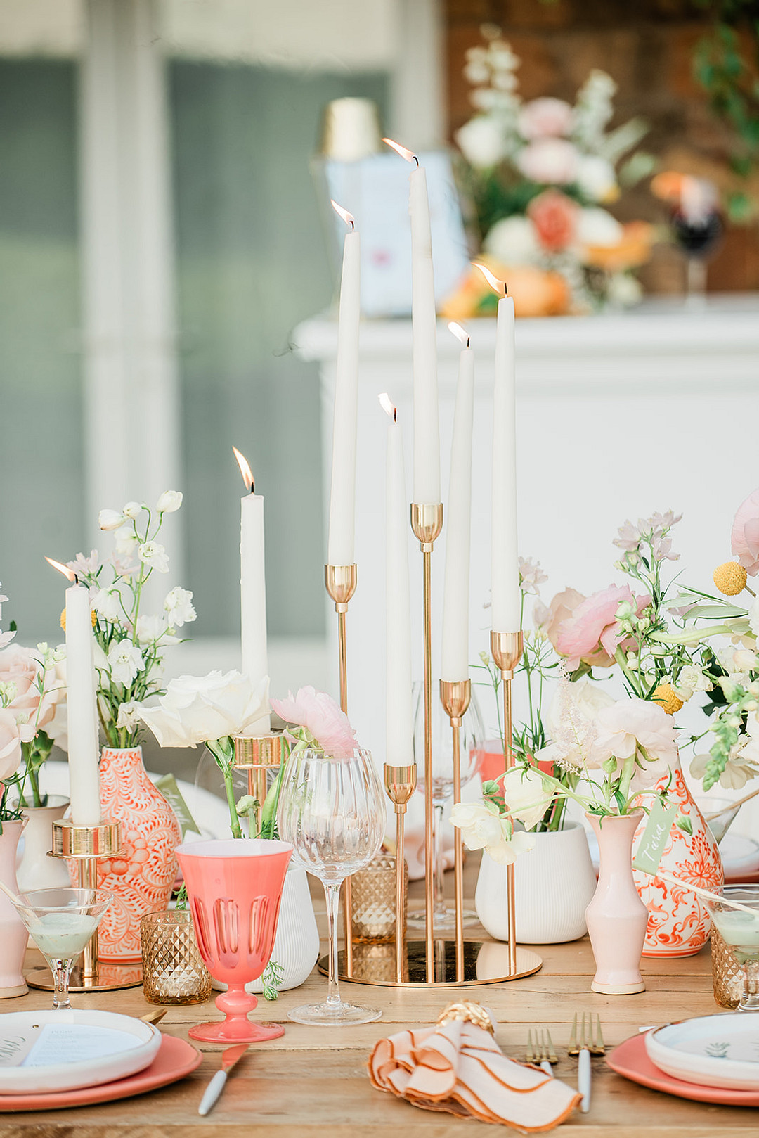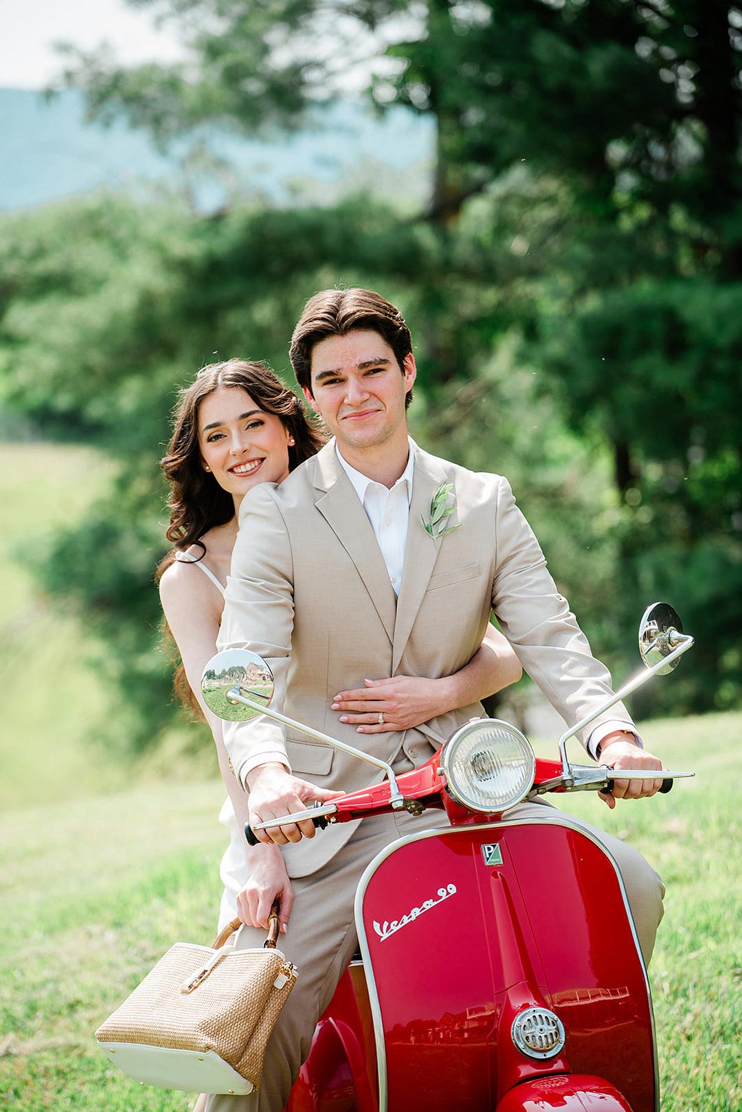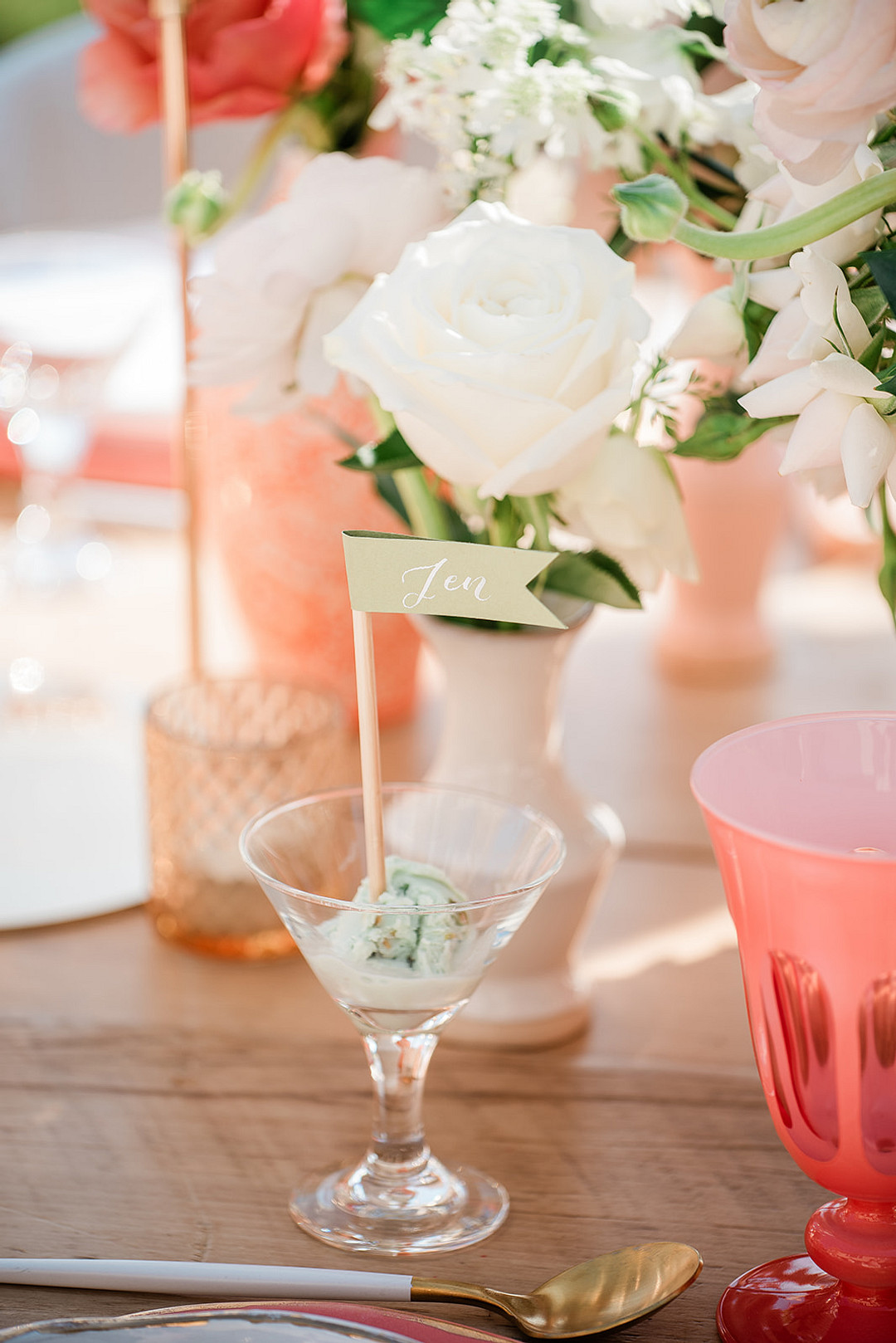 The tablescape was a true highlight: terra cotta tones met soft pistachio accents, each place setting thoughtfully styled with a custom gelato cup and flag escort card. A Vespa added the perfect Italian touch, while a specialty seating chart crafted with terra cotta tiles completed the look.
