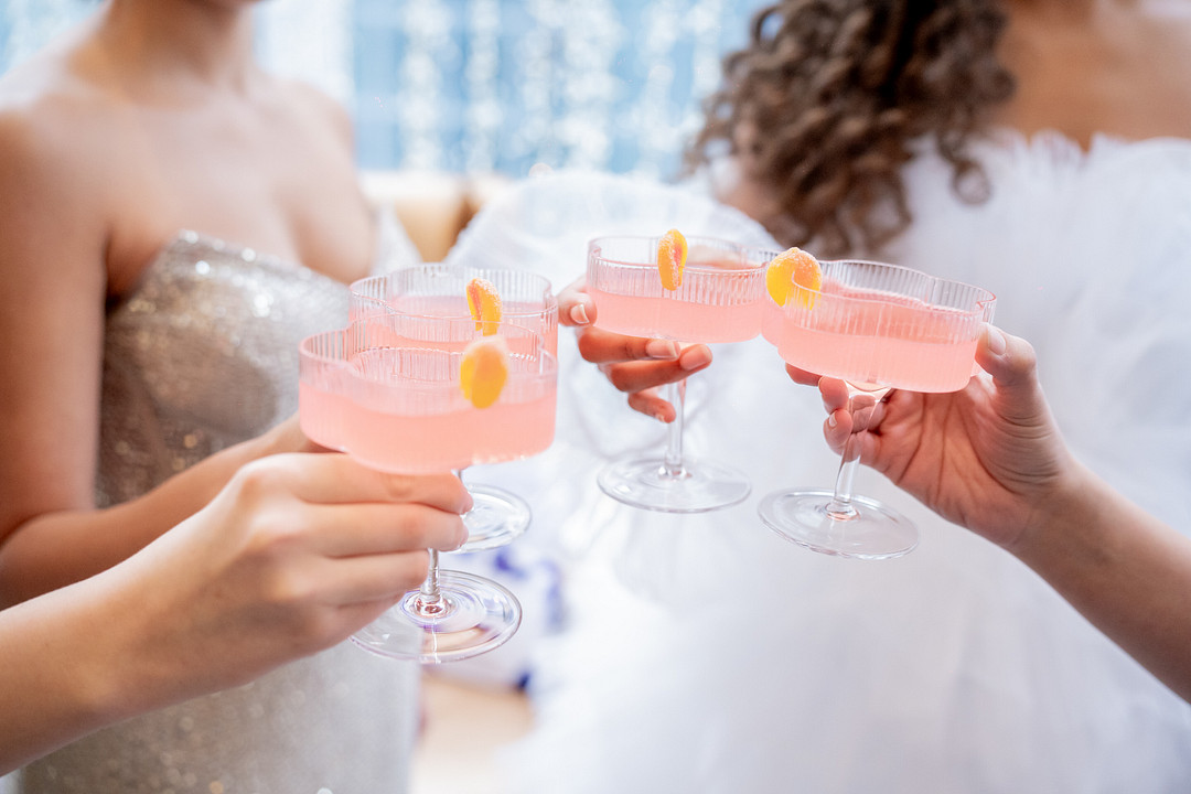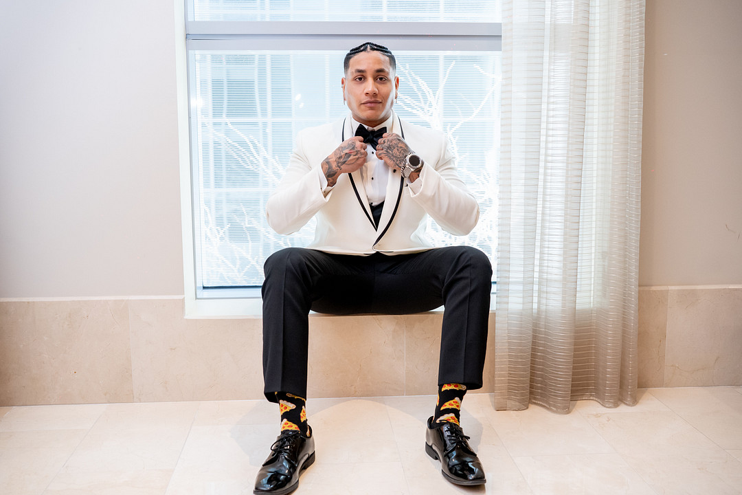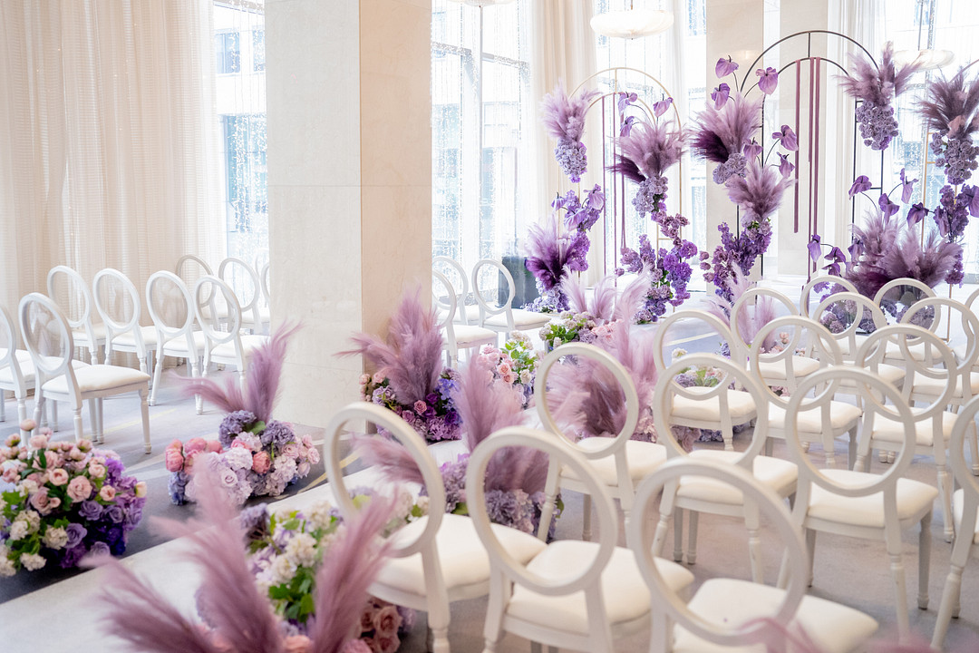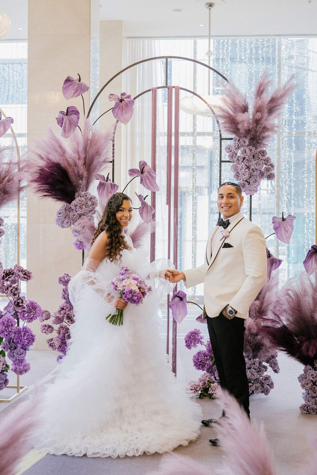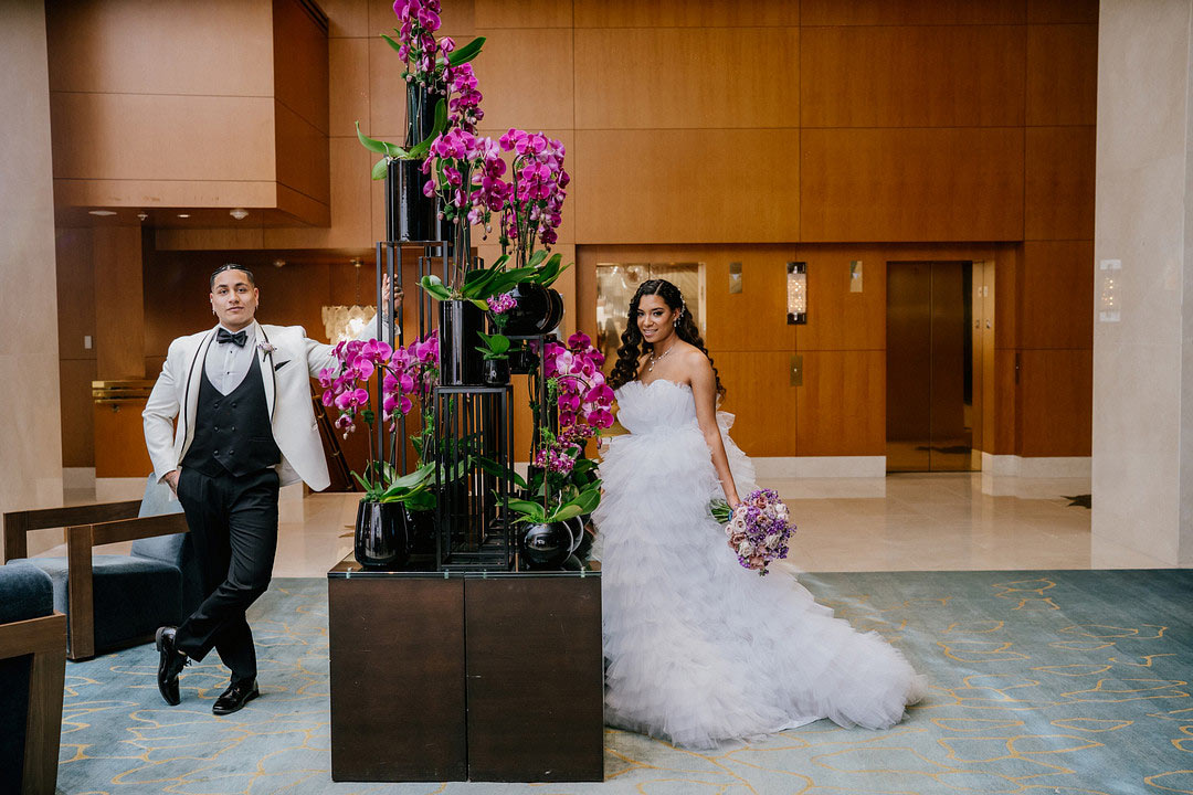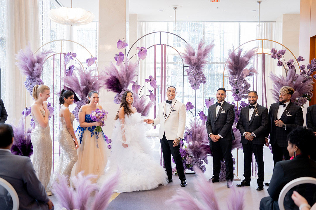 The ceremony took place in front of expansive floor-to-ceiling windows, where natural light poured in and florals bloomed in lush, opulent arrangements. The bride and groom, styled in sophisticated attire that reflected classic glamour, radiated joy and confidence. The groom’s four brothers, serving as groomsmen, wore jeweled music notes on their lapels in place of traditional boutonnieres, while the bridesmaids each wore delicate wrist corsages—thoughtful details that added a personal touch to the overall aesthetic.