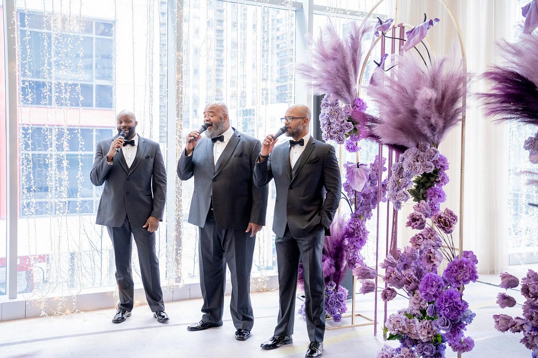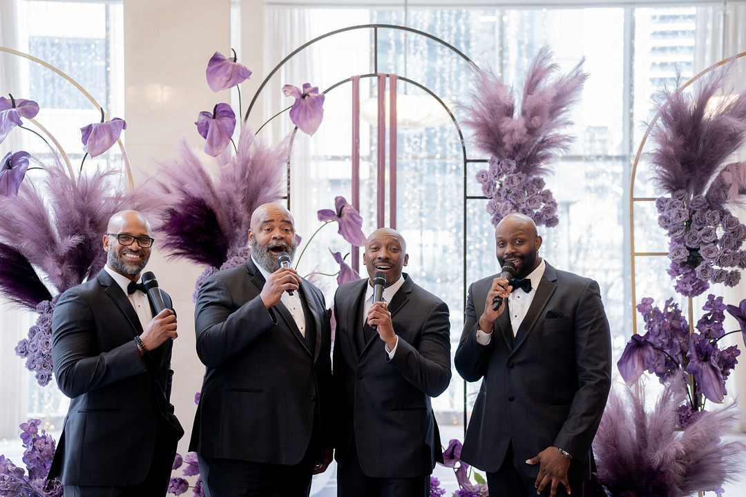 This unforgettable wedding celebration embraced the rich, romantic tones of purple and the timeless energy of Motown music. From the moment guests arrived, they were welcomed by a beautifully decorated baby grand piano and the smooth, soulful sounds of a live Motown band, setting the tone for a day filled with elegance, nostalgia, and heart.