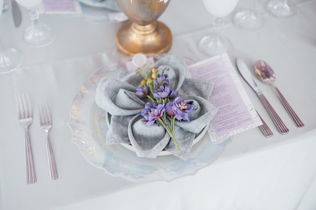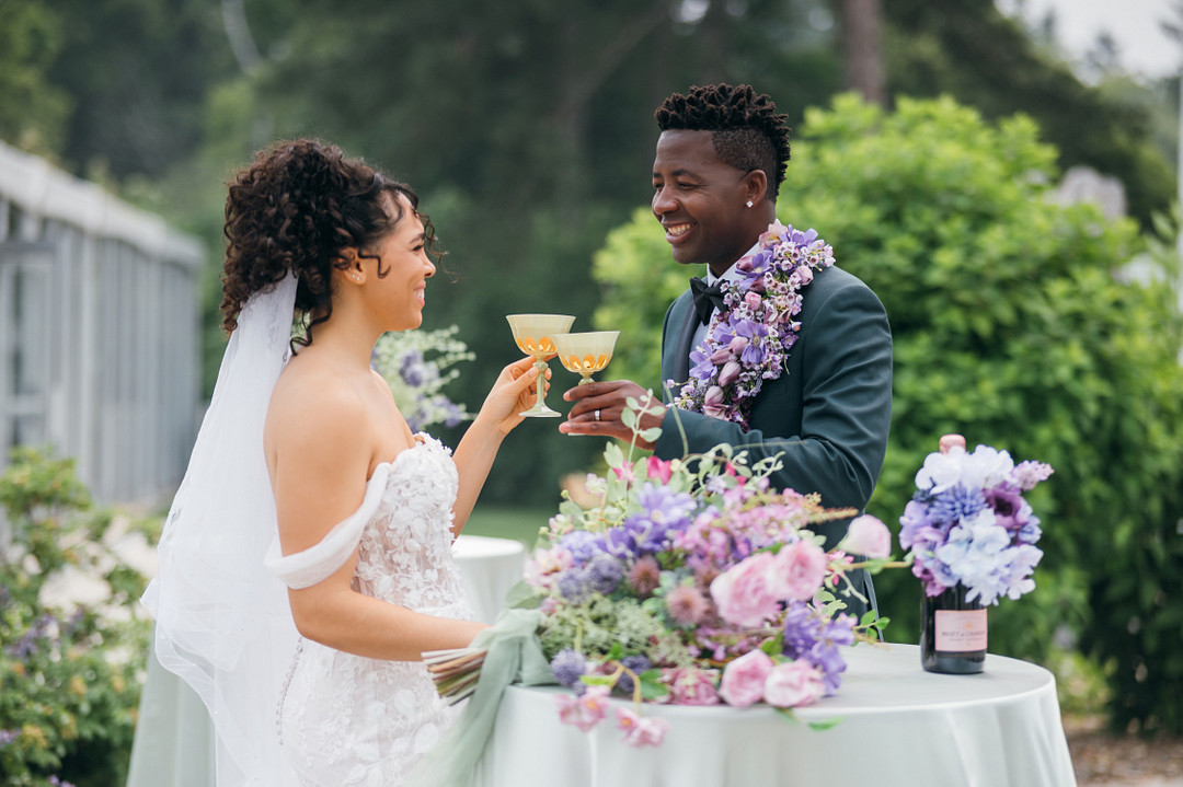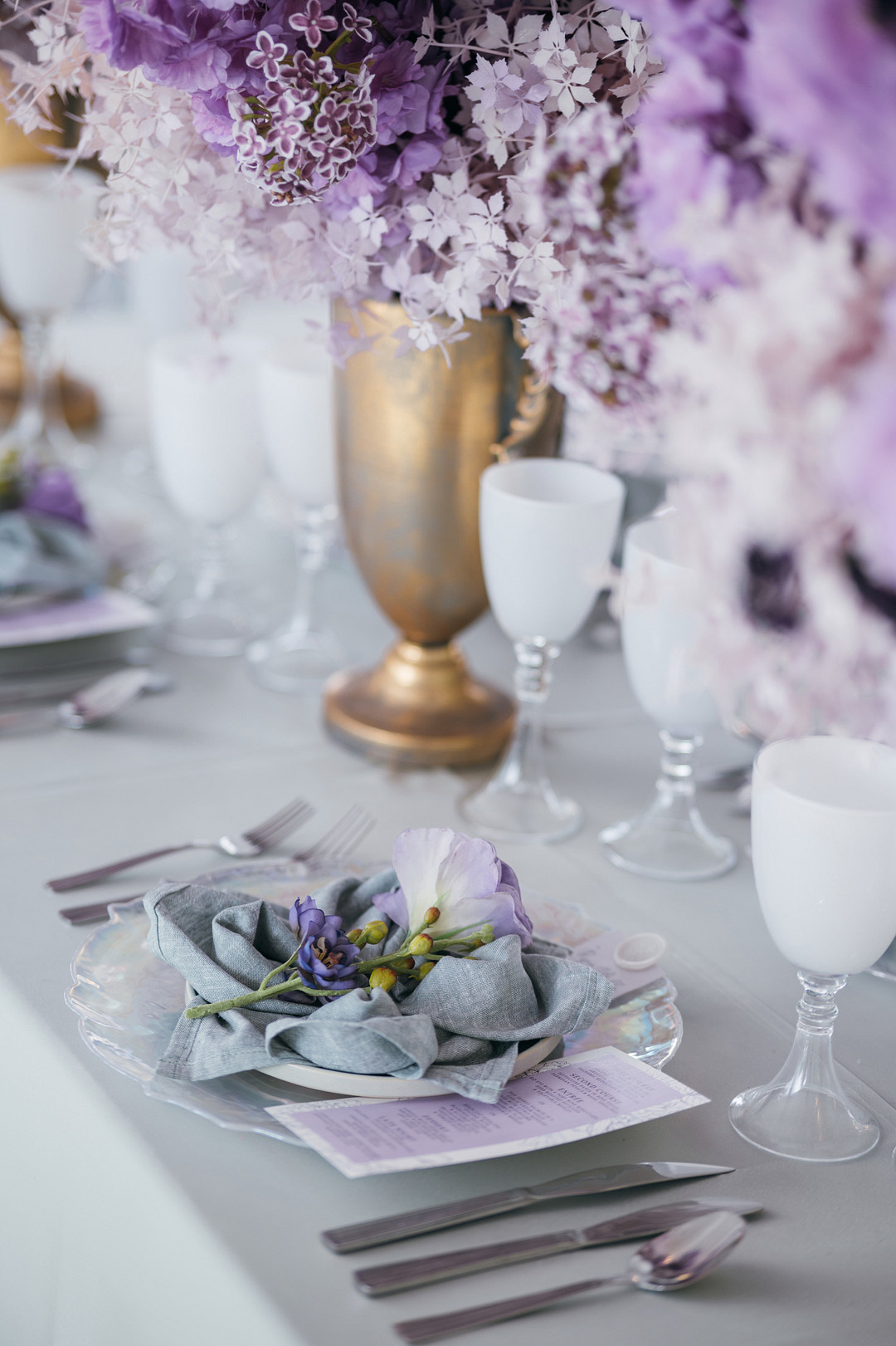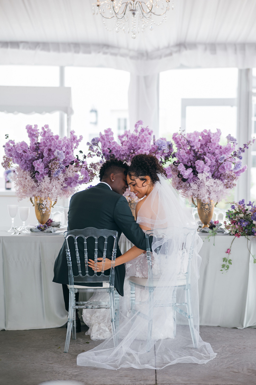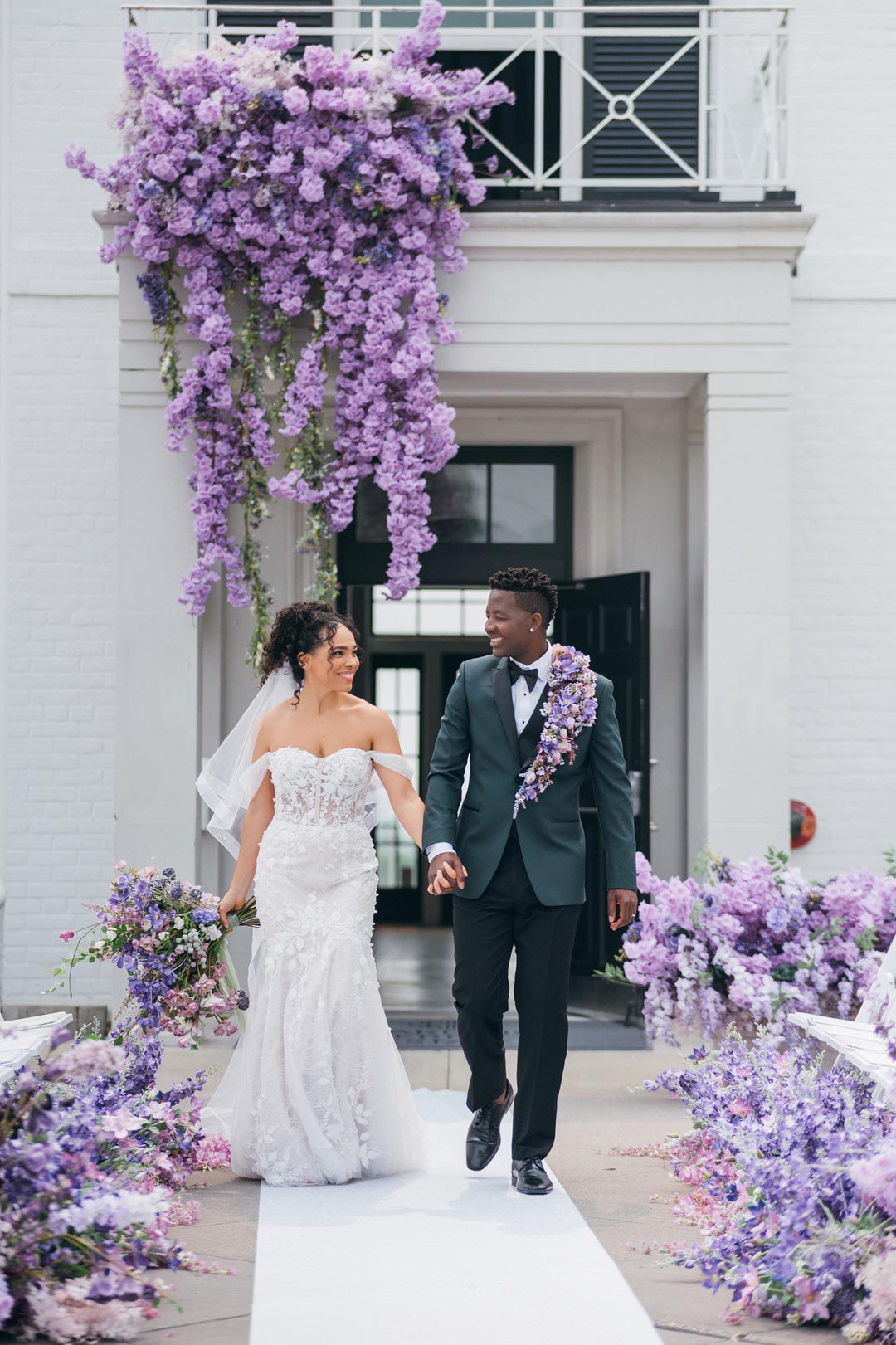To begin, florals take center stage. Shades of purple bloom everywhere, adding depth and romance. Instead of a classic boutonniere, the groom wears a trailing lapel floral—an unexpected, stylish choice.