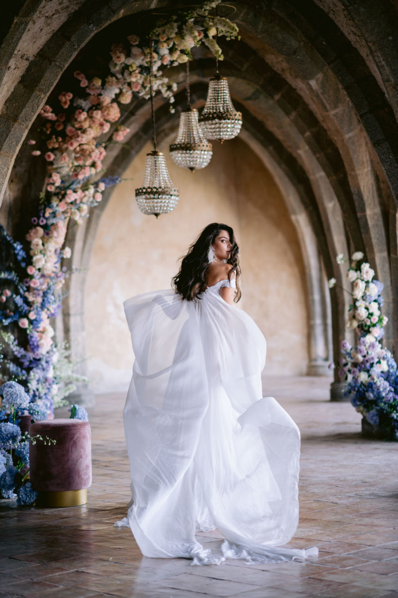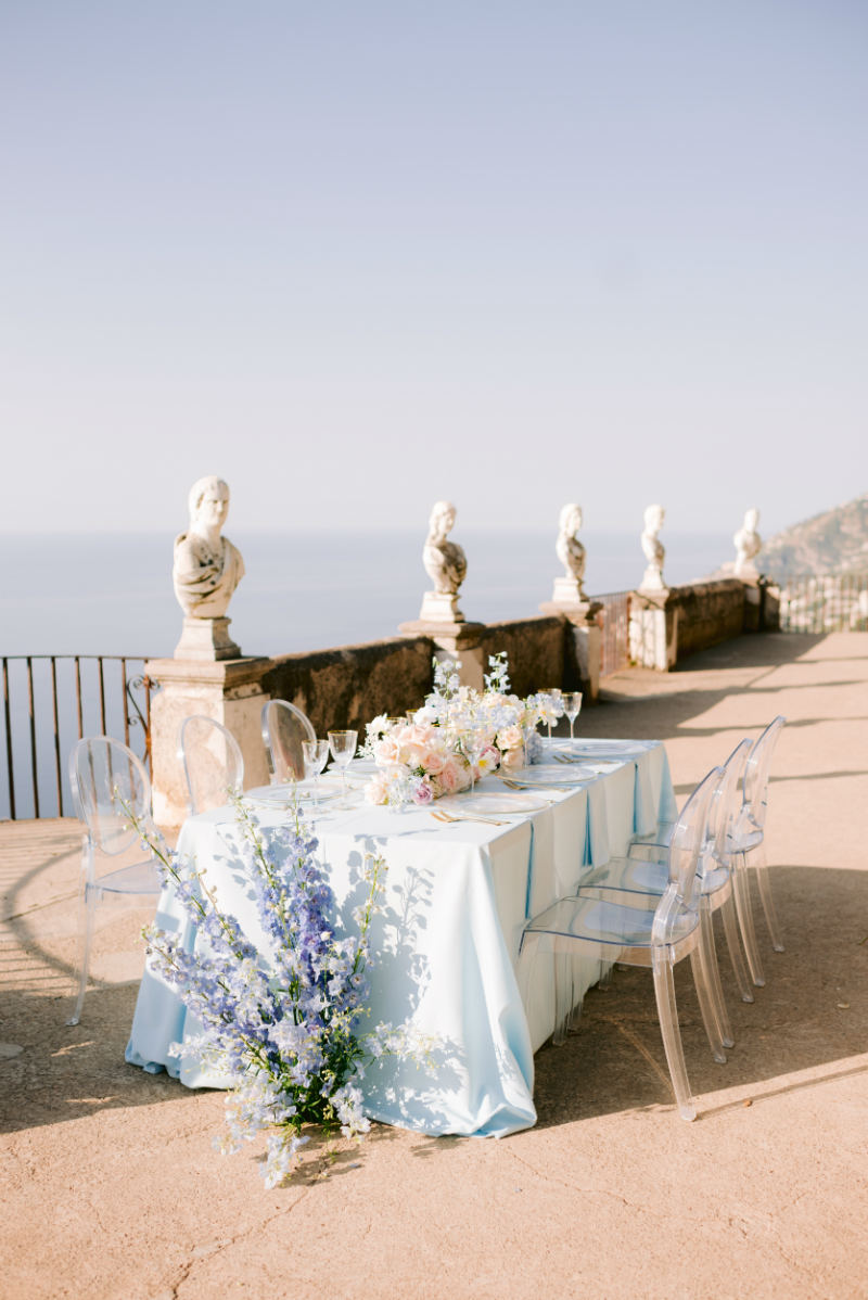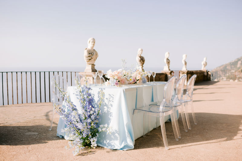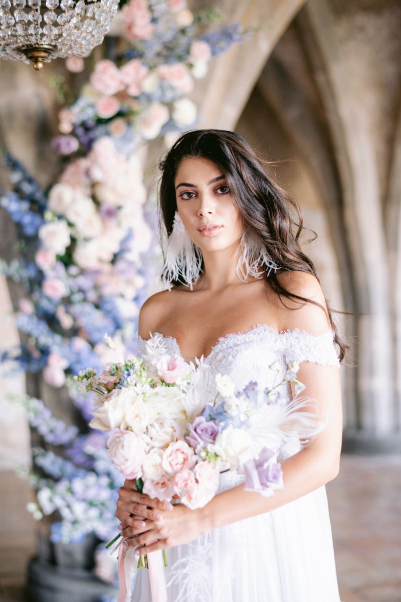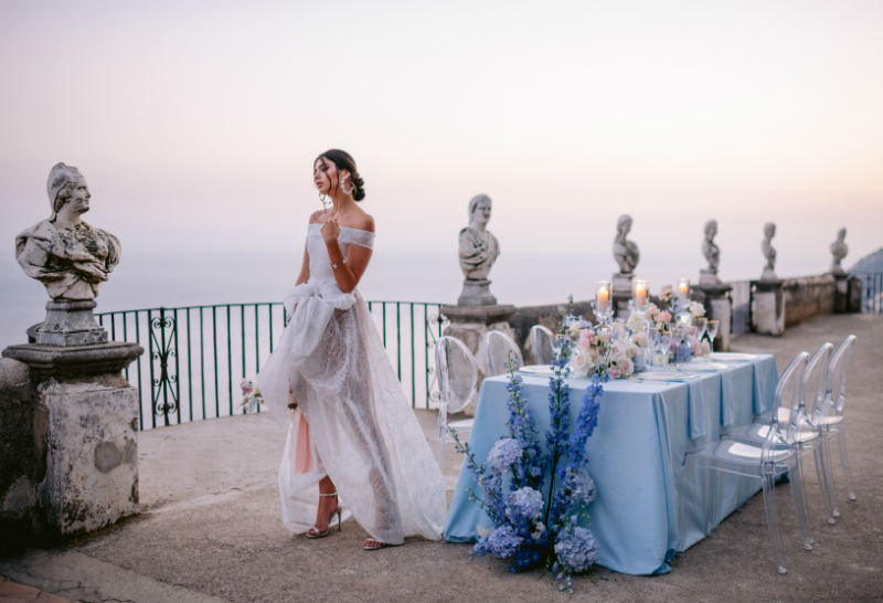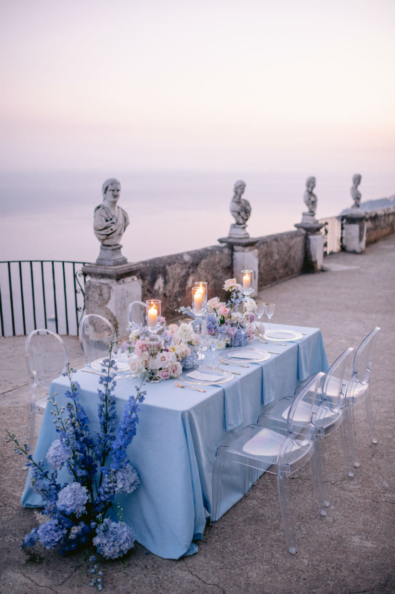 The inspiration for this wedding styled shoot was to create a real-life fairytale. Paulina of Events by Paulina always loved Sleeping Beauty, so she chose the feel and color inspiration from the Disney classic movie. The team’s blue use is inspired by the Mediterranean Sea, which is a significant part of the venue.