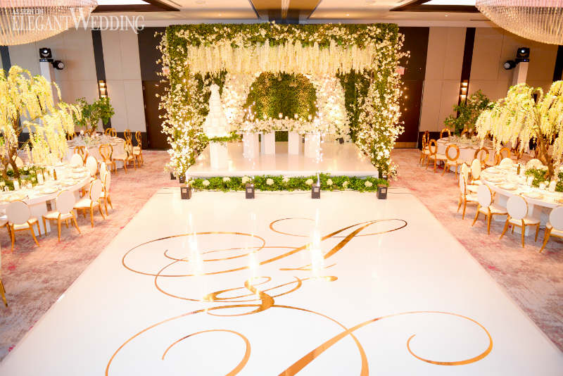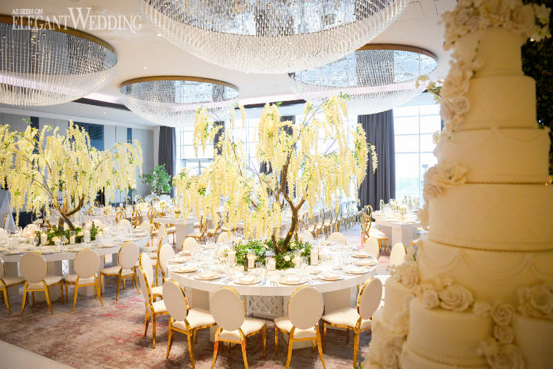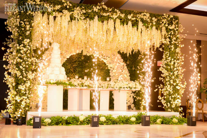 A seemingly endless sea of fresh florals from Gatto Flowers turned Ashley and Danny’s reception into an incredible fairytale. 12-foot-tall wisteria trees at most tables by R5 Event Design The couple’s epic head table created with greenery, cherry blossoms and wisteria. The true focal point of the room.