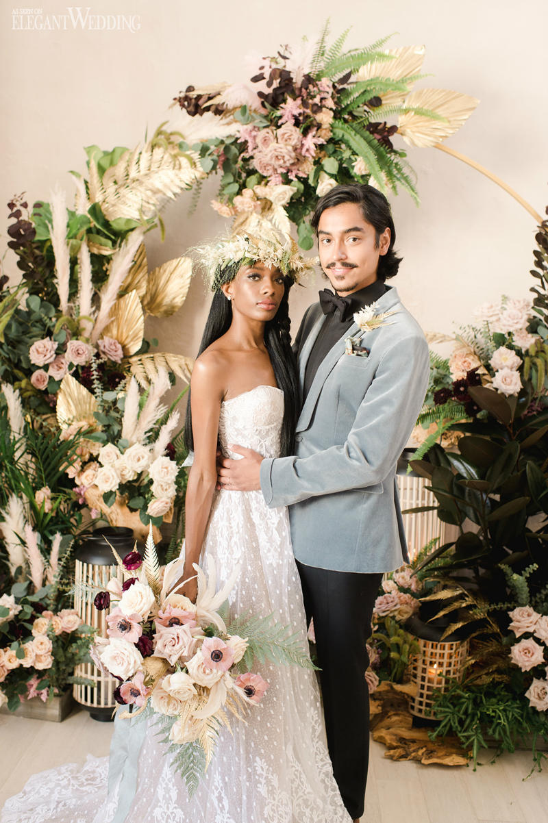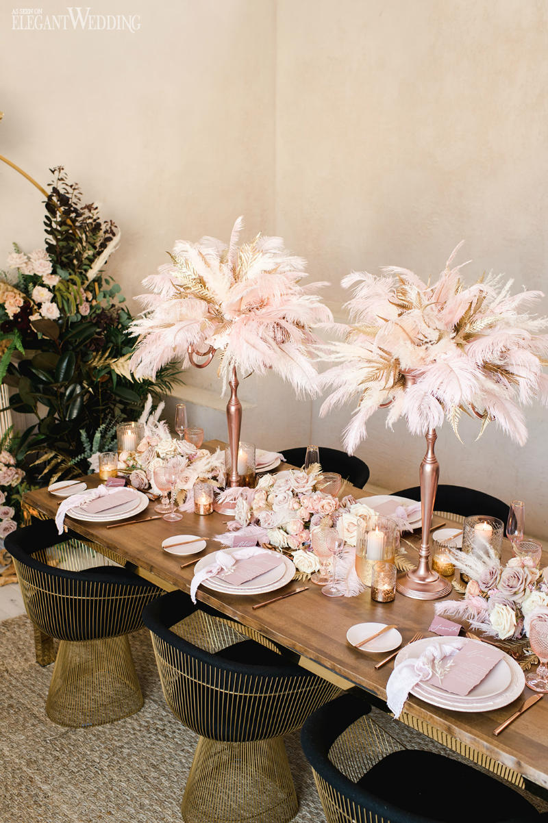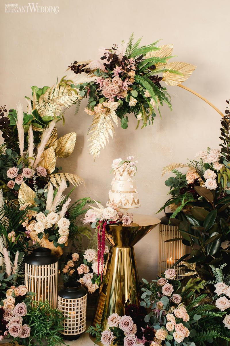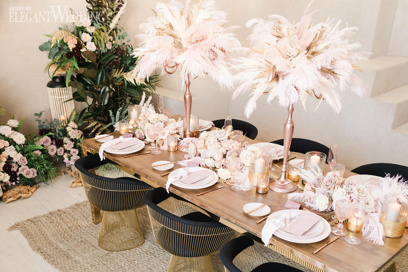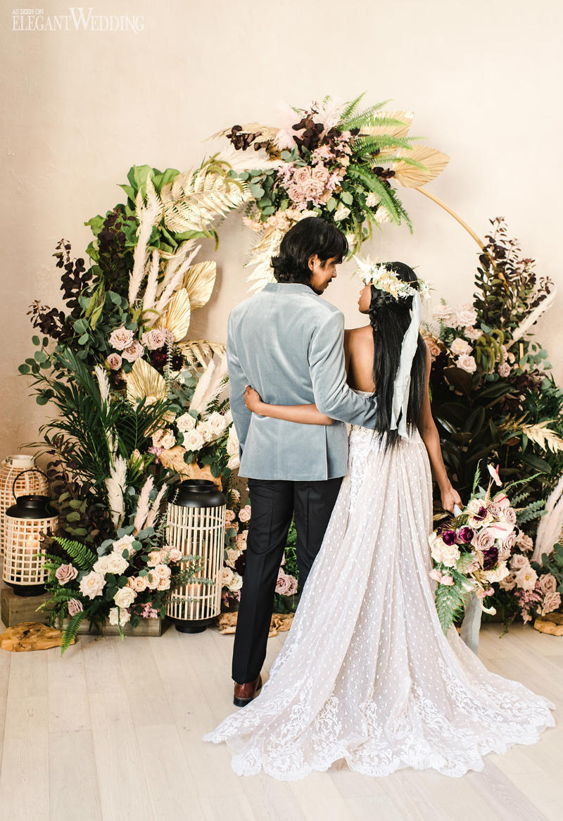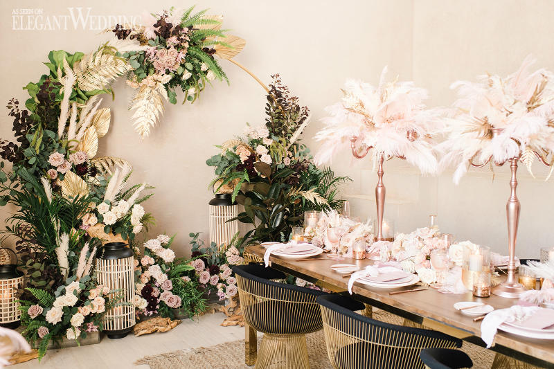 Boho weddings have become quite the trend as of late. The airy, nature vibe is beyond picturesque. The team was able to elevate this stunning theme through florals, candles, gorgeous gowns, intricate suits, and a mix of wood and glam for the table and chairs. The florals used for the opulent table setting was a mix of blush pampas grass, ostrich feathers, and preserved ferns. The circular arch was a combination of plants and flowers, including pampas grass, preserved ferns, and plants of fiddle figs, majesty palms, rubber trees, and ferns.