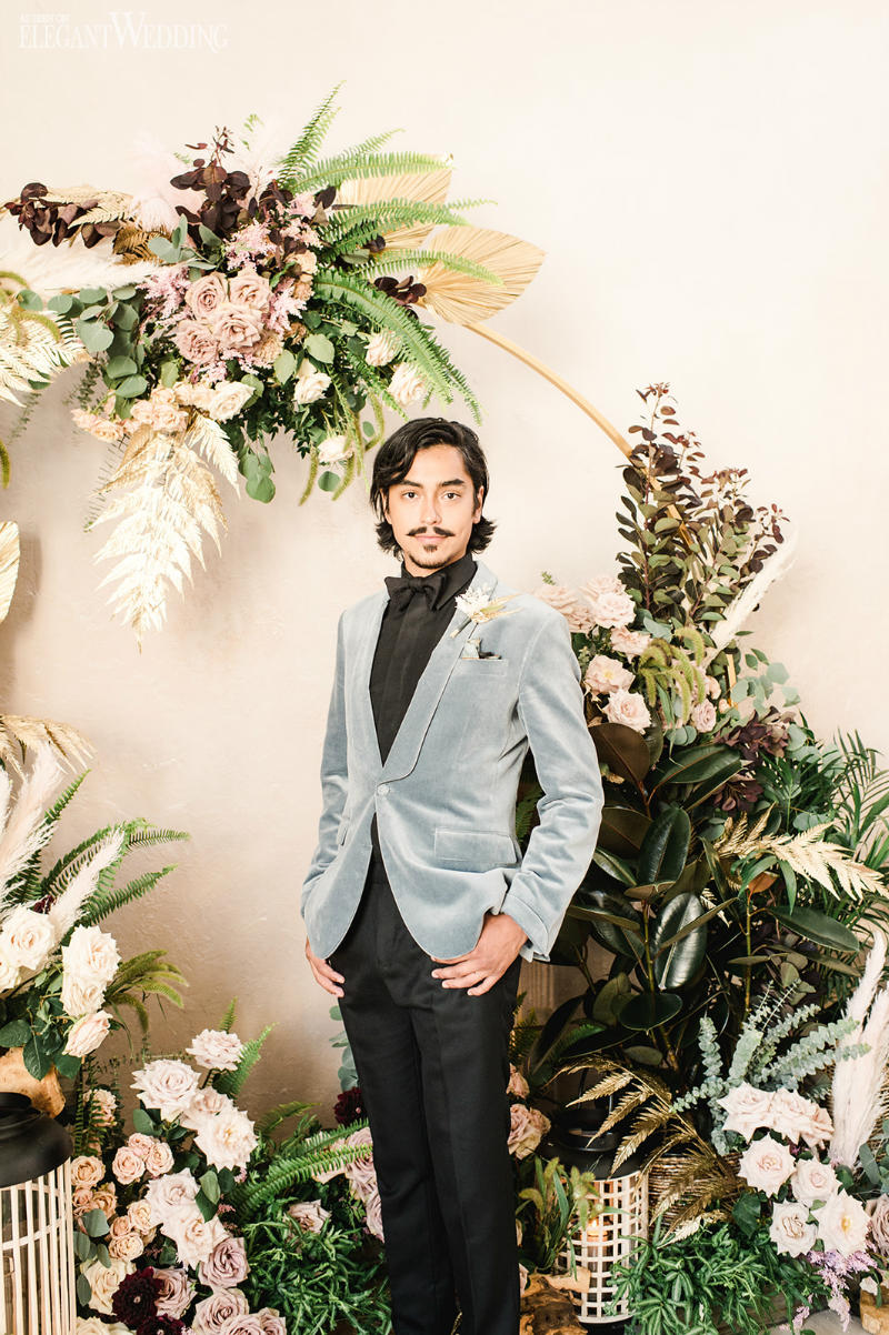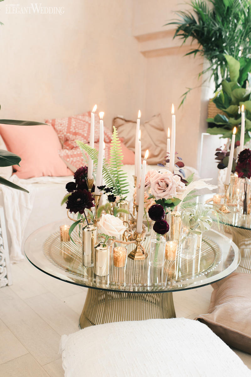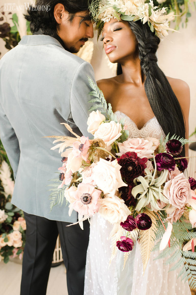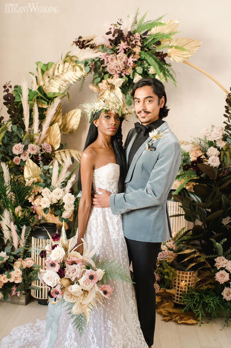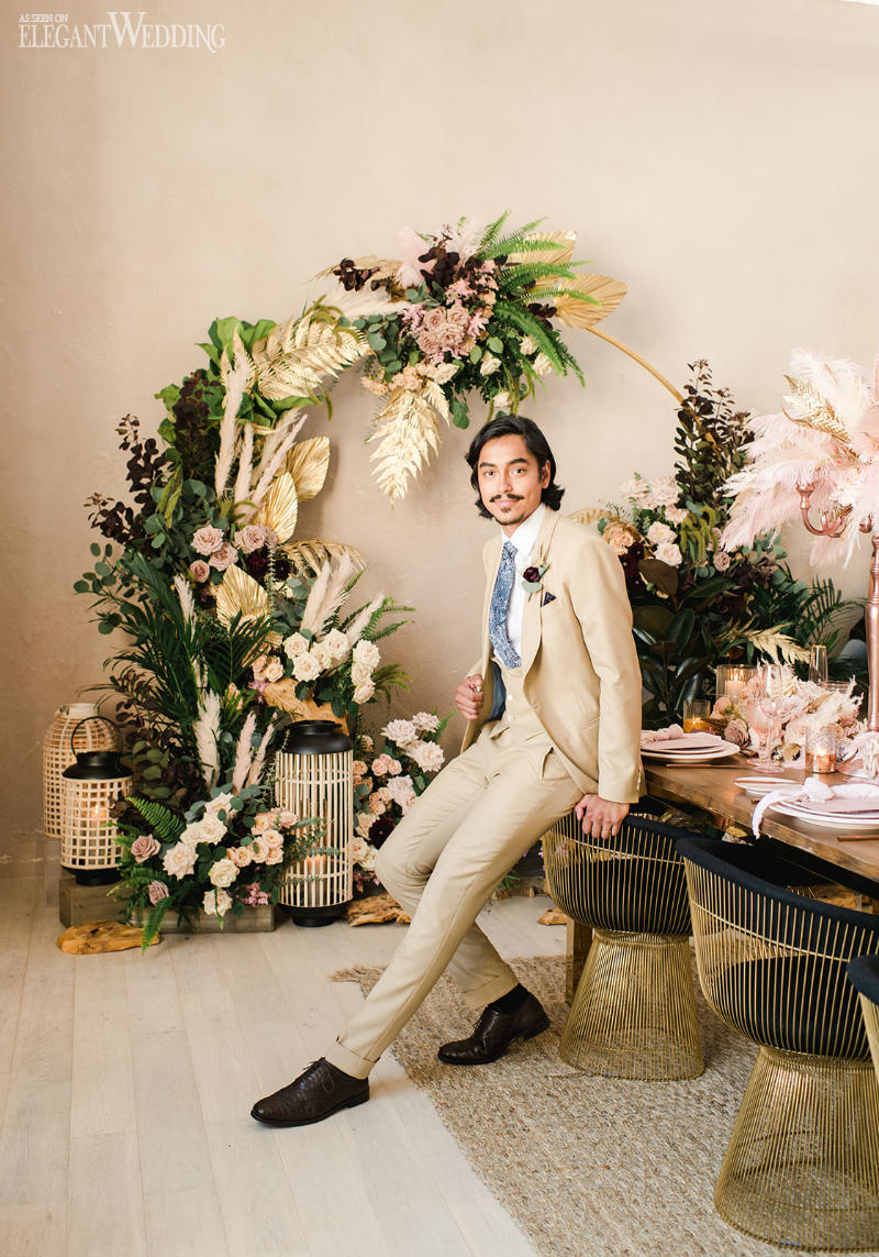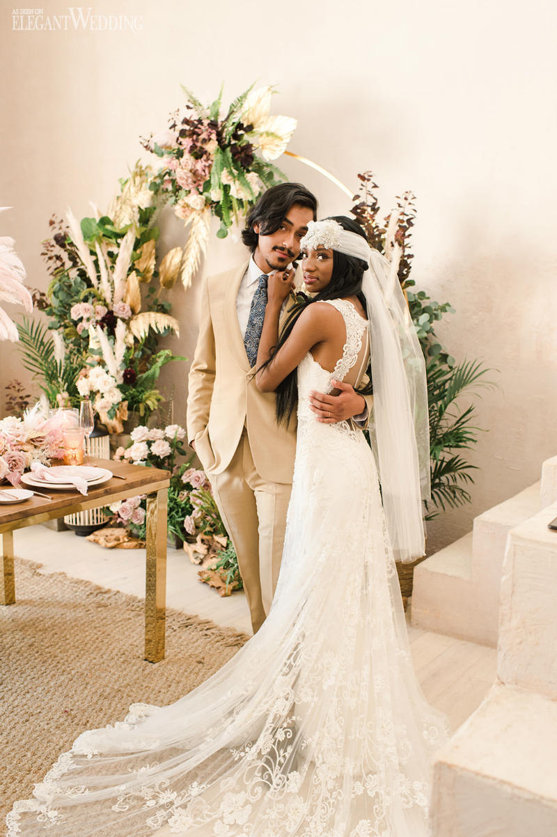 Boho weddings have become quite the trend as of late. The airy, nature vibe is beyond picturesque. The team was able to elevate this stunning theme through florals, candles, gorgeous gowns, intricate suits, and a mix of wood and glam for the table and chairs. The florals used for the opulent table setting was a mix of blush pampas grass, ostrich feathers, and preserved ferns. The circular arch was a combination of plants and flowers, including pampas grass, preserved ferns, and plants of fiddle figs, majesty palms, rubber trees, and ferns.