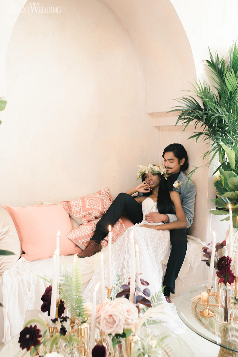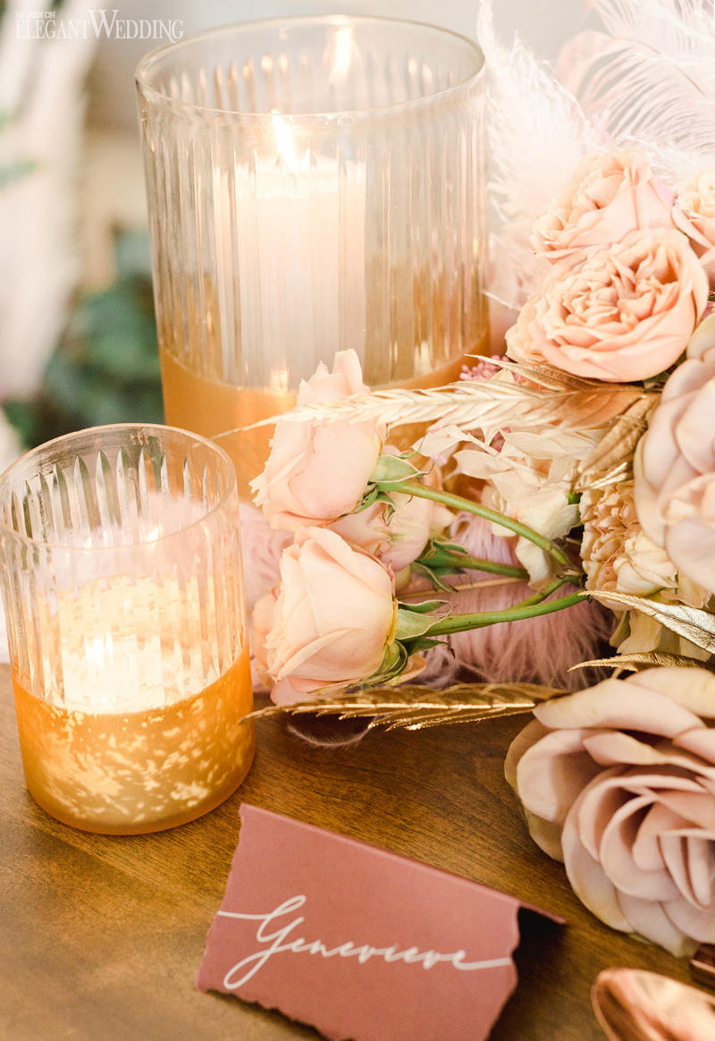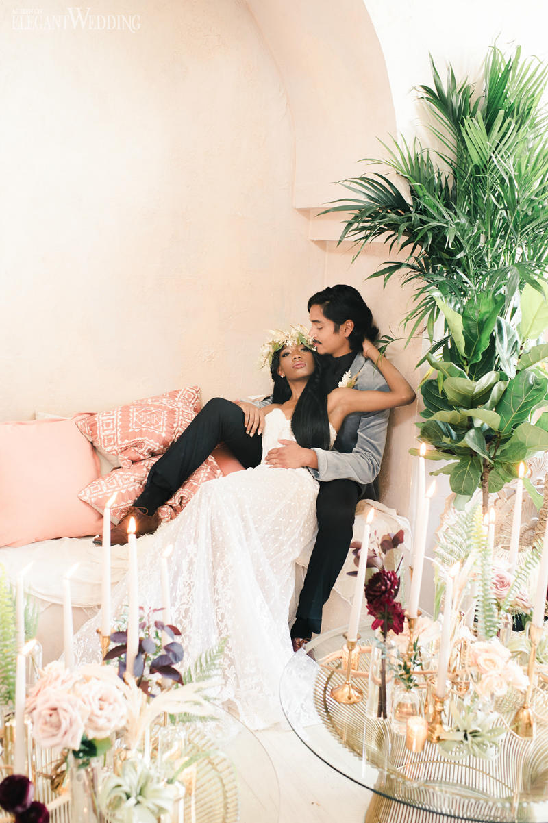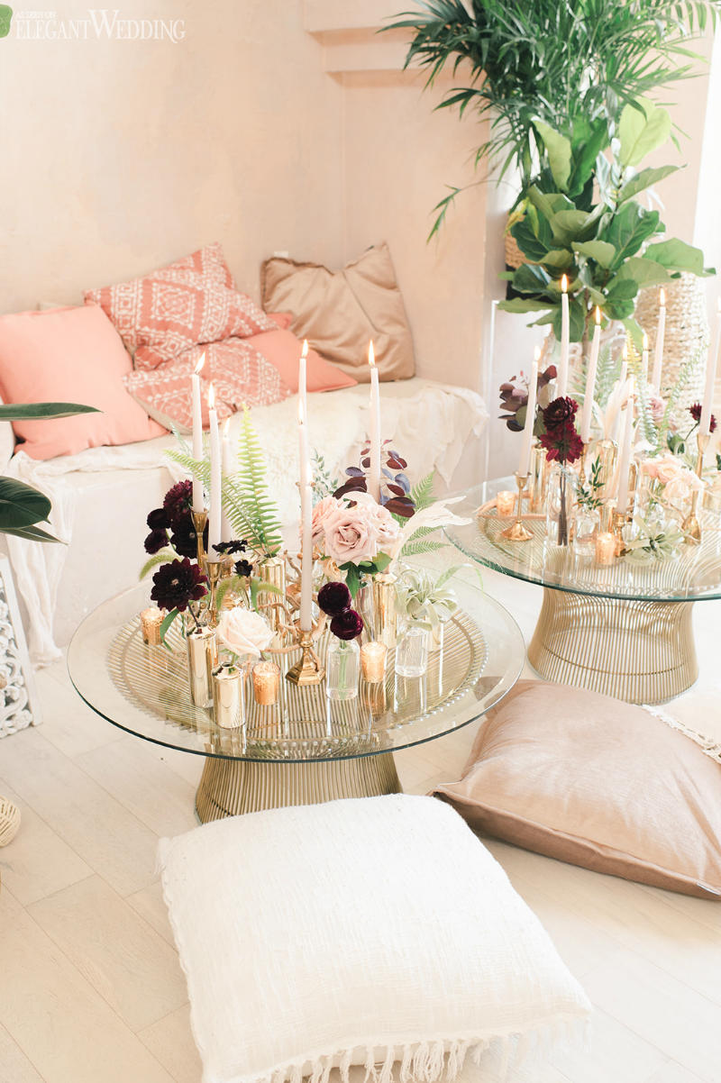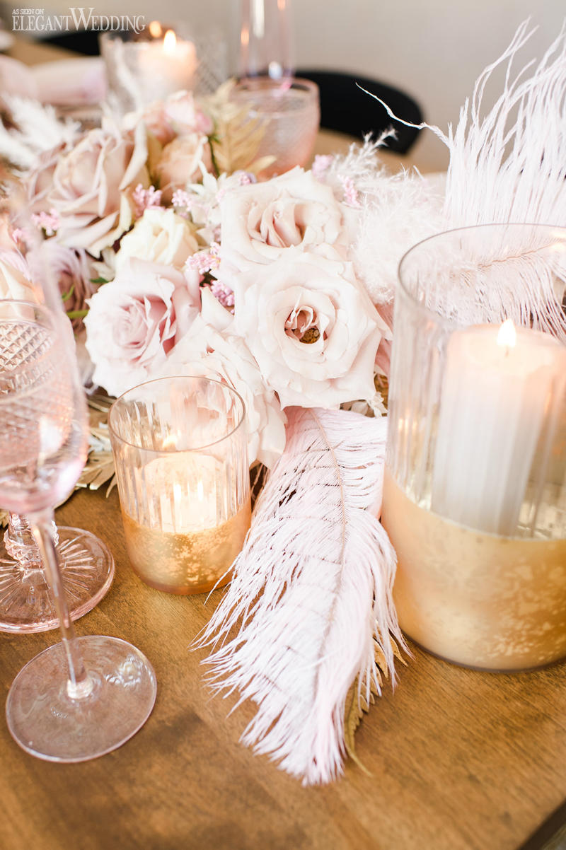 Boho weddings have become quite the trend as of late. The airy, nature vibe is beyond picturesque. The team was able to elevate this stunning theme through florals, candles, gorgeous gowns, intricate suits, and a mix of wood and glam for the table and chairs. The florals used for the opulent table setting was a mix of blush pampas grass, ostrich feathers, and preserved ferns. The circular arch was a combination of plants and flowers, including pampas grass, preserved ferns, and plants of fiddle figs, majesty palms, rubber trees, and ferns.