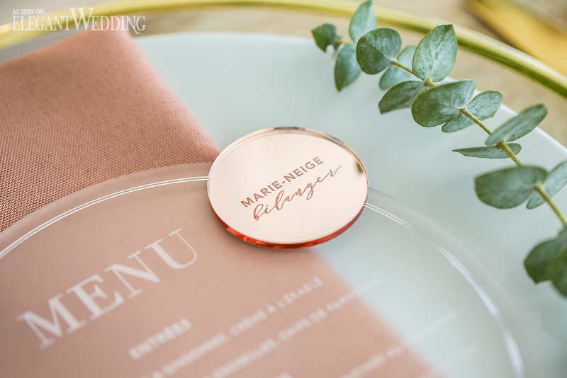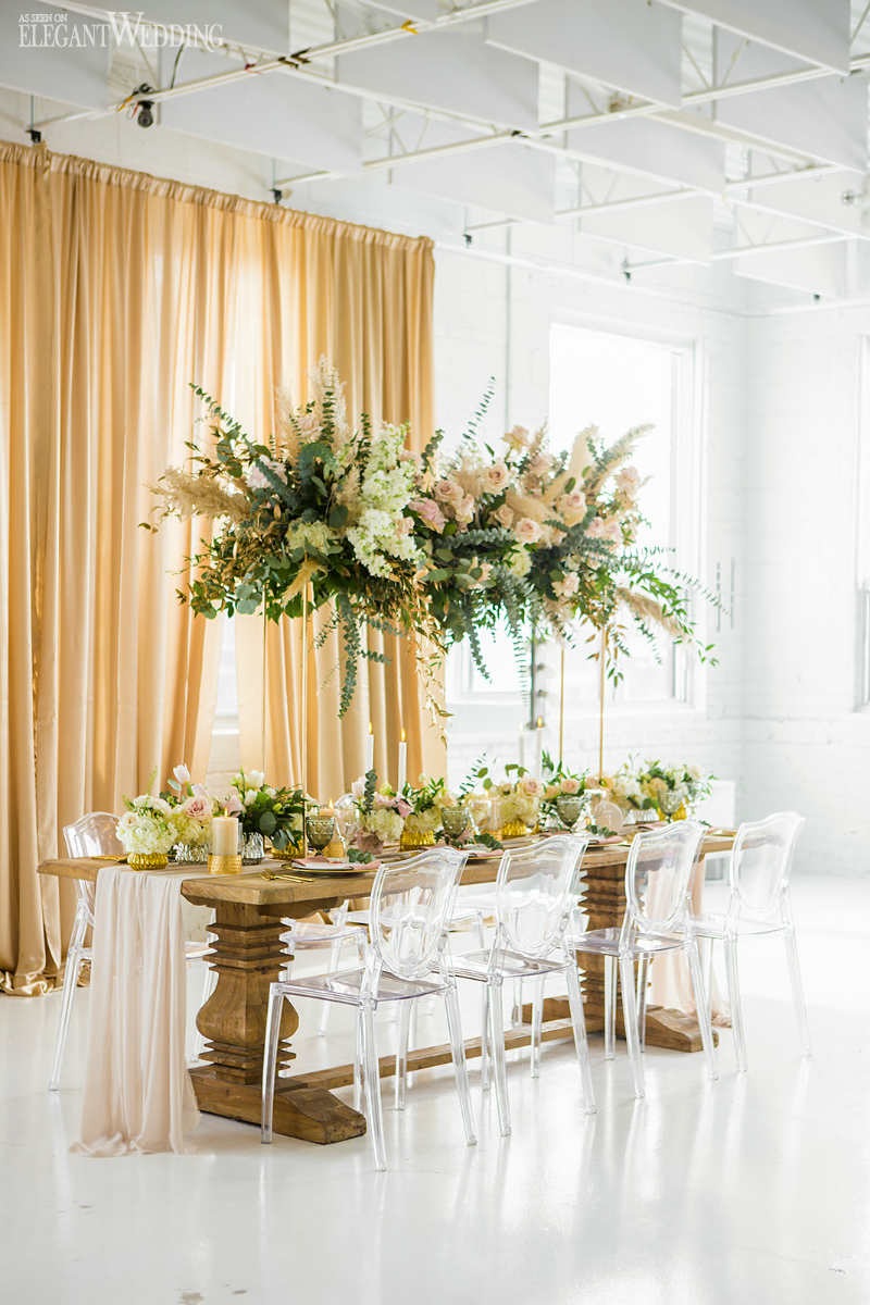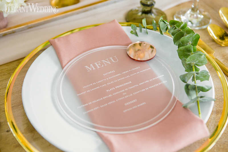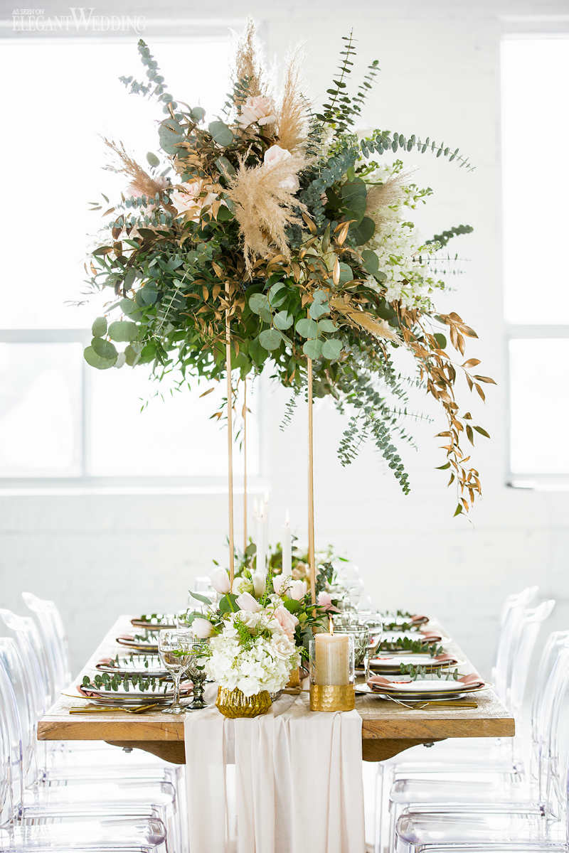 The floral design composed of lots of green foliage but with a touch of roses, blush and cream color; eucalyptus flowers and pampas grass stems to accentuate the magical and exotic side of the decor. The goal was to recreate a glamorous and vintage universe while remaining close to nature. A natural wooden table to get closer to the rustic, natural aspect and transparent chairs to bring forward the modern aspect. A mixture of texture always gives character to any wedding. Don’t be afraid to mix and match, the results can be stunning.