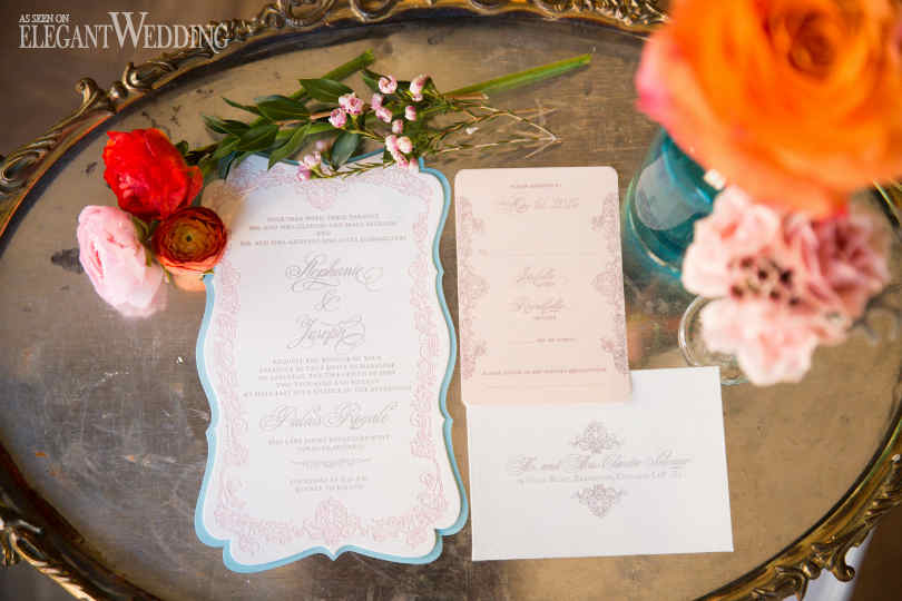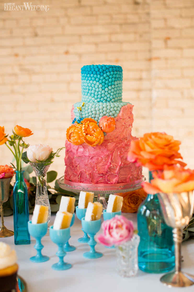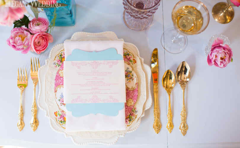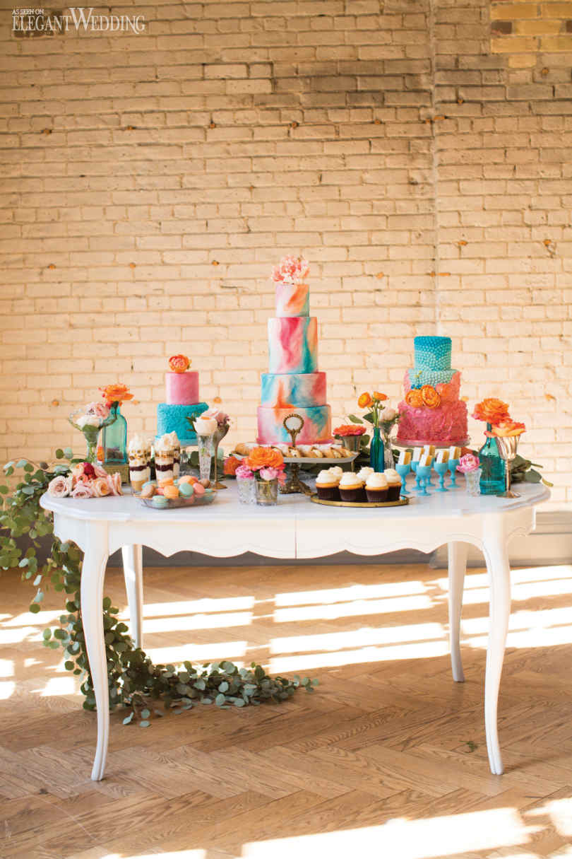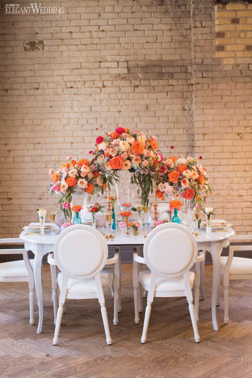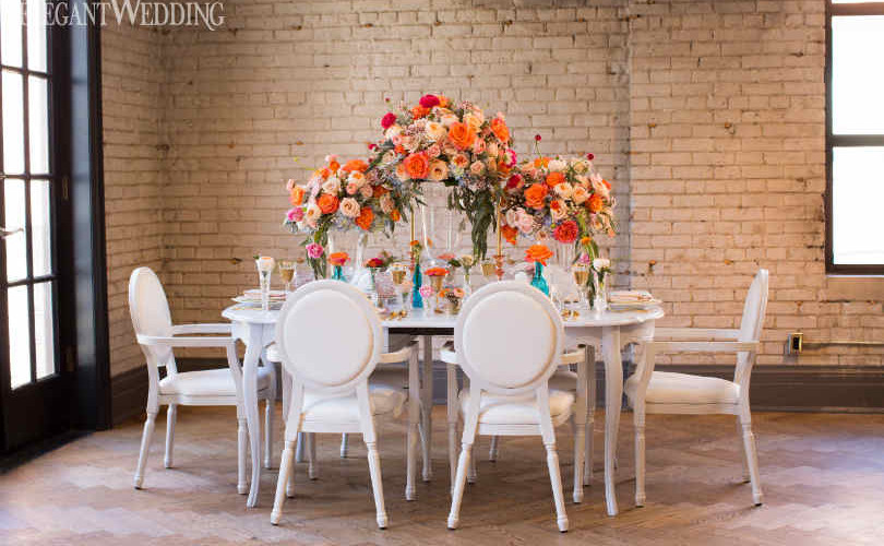 This “ Bohemian Princess ” style shoot marries the colours of the rainbow with life in the forest. Wherever there’s a hue of orange, blue or pink, there’s a hint of wildlife. Whether sprouting from the sweet table, draping from the drink cart or outlining the invitations, greenery finds a way to makes its presence known. Create exquisite centrepieces by picking surrounding furniture that has minimal detail. Let the flowers speak for themselves. Place them in vases that won’t take away any attention. The way these flowers have been arranged – with the stems cut short – make the vases appear to be empty, only they are cleverly resting on top.