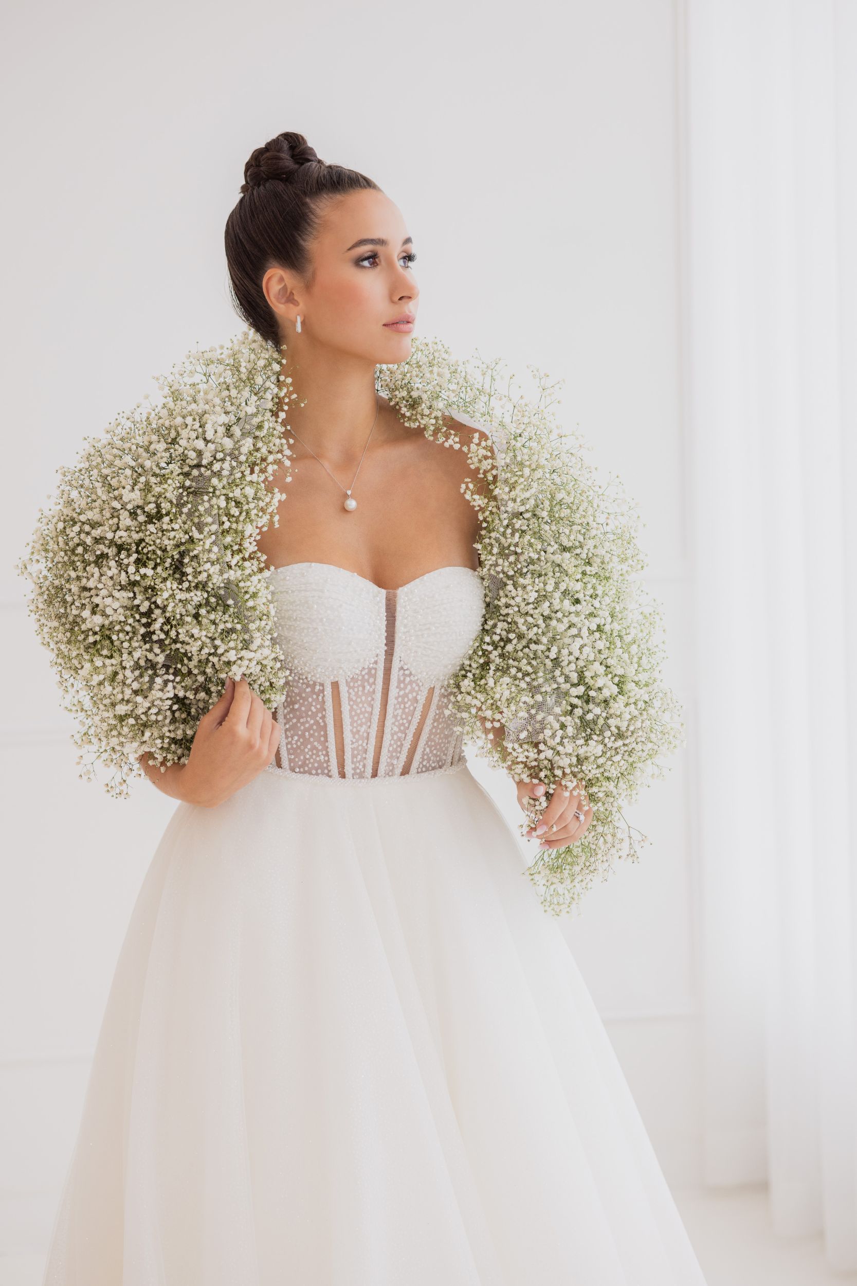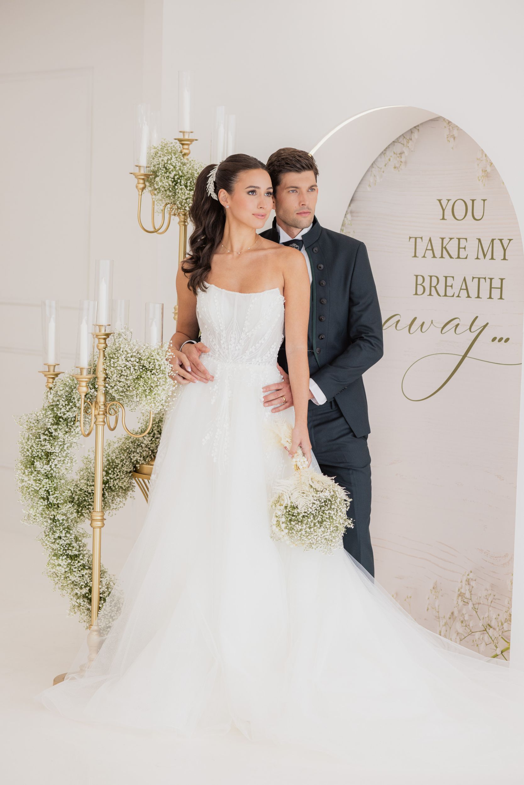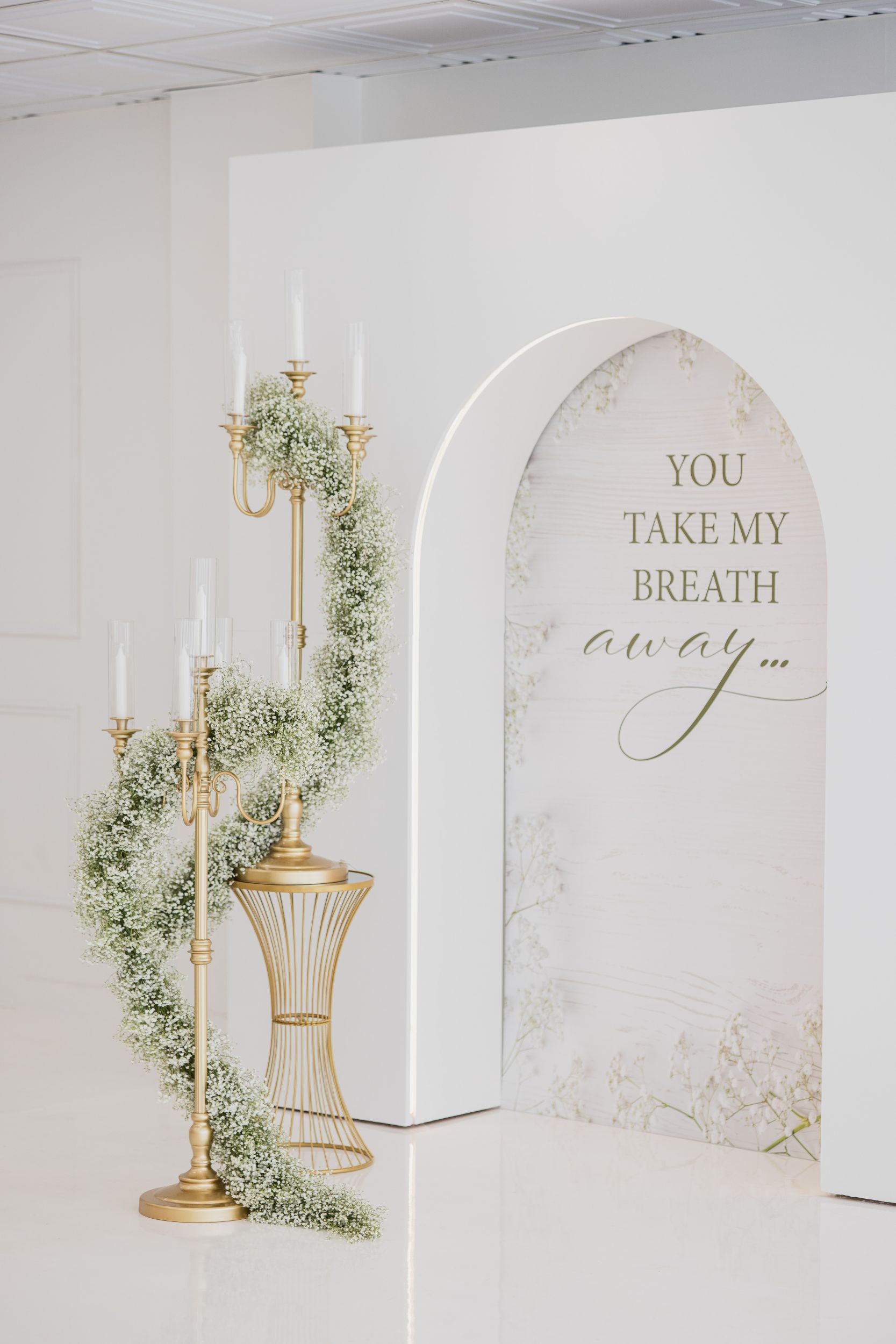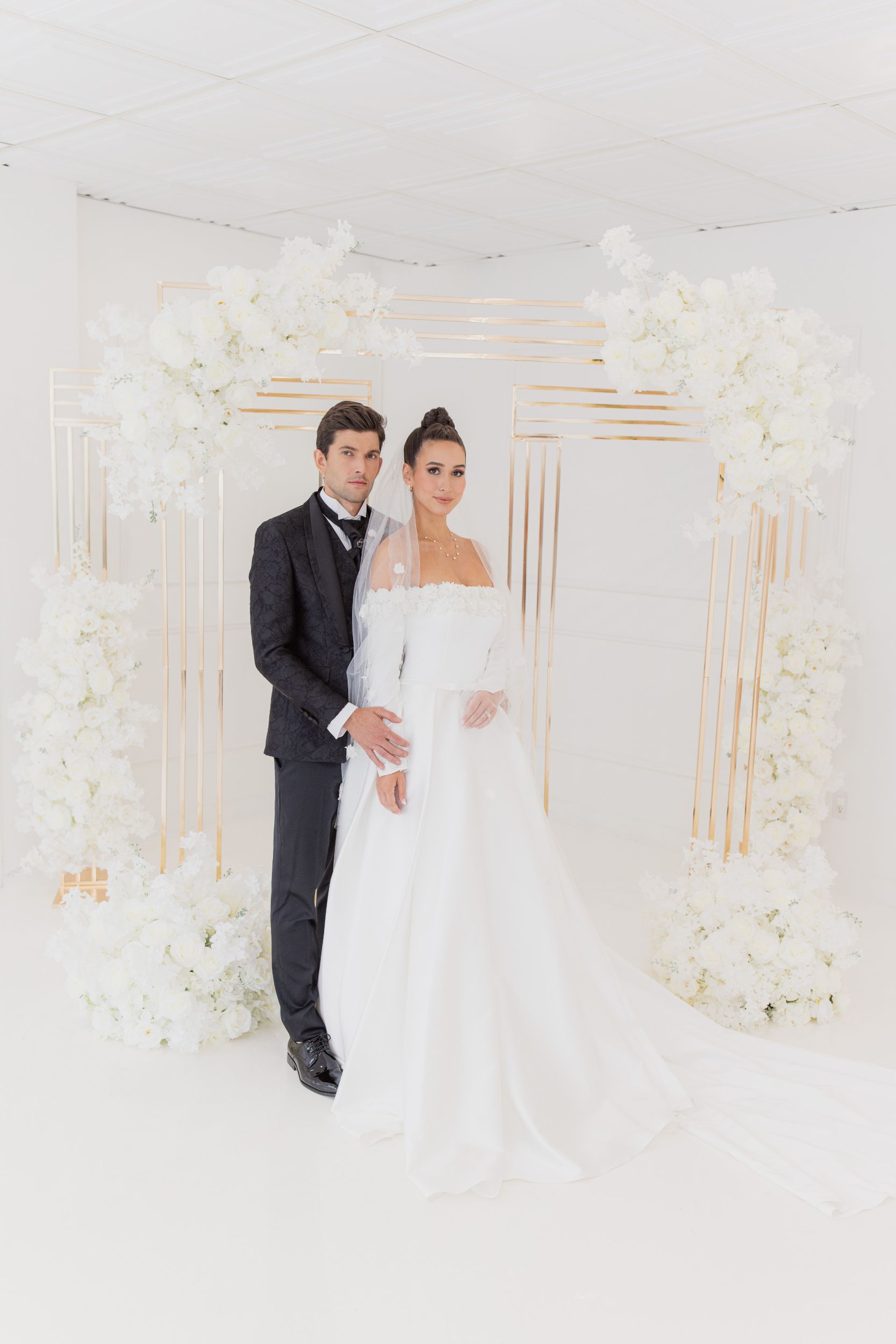 For this stunning editorial feature, we embraced the delicate beauty of baby’s breath, using its airy blooms to craft an atmosphere of elegance and whimsy. Cascading floral installations and cloud-like arrangements set the scene, complementing a refined palette of soft neutrals and gold accents.