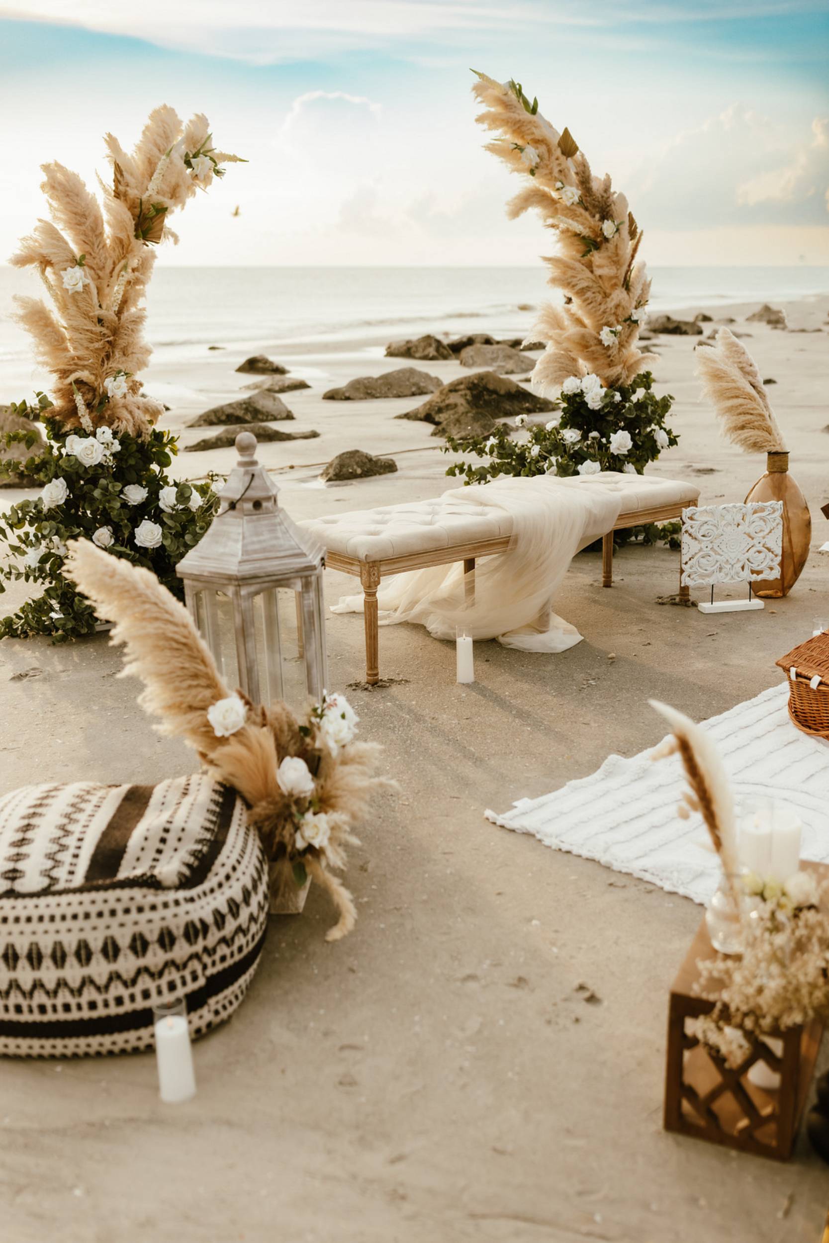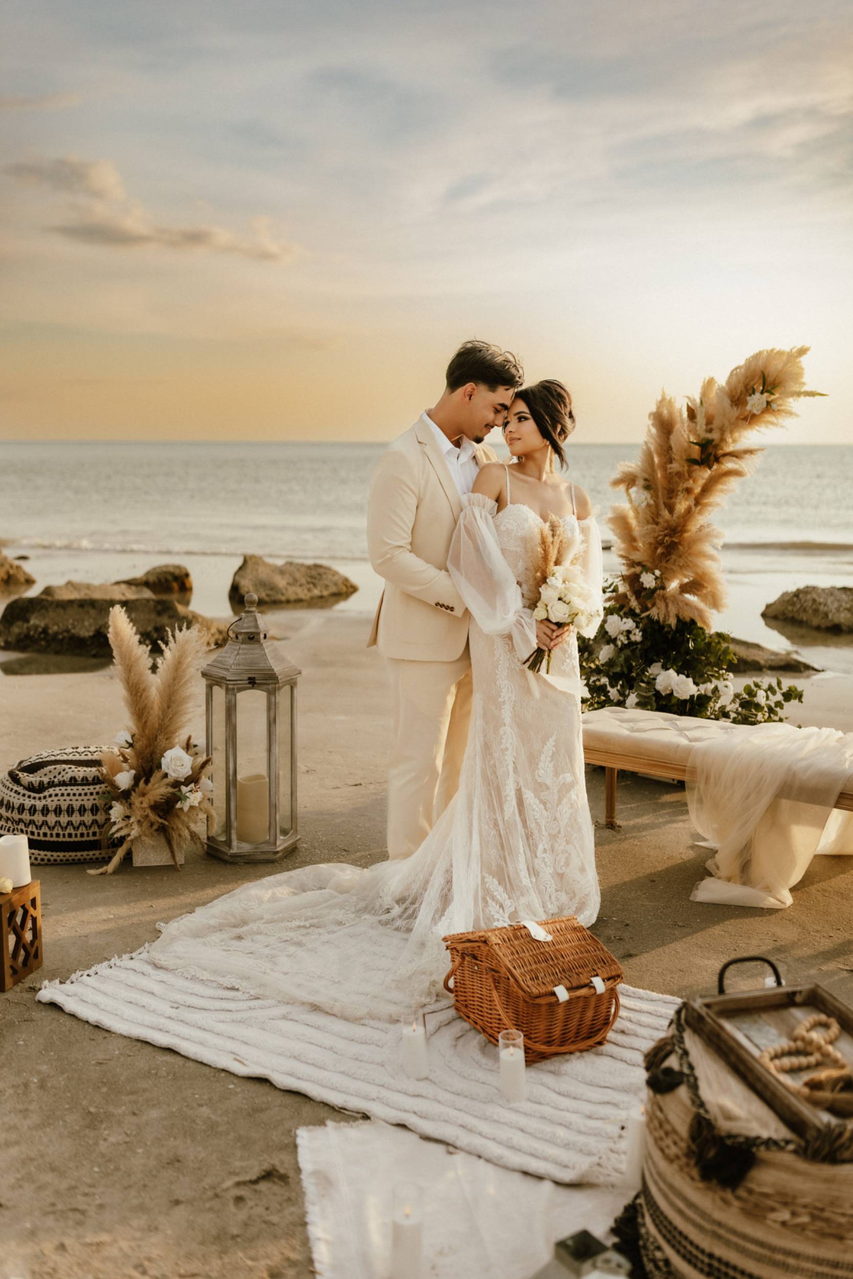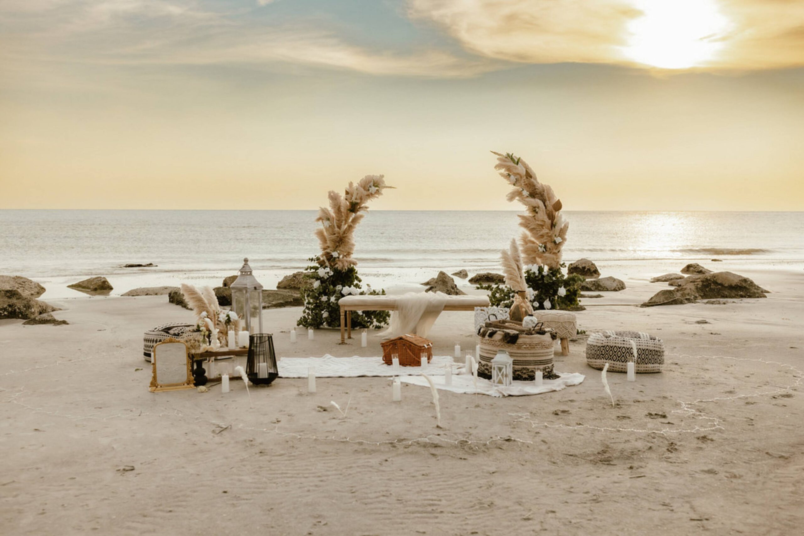 This stunning setup is the epitome of simple elegance, where natural elements like pampas grass, soft whites, and beige tones harmonize beautifully with the golden hues of a beach sunset. Imagine exchanging vows surrounded by this serene atmosphere, where every detail feels both intimate and timeless.