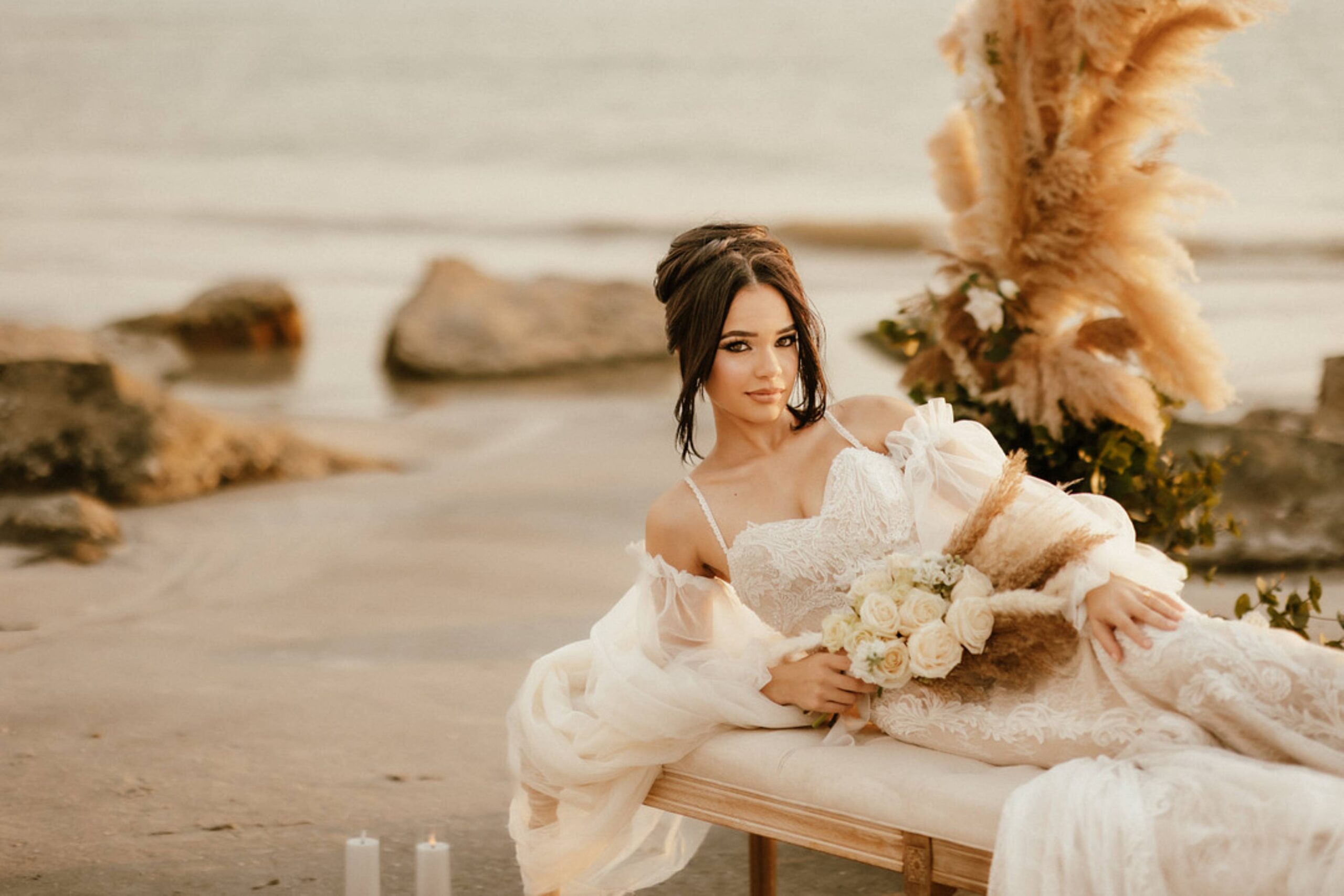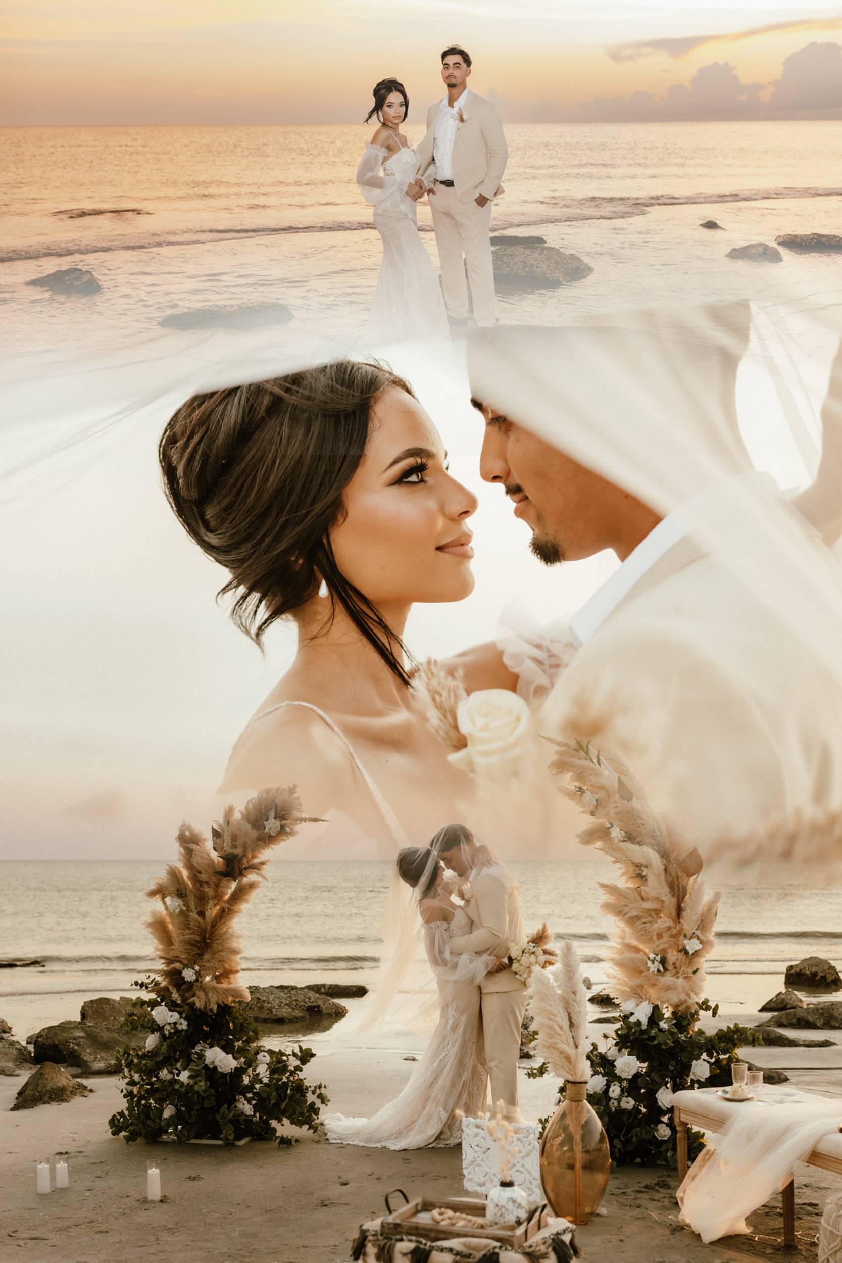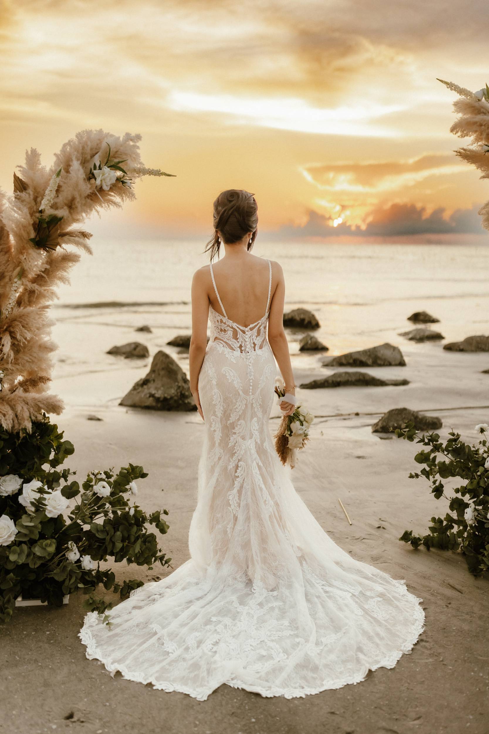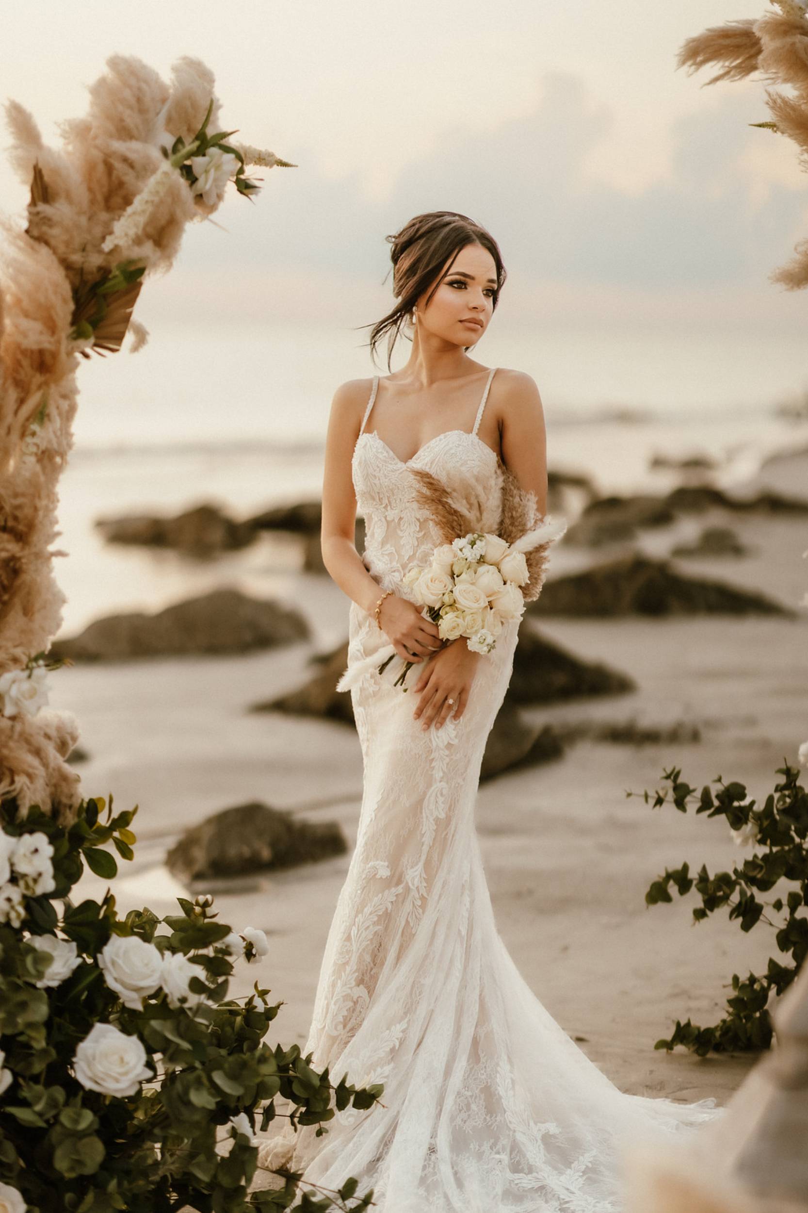 This stunning setup is the epitome of simple elegance, where natural elements like pampas grass, soft whites, and beige tones harmonize beautifully with the golden hues of a beach sunset. Imagine exchanging vows surrounded by this serene atmosphere, where every detail feels both intimate and timeless.