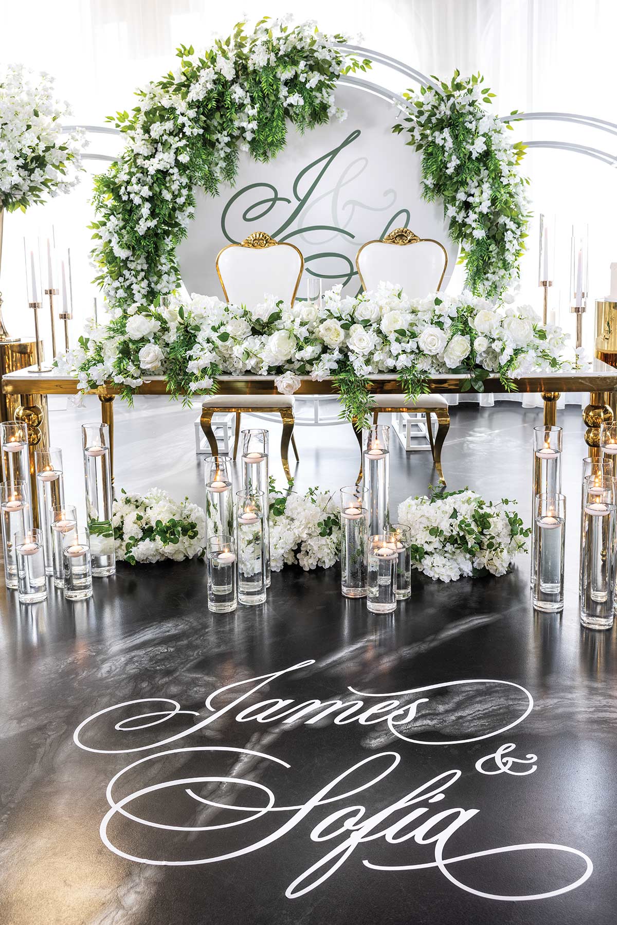 Imagine walking into a venue adorned with cascading greenery and delicate white florals, just like the lush arch framing the couple. The simplicity of white paired with vibrant green foliage brings nature’s beauty indoors, creating a fresh and romantic ambiance. Tables set with gold accents, soft candlelight, and ivory blooms elevate the sophistication while maintaining a natural charm.
