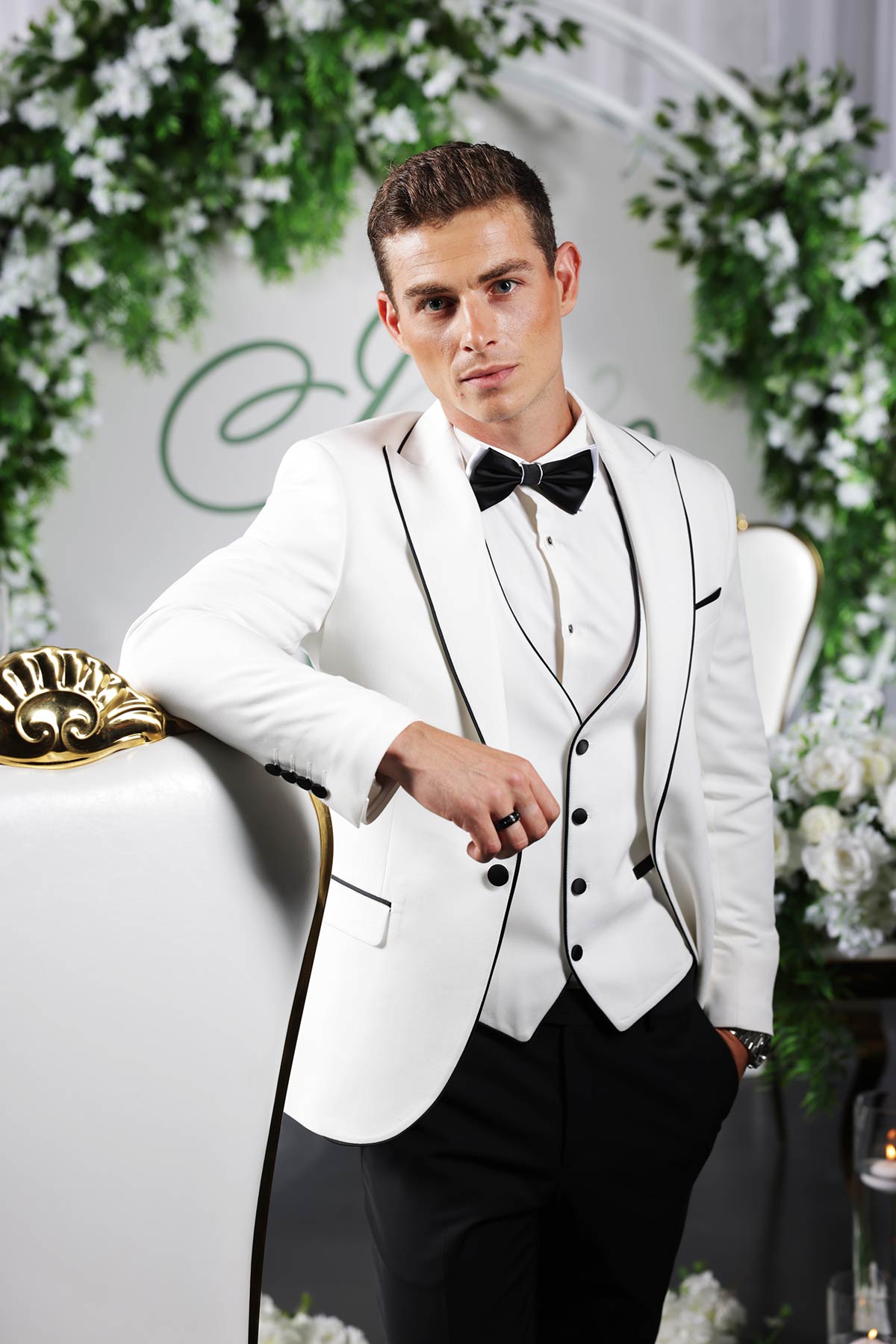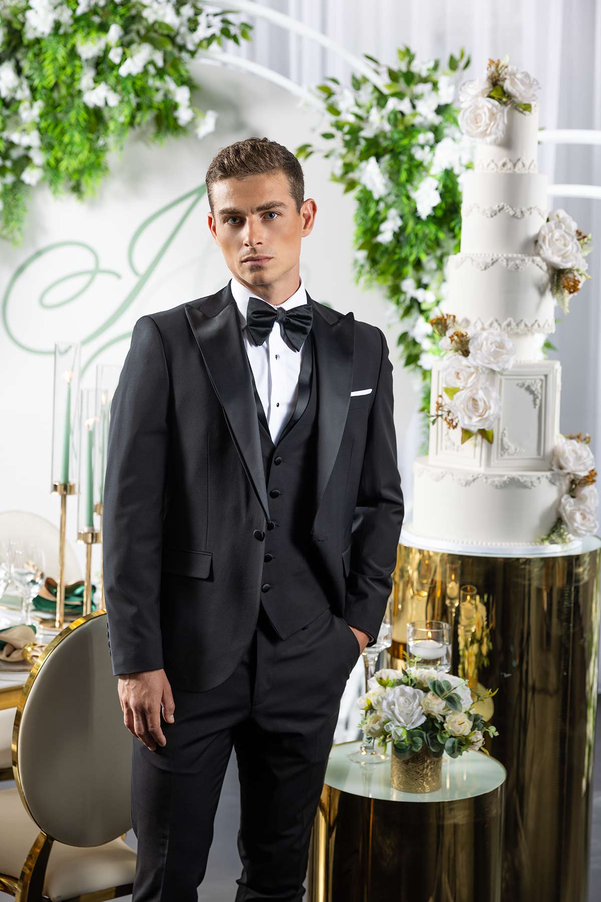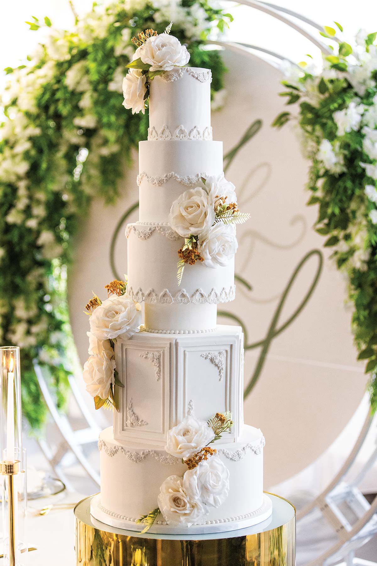 The bride’s stunning lace gown and the groom’s sharp black tuxedo add a modern touch to this timeless palette. And let’s not forget the jaw-dropping cake adorned with intricate white roses—a true centerpiece that ties the theme together seamlessly.