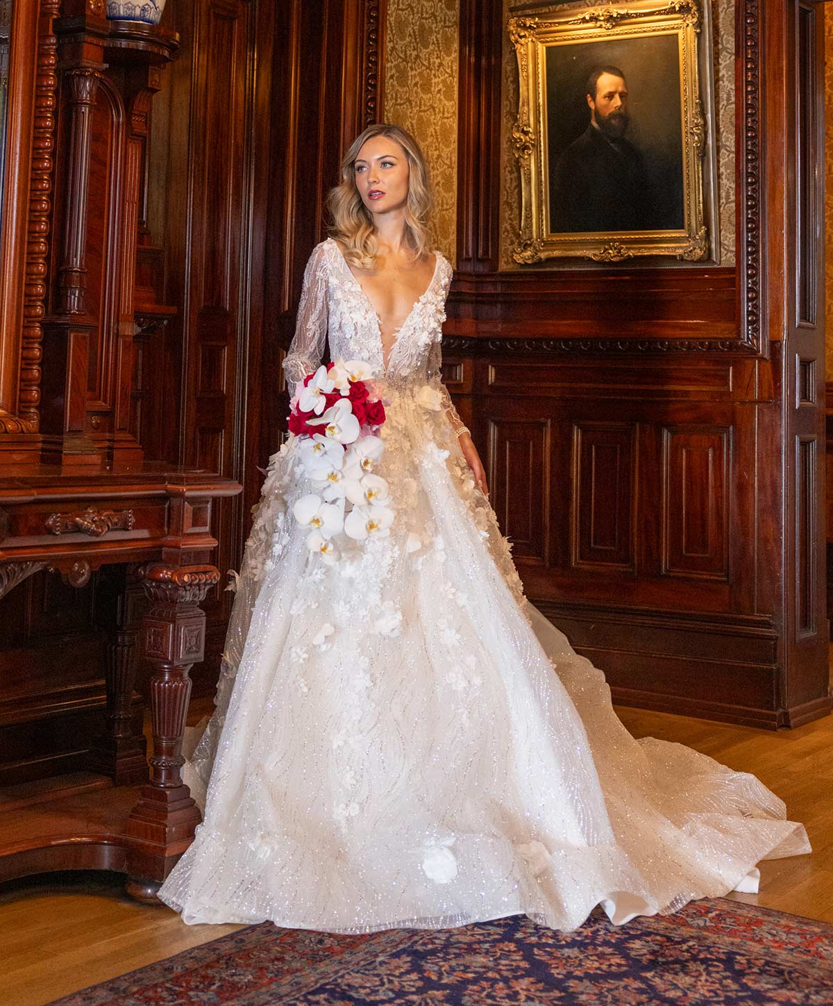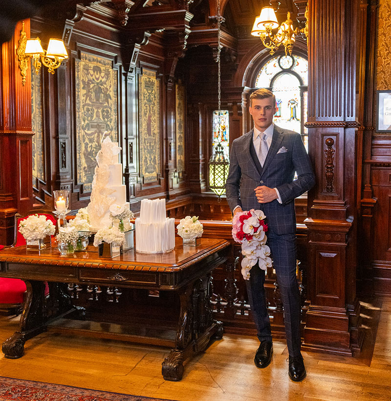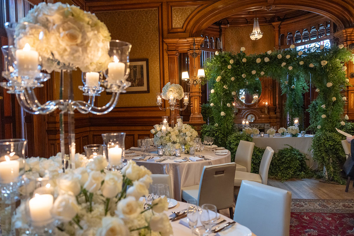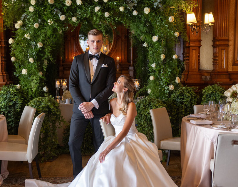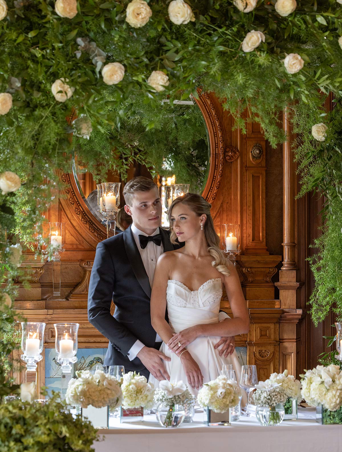 As for the venue, it was adorned with gorgeous florals crafted by the talented Alain Simon Fleurs. Lush arrangements of roses, greenery, and delicate blooms seamlessly transformed the space into a romantic haven. Each floral detail further enhanced the venue’s historic charm, creating a dreamlike atmosphere for the couple and their guests to enjoy.