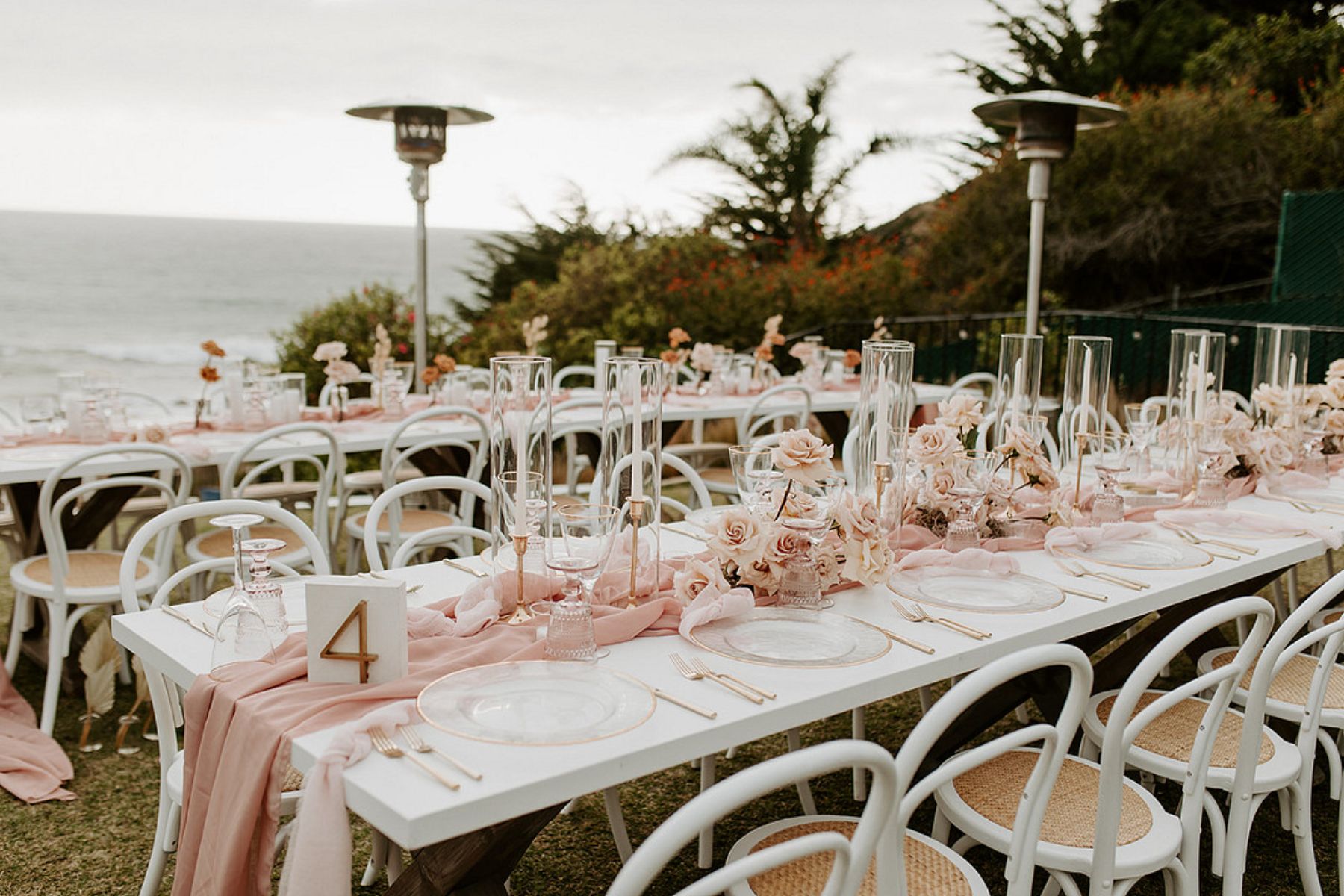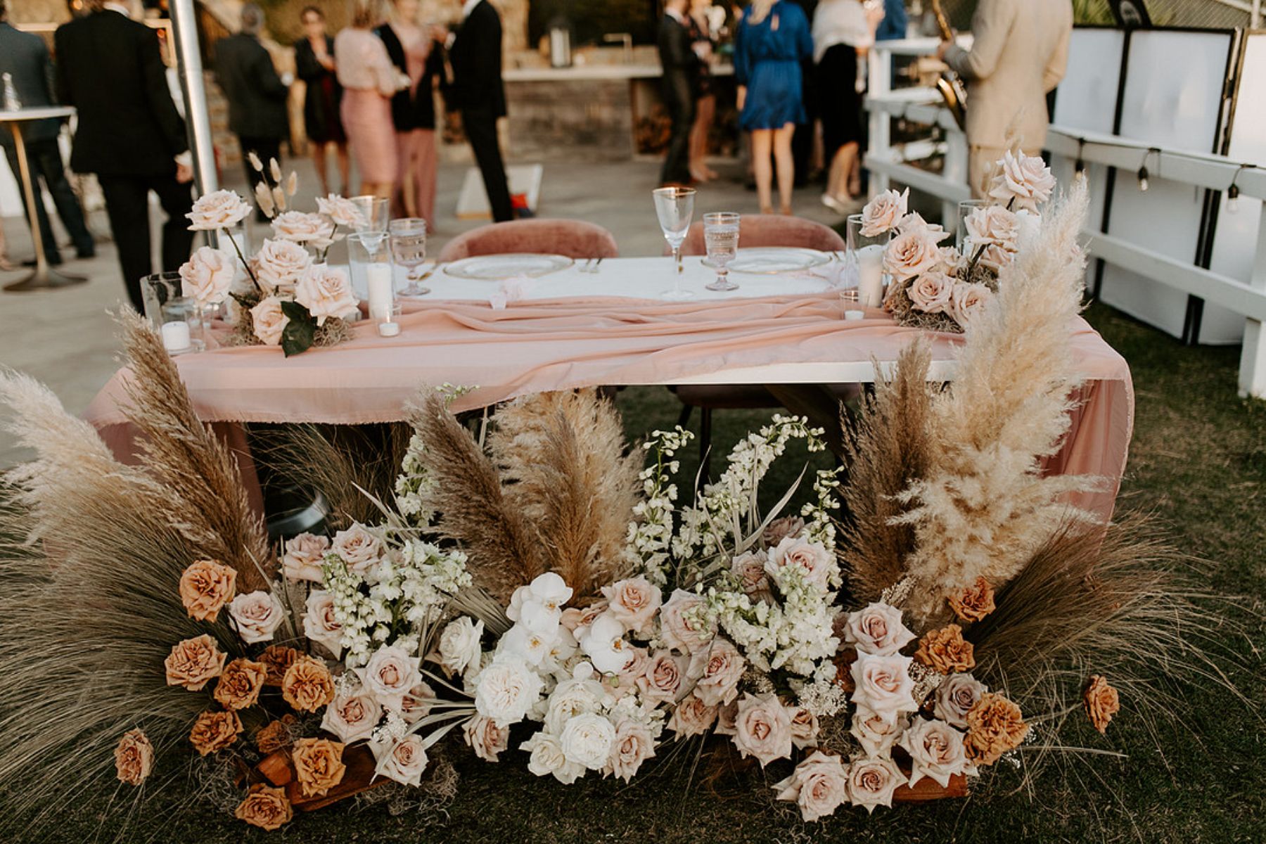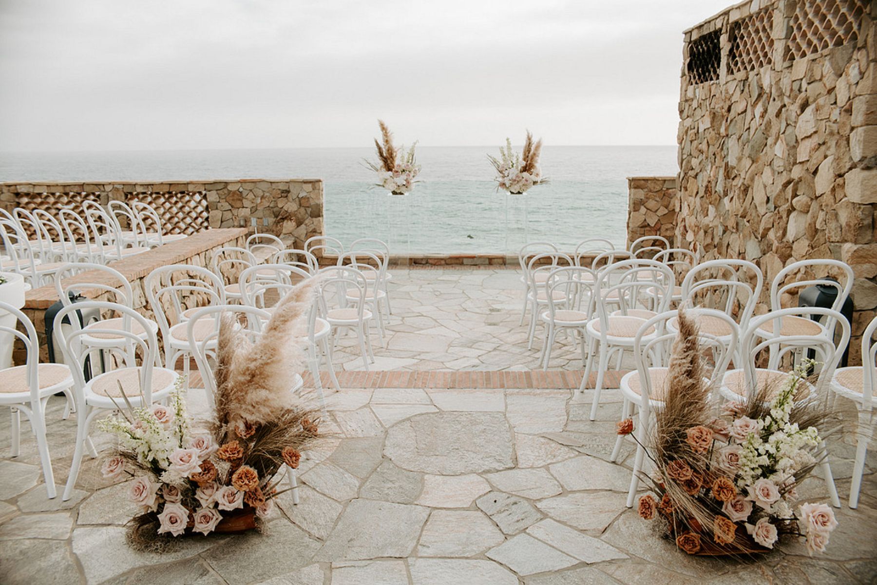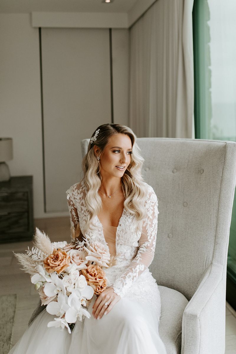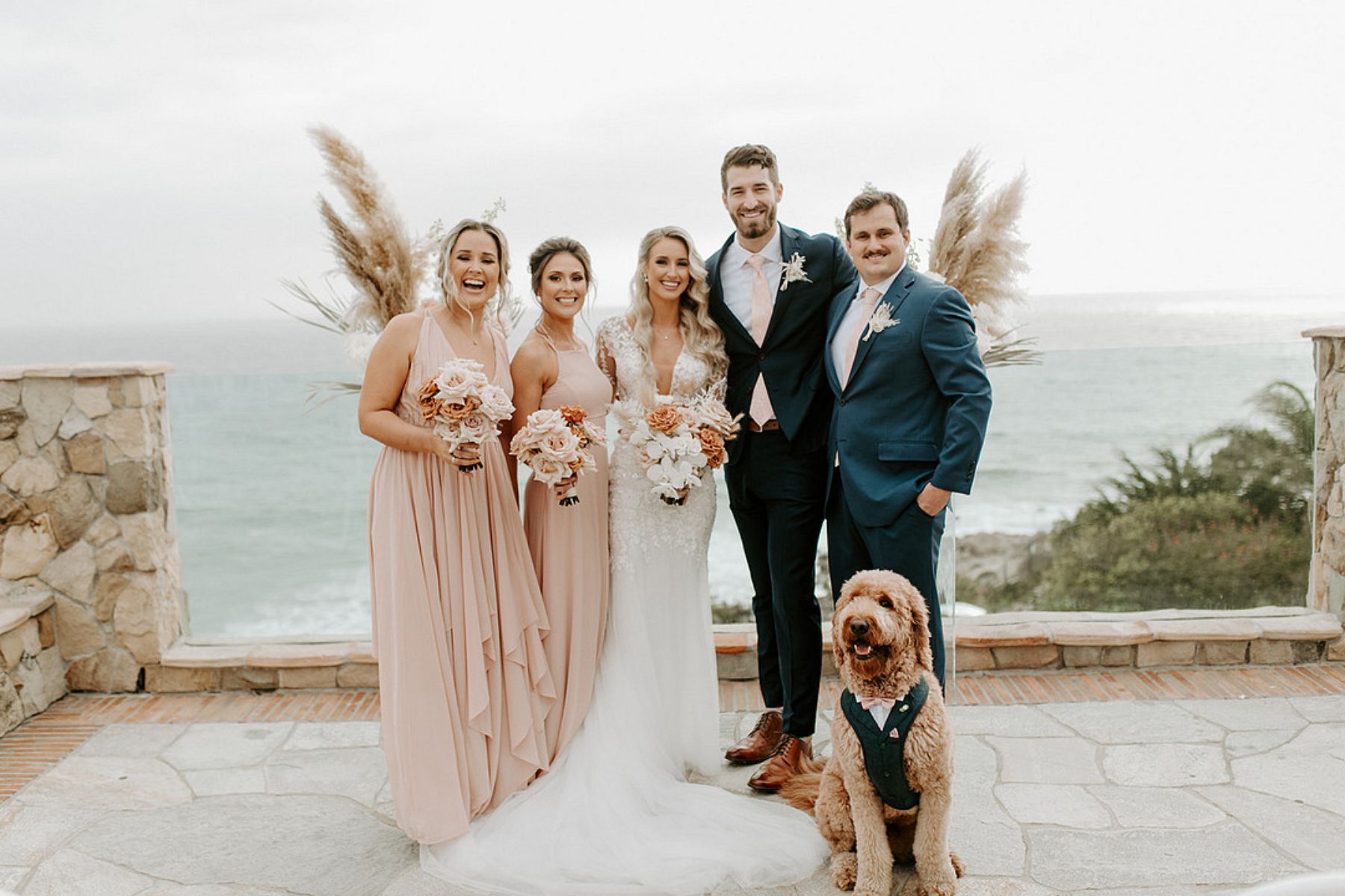 The coastal setting spoke for itself, so décor was kept simple and elegant with soft blush tones, acrylic details, and floral arrangements that transitioned seamlessly from ceremony to reception. The bride carried a bouquet of blush and toffee roses, orchids, and pampas grass, while the groom looked sharp in his custom-tailored suit.