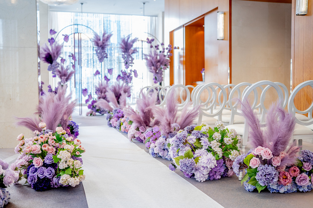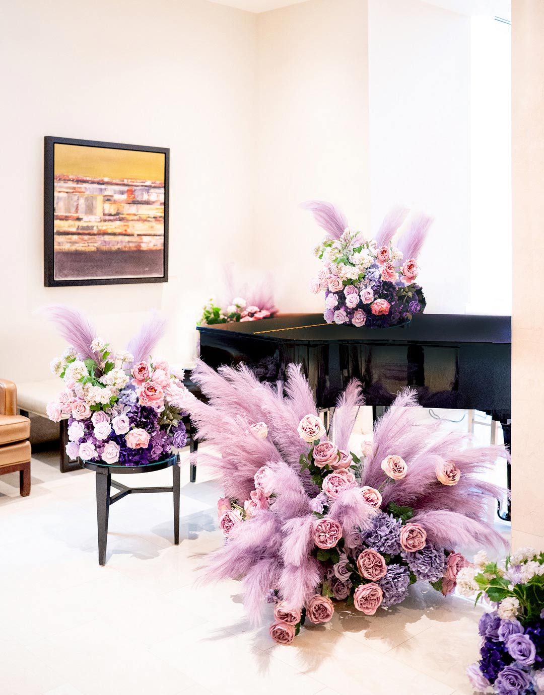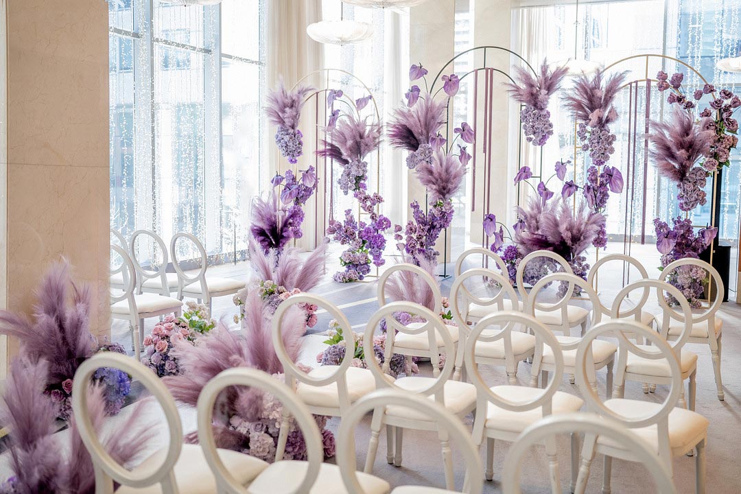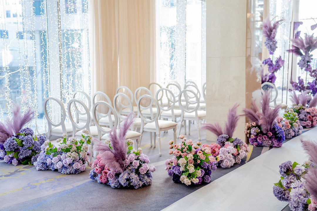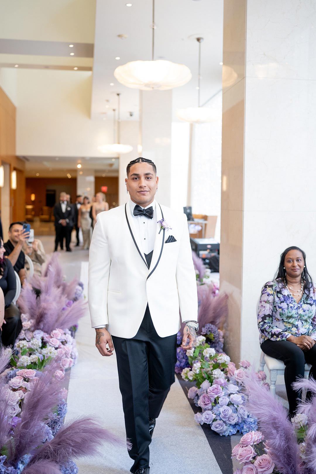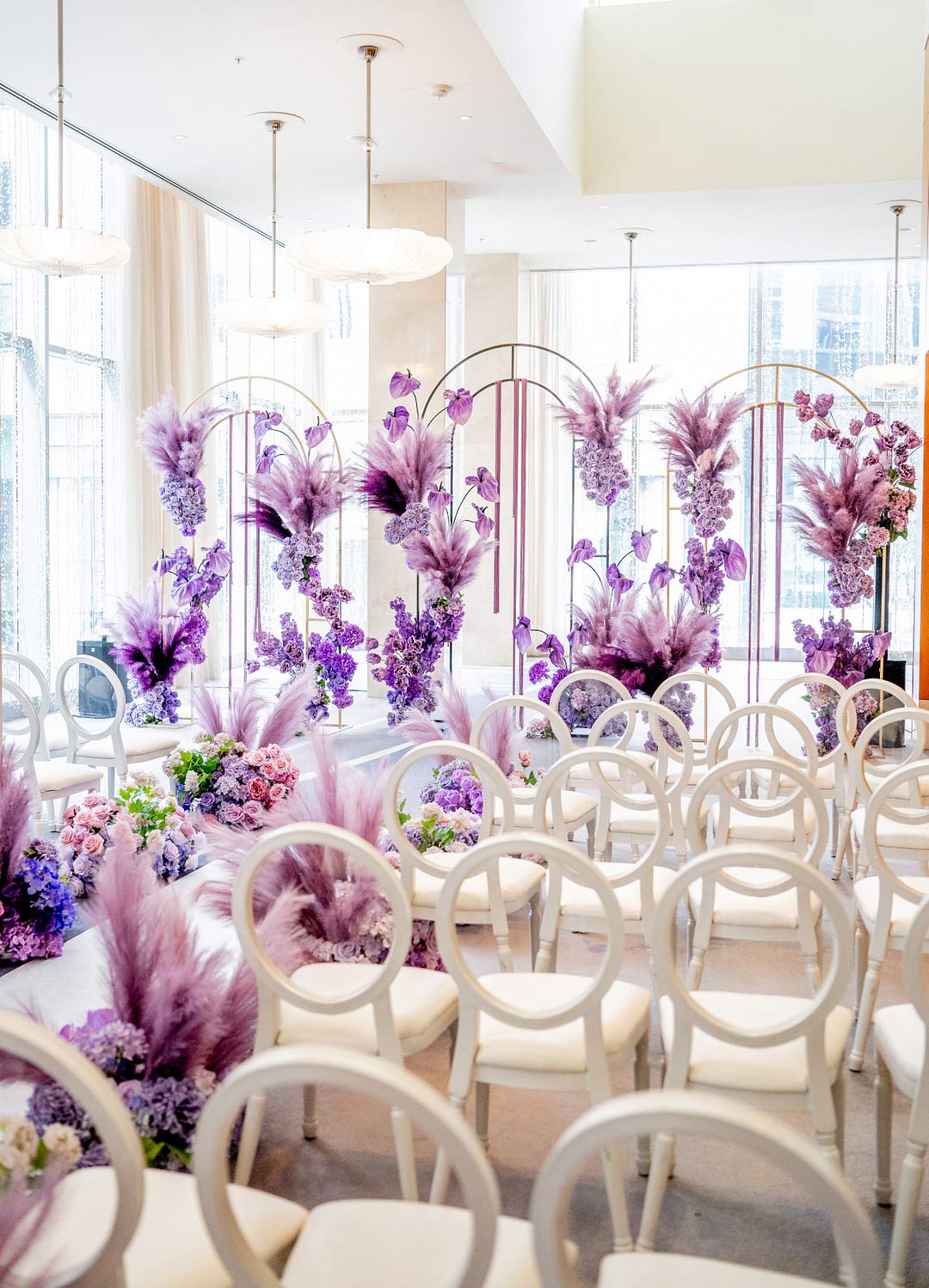 The ceremony took place in front of expansive floor-to-ceiling windows, where natural light poured in and florals bloomed in lush, opulent arrangements. The bride and groom, styled in sophisticated attire that reflected classic glamour, radiated joy and confidence. The groom’s four brothers, serving as groomsmen, wore jeweled music notes on their lapels in place of traditional boutonnieres, while the bridesmaids each wore delicate wrist corsages—thoughtful details that added a personal touch to the overall aesthetic.