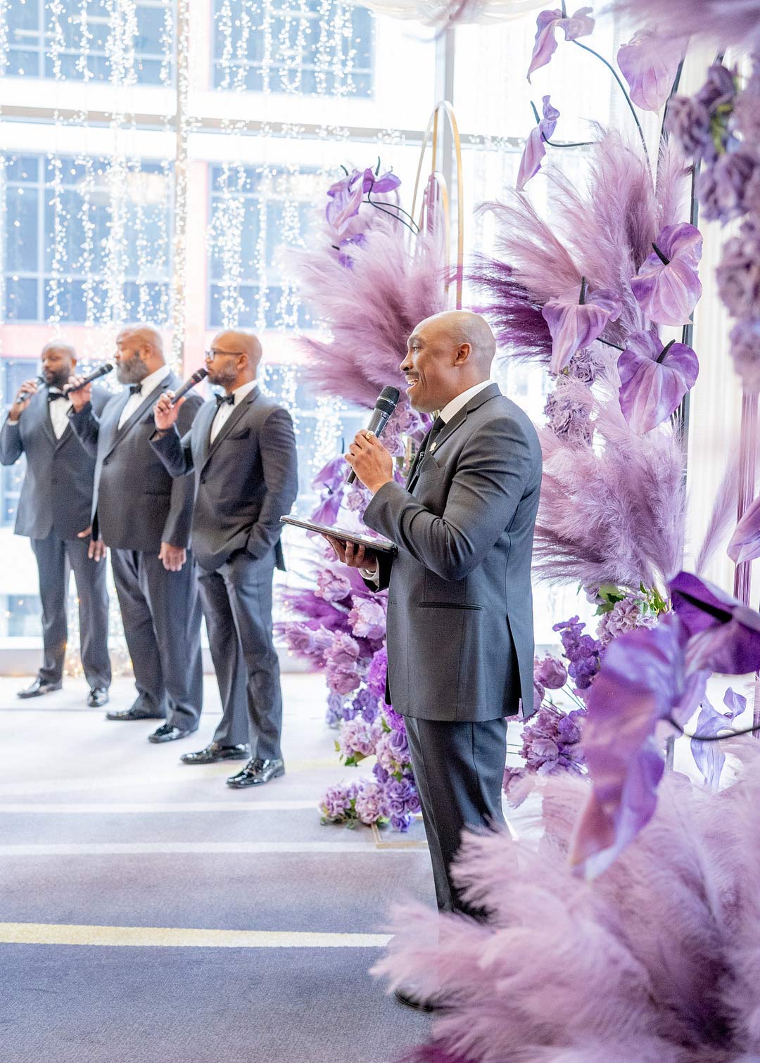 This unforgettable wedding celebration embraced the rich, romantic tones of purple and the timeless energy of Motown music. From the moment guests arrived, they were welcomed by a beautifully decorated baby grand piano and the smooth, soulful sounds of a live Motown band, setting the tone for a day filled with elegance, nostalgia, and heart.