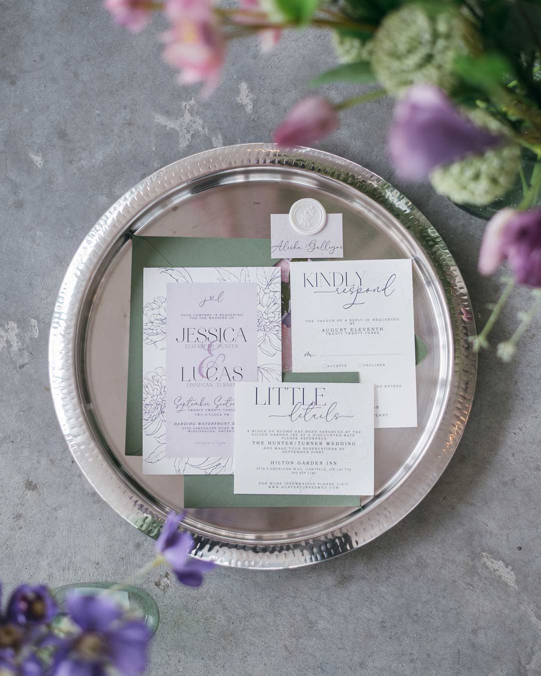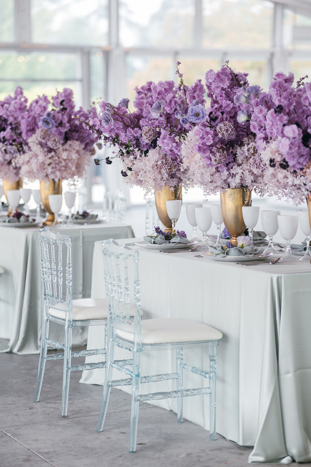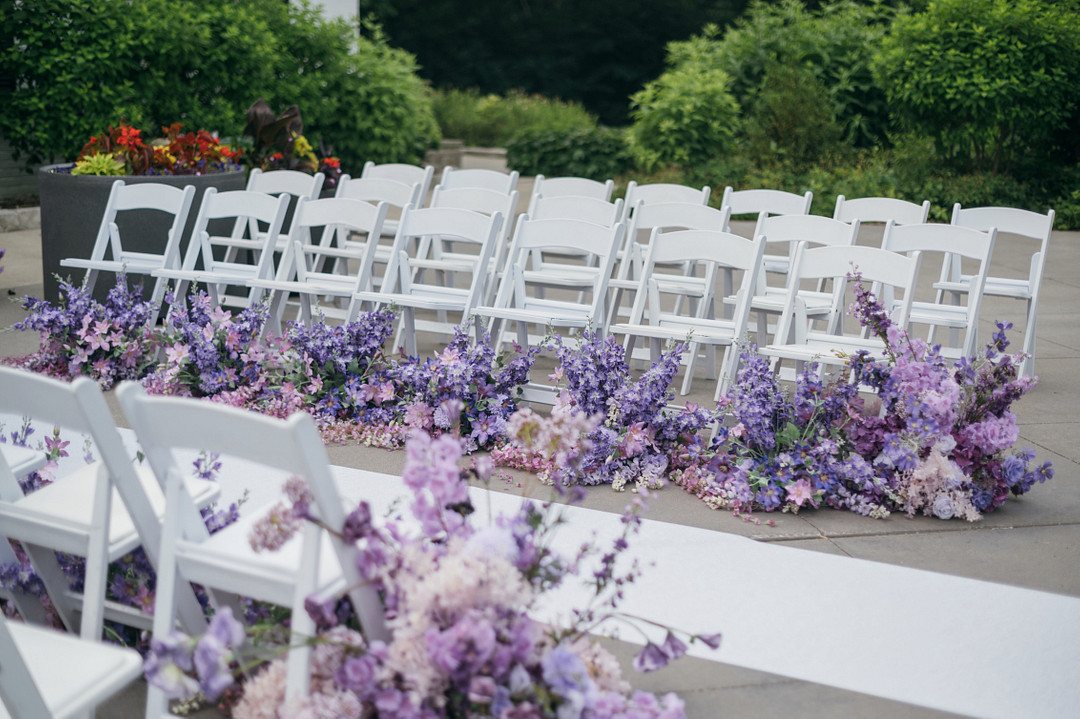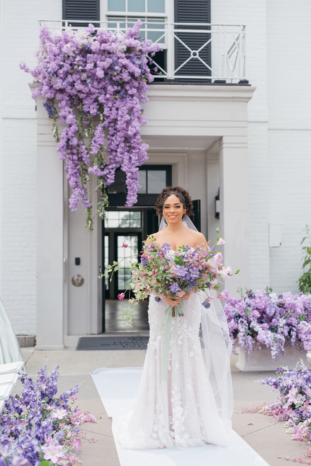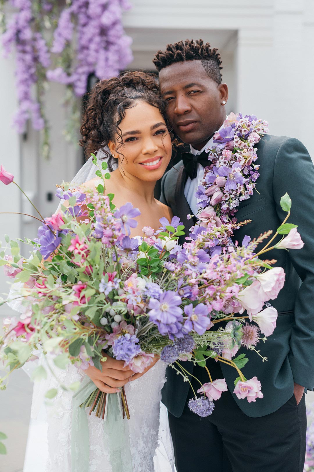 To begin, florals take center stage. Shades of purple bloom everywhere, adding depth and romance. Instead of a classic boutonniere, the groom wears a trailing lapel floral—an unexpected, stylish choice.
