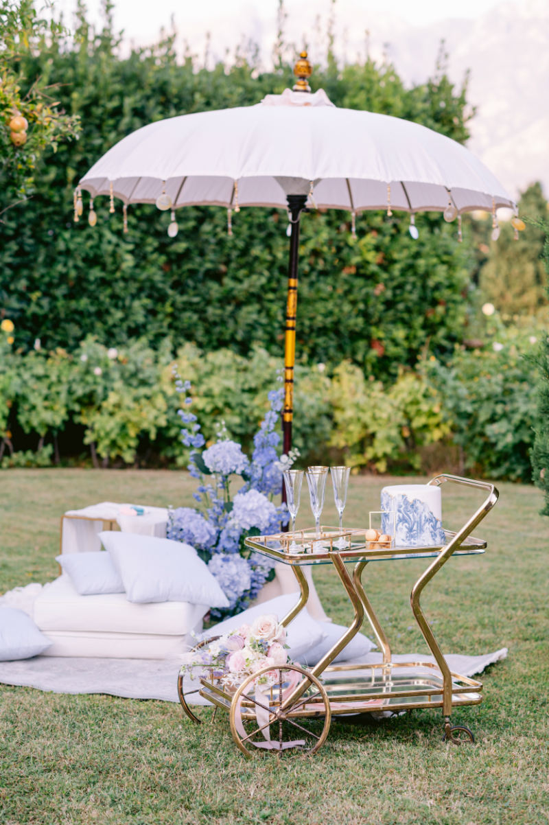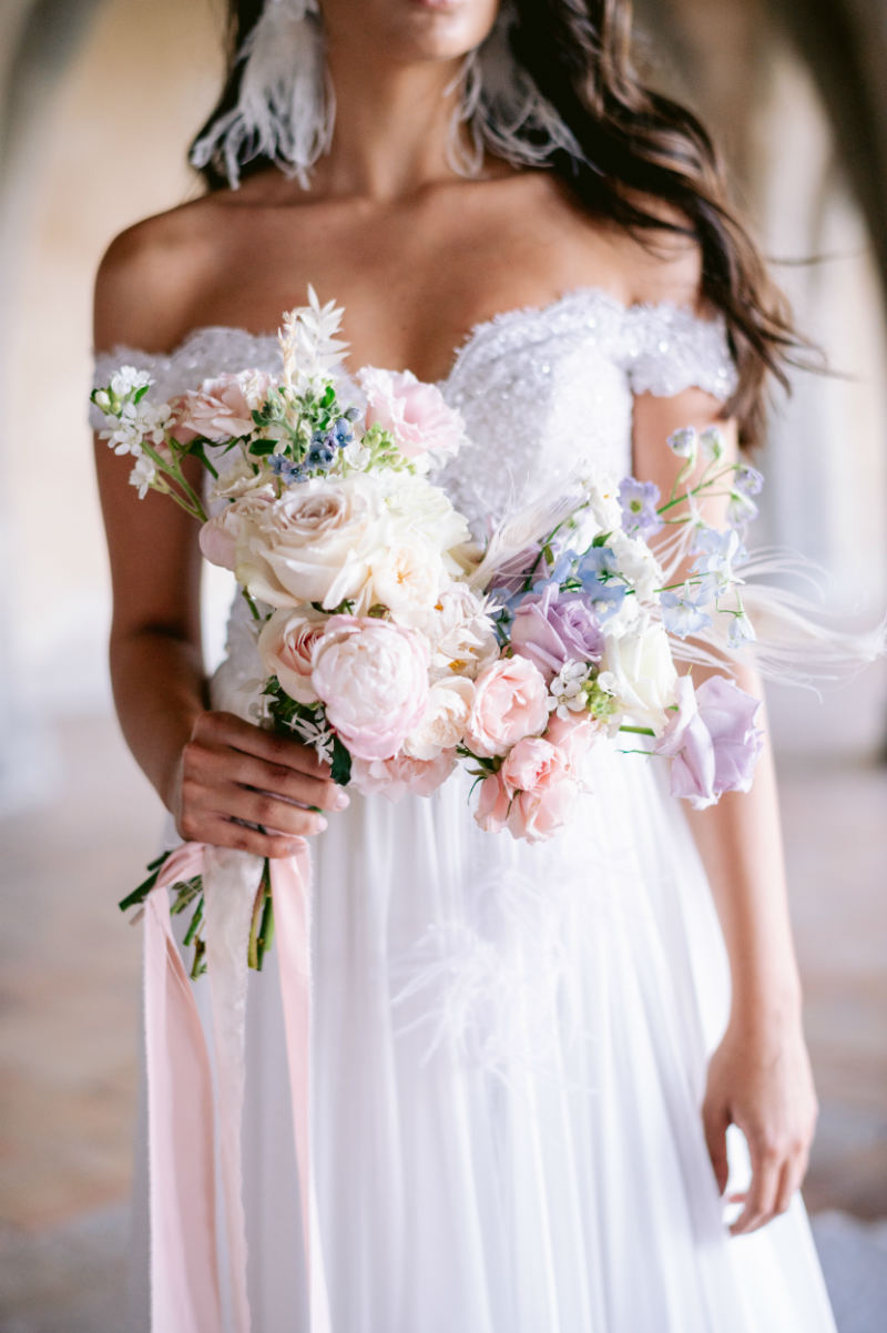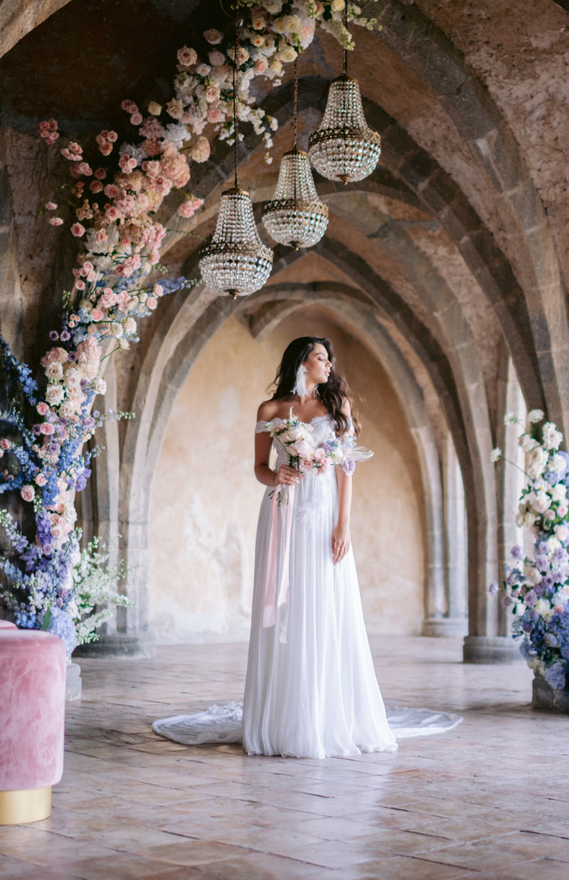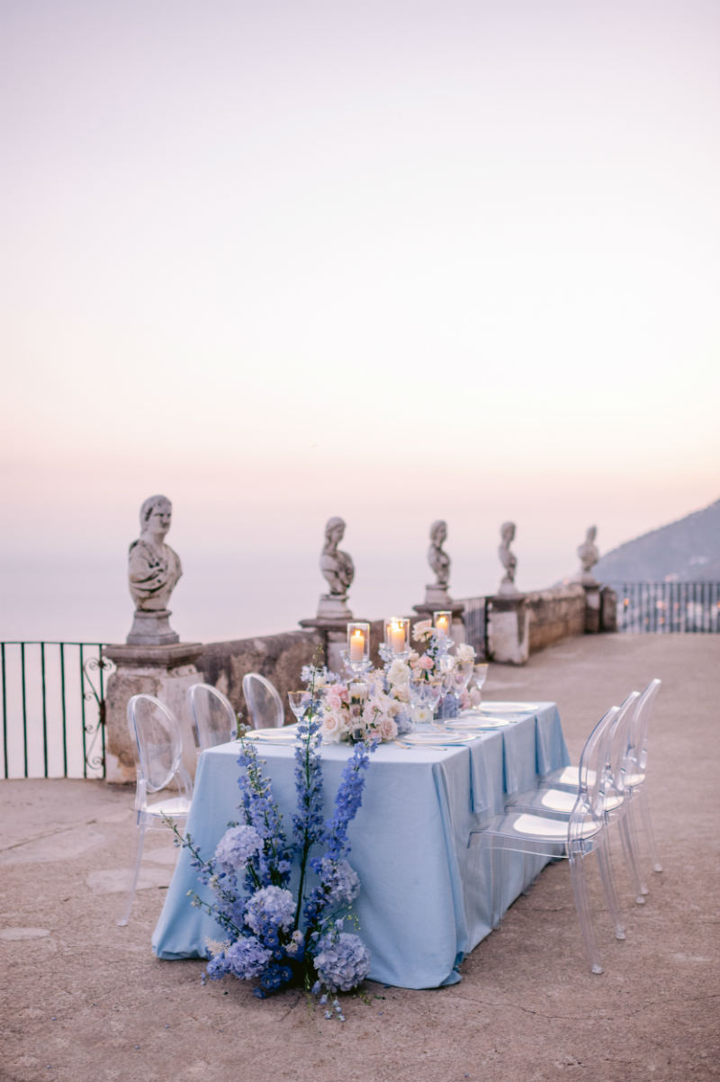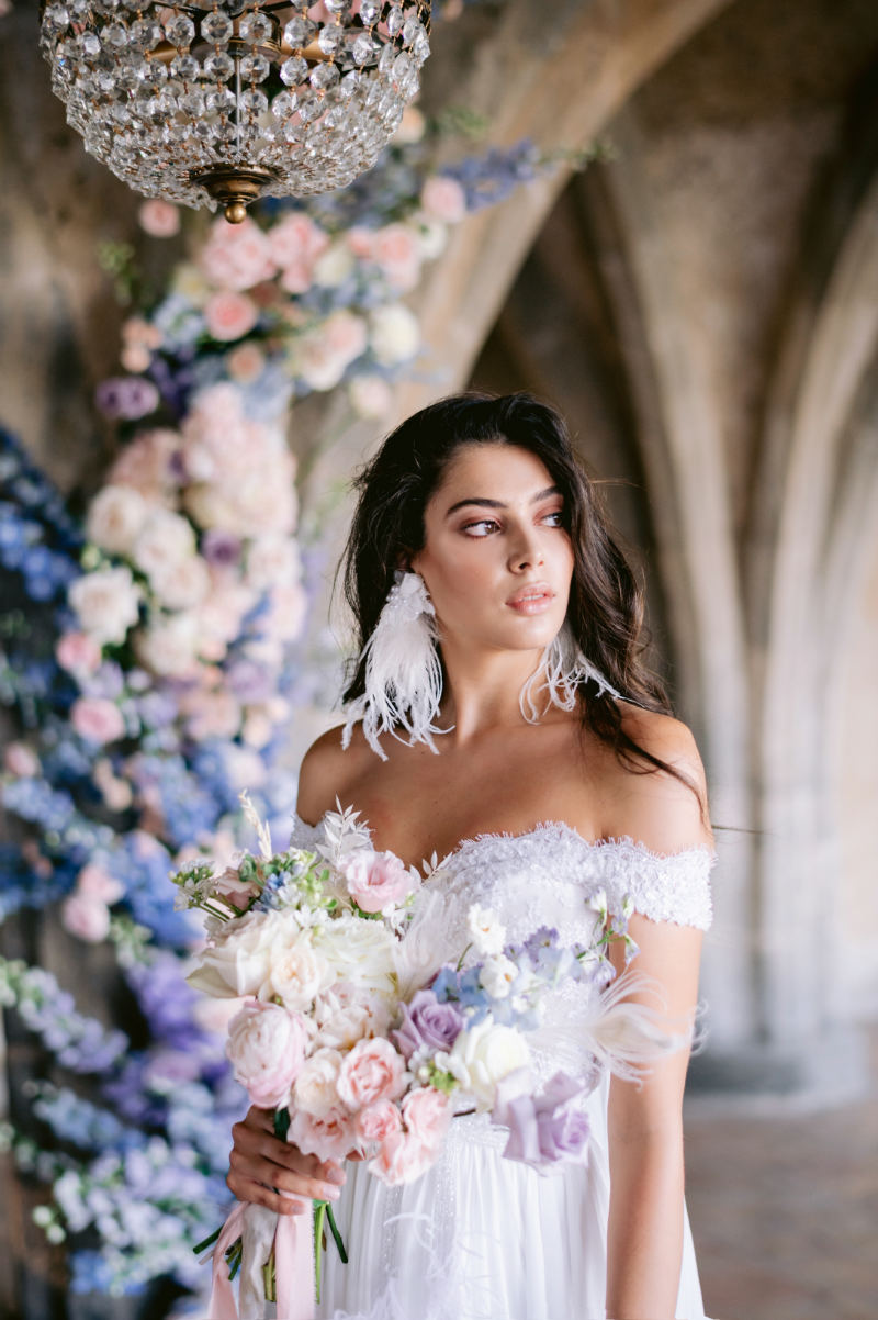 The inspiration for this wedding styled shoot was to create a real-life fairytale. Paulina of Events by Paulina always loved Sleeping Beauty, so she chose the feel and color inspiration from the Disney classic movie. The team’s blue use is inspired by the Mediterranean Sea, which is a significant part of the venue.