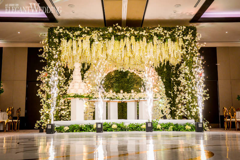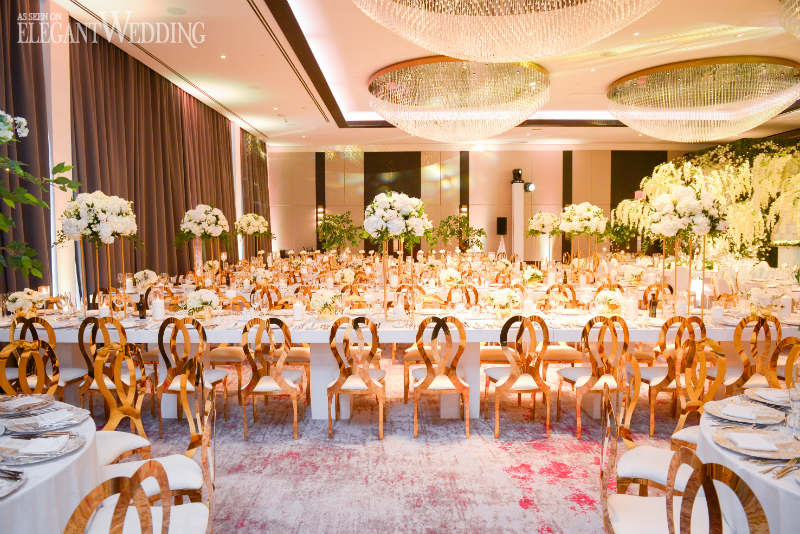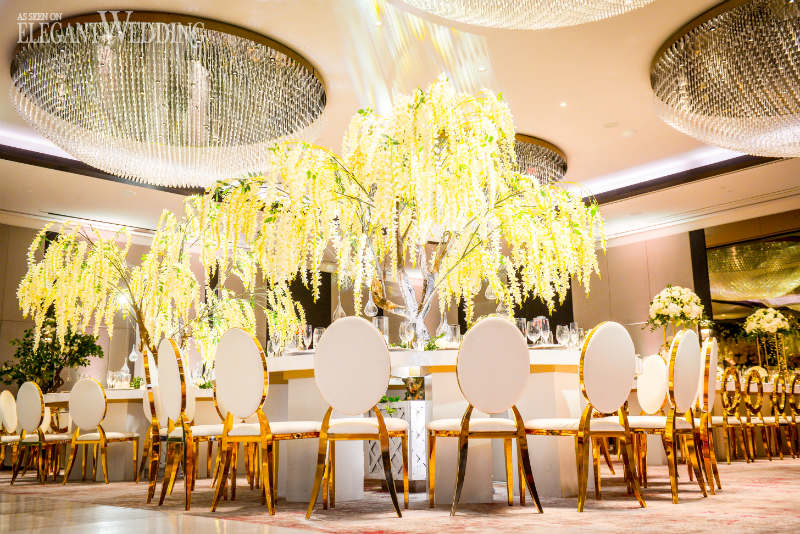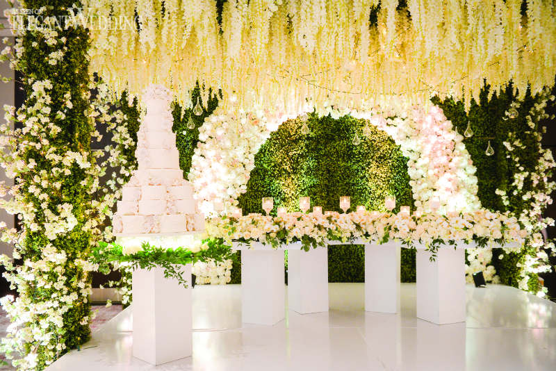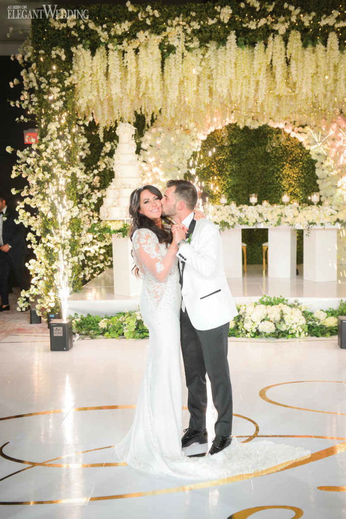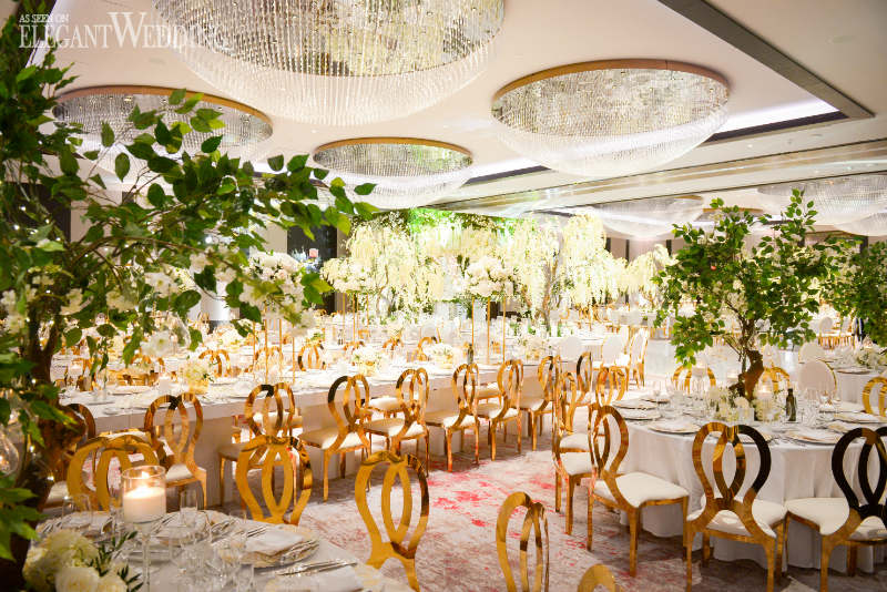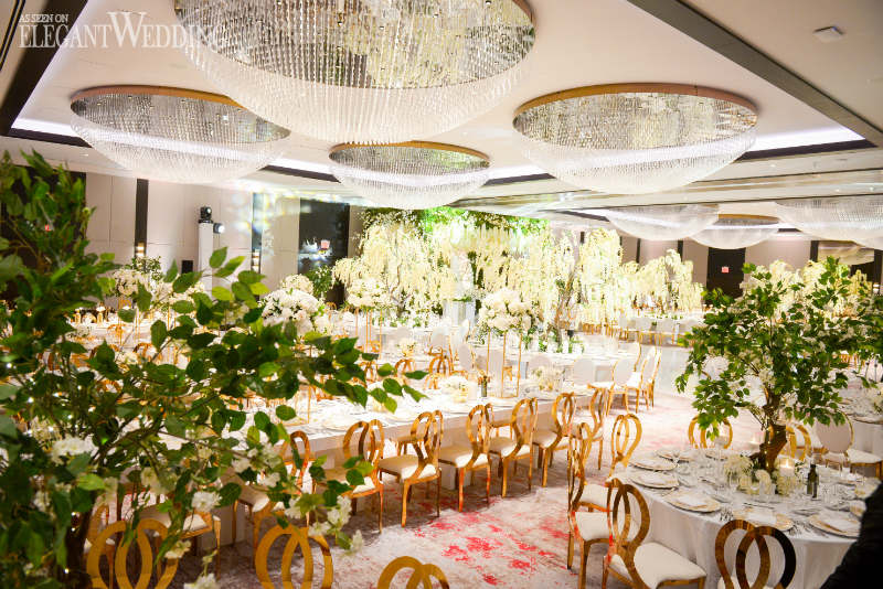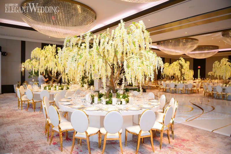 A seemingly endless sea of fresh florals from Gatto Flowers turned Ashley and Danny’s reception into an incredible fairytale. 12-foot-tall wisteria trees at most tables by R5 Event Design The couple’s epic head table created with greenery, cherry blossoms and wisteria. The true focal point of the room.