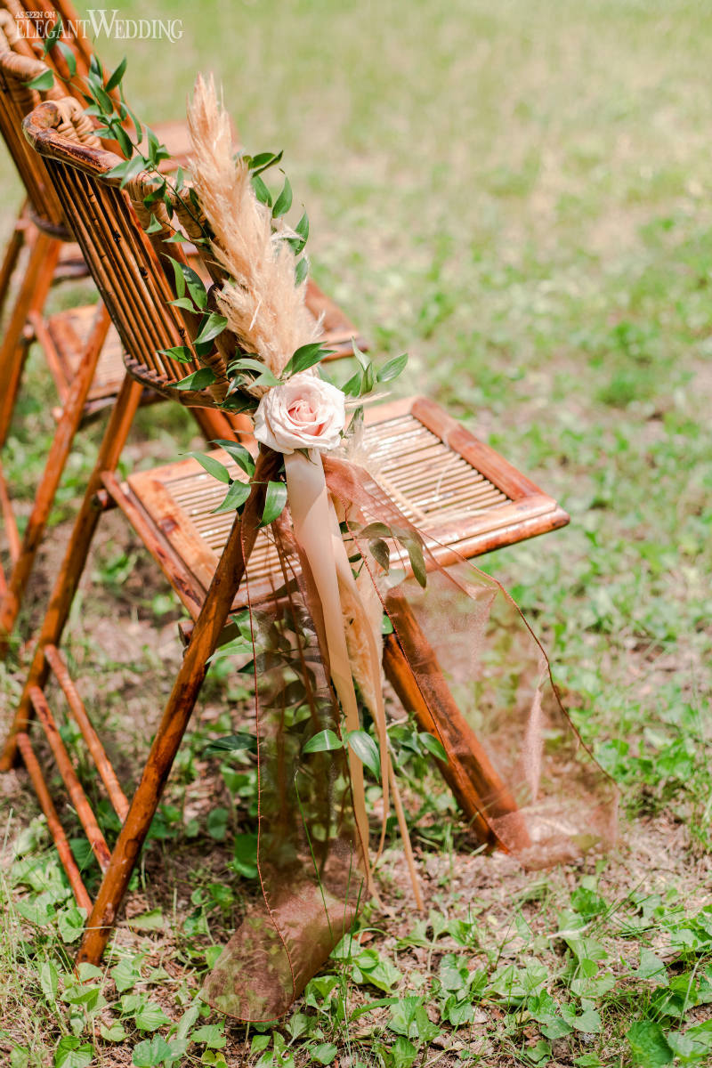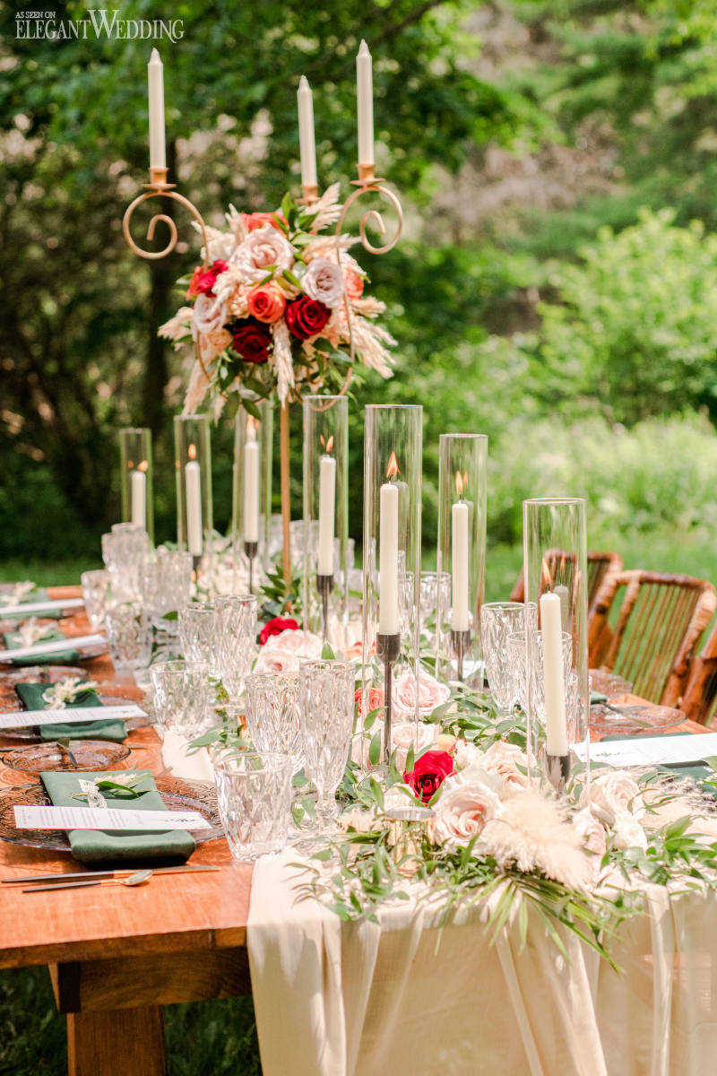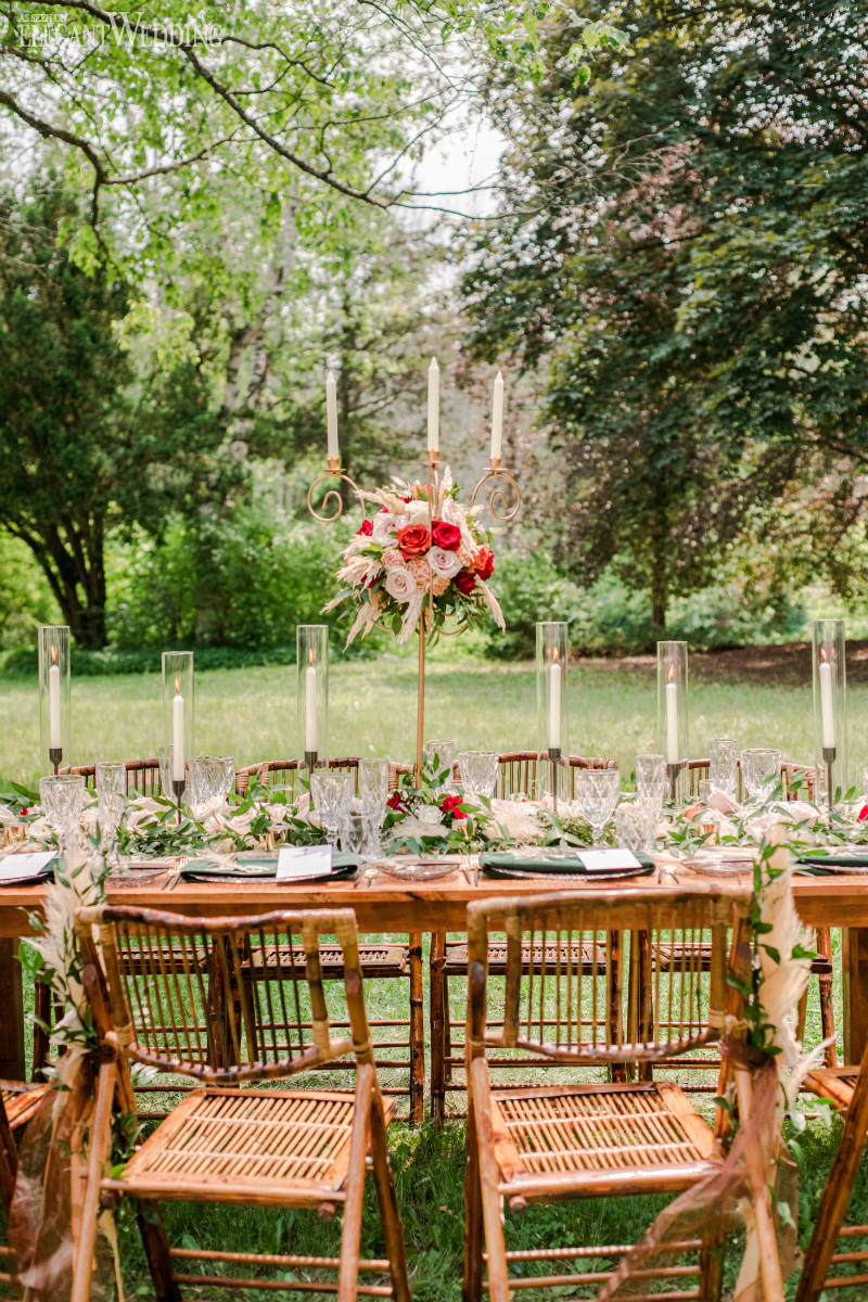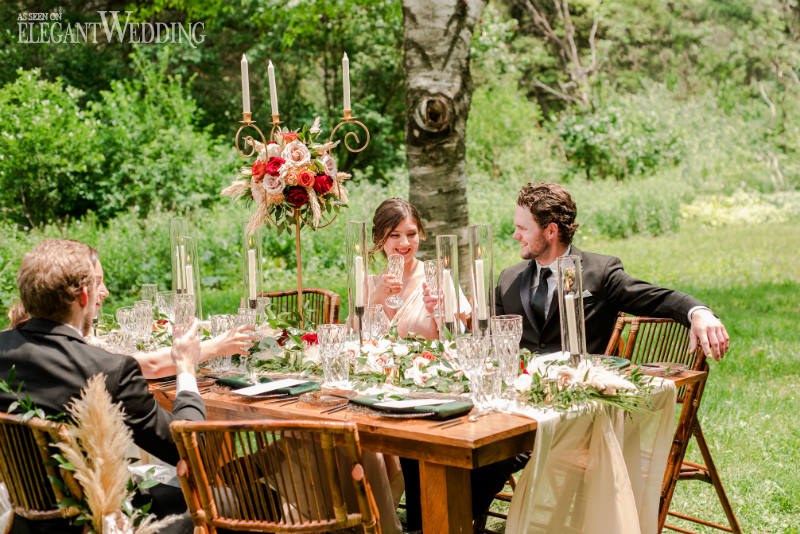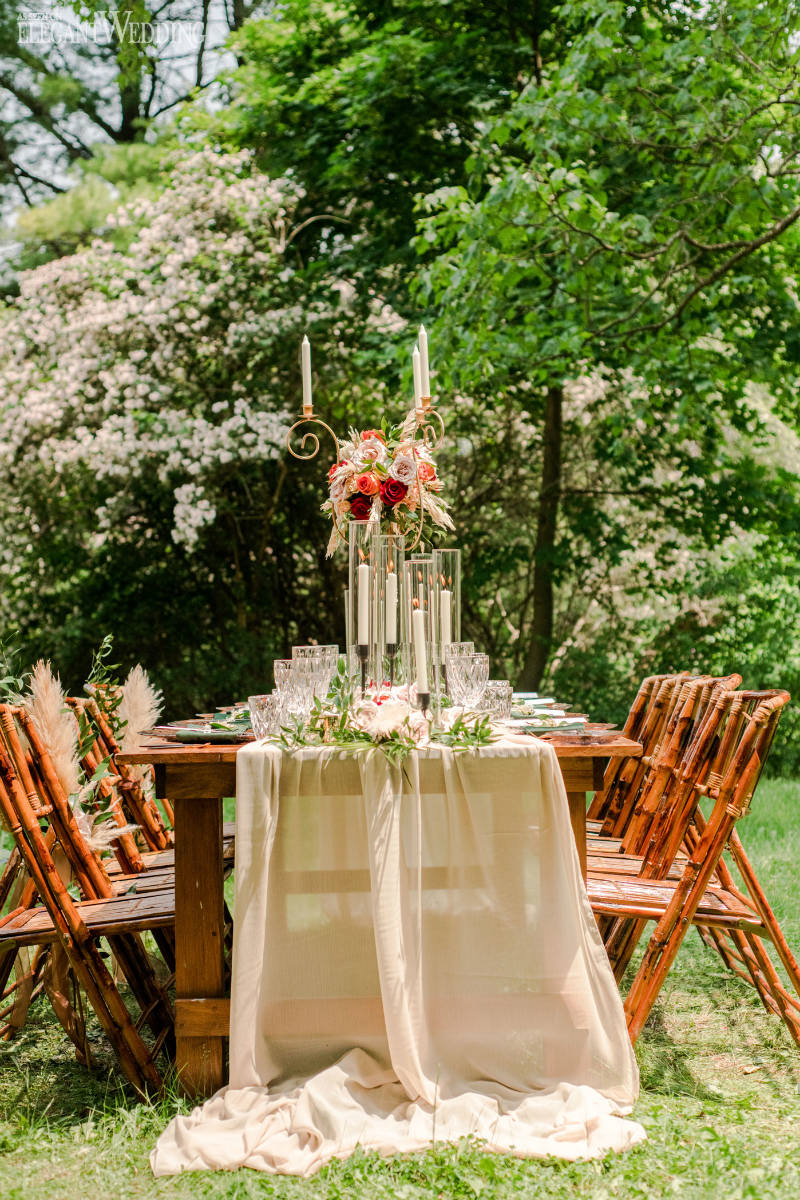 The team of vendors created this shoot to help promote small outdoor weddings. With the pandemic continuing, many couples have moved the route of still having their dream weddings with just close friends and family. Color inspired by 2021 trends – the terracotta orange and deep greens. The vintage bohemian style was to show that you can have an elegant wedding outdoors without always going the “rustic” route.