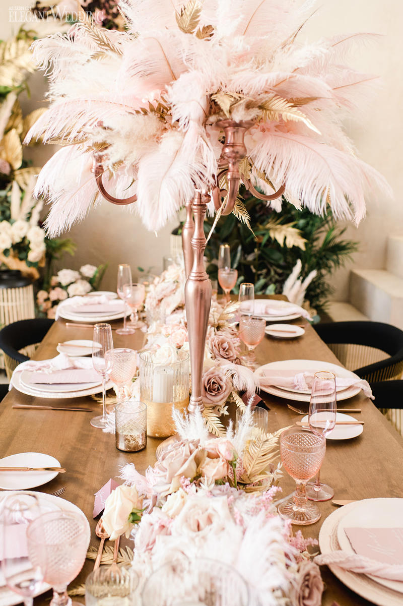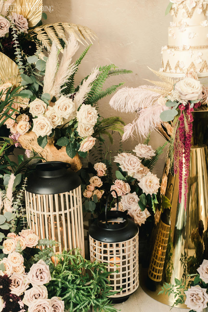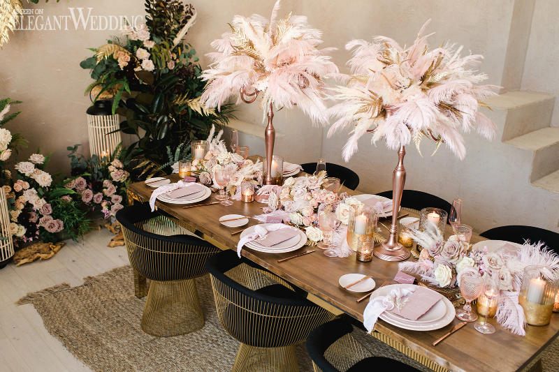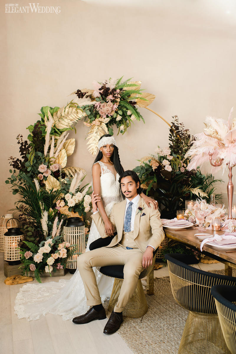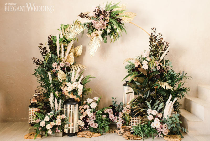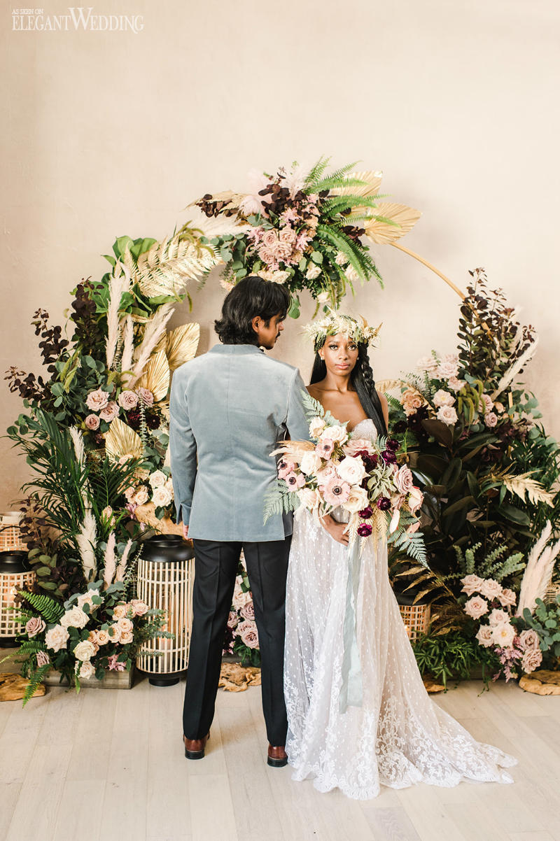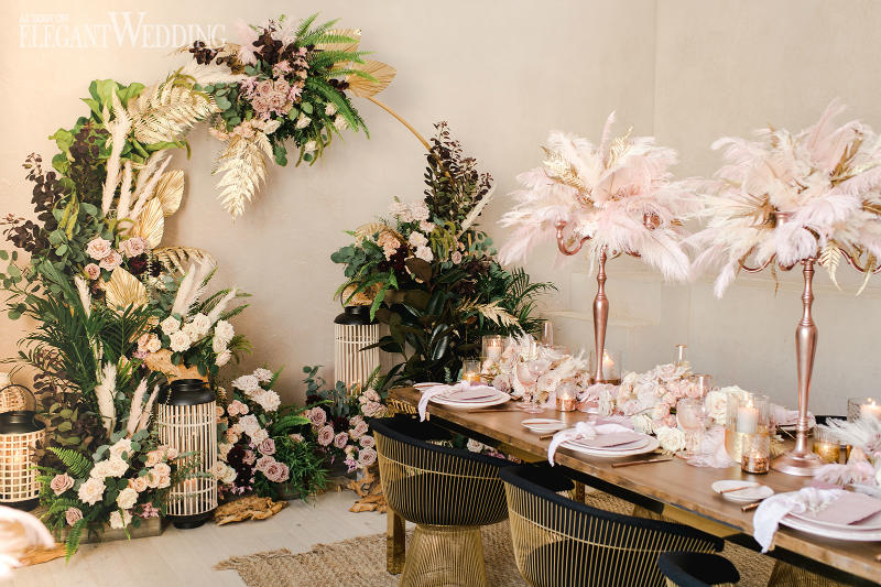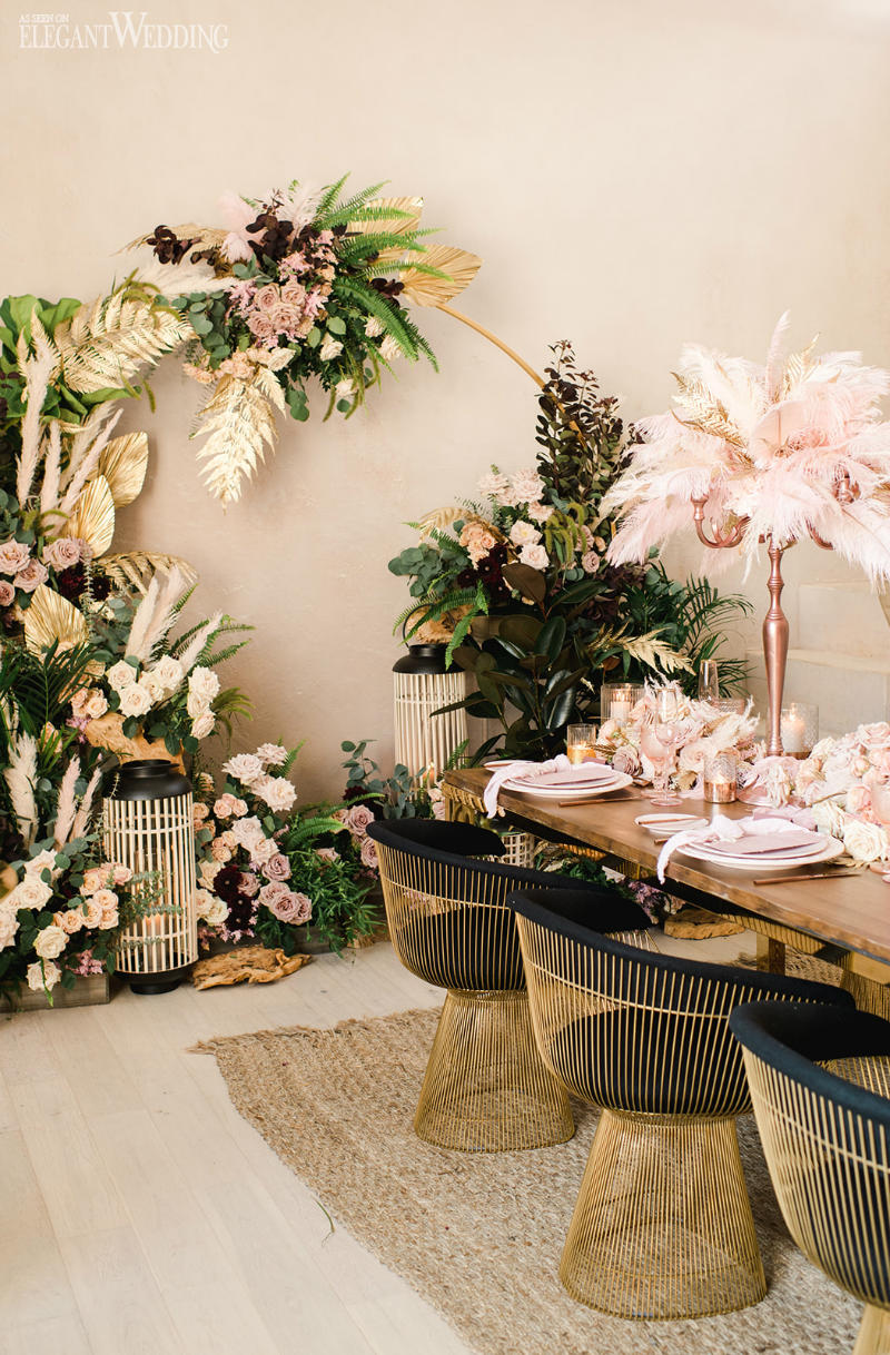 Boho weddings have become quite the trend as of late. The airy, nature vibe is beyond picturesque. The team was able to elevate this stunning theme through florals, candles, gorgeous gowns, intricate suits, and a mix of wood and glam for the table and chairs. The florals used for the opulent table setting was a mix of blush pampas grass, ostrich feathers, and preserved ferns. The circular arch was a combination of plants and flowers, including pampas grass, preserved ferns, and plants of fiddle figs, majesty palms, rubber trees, and ferns.
