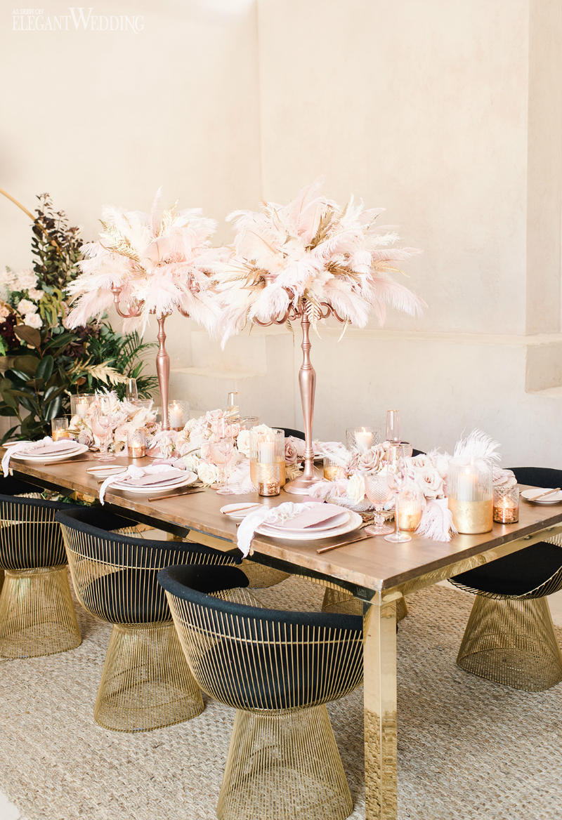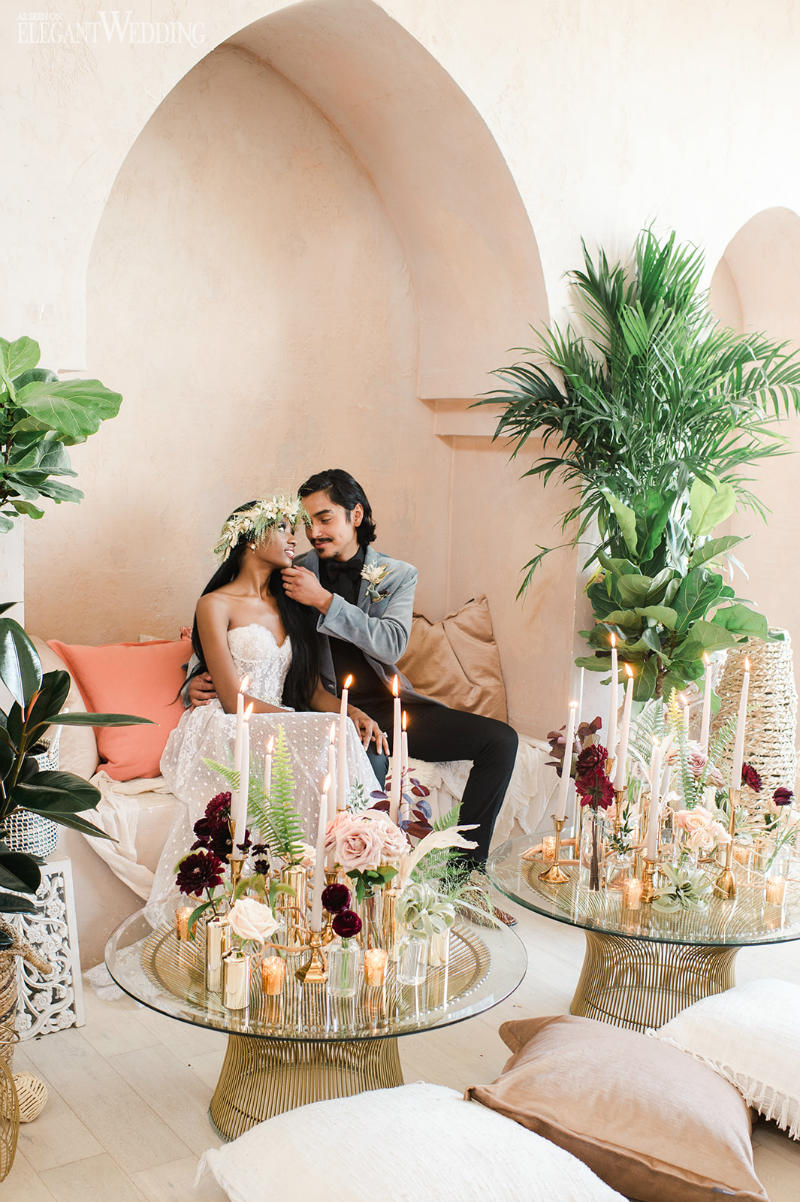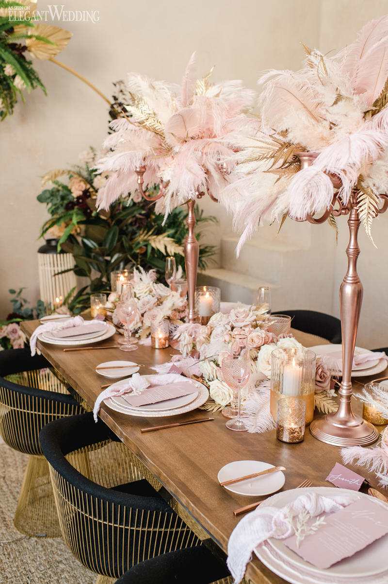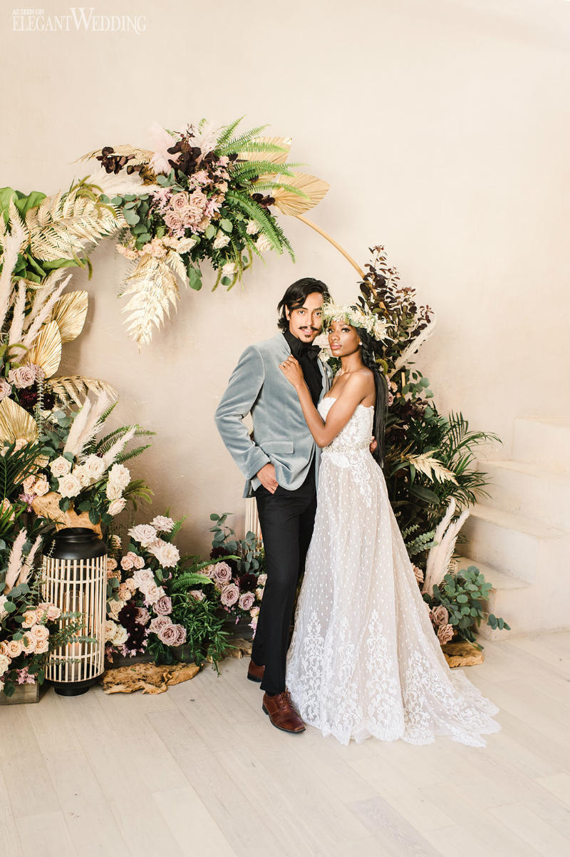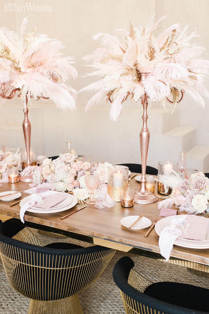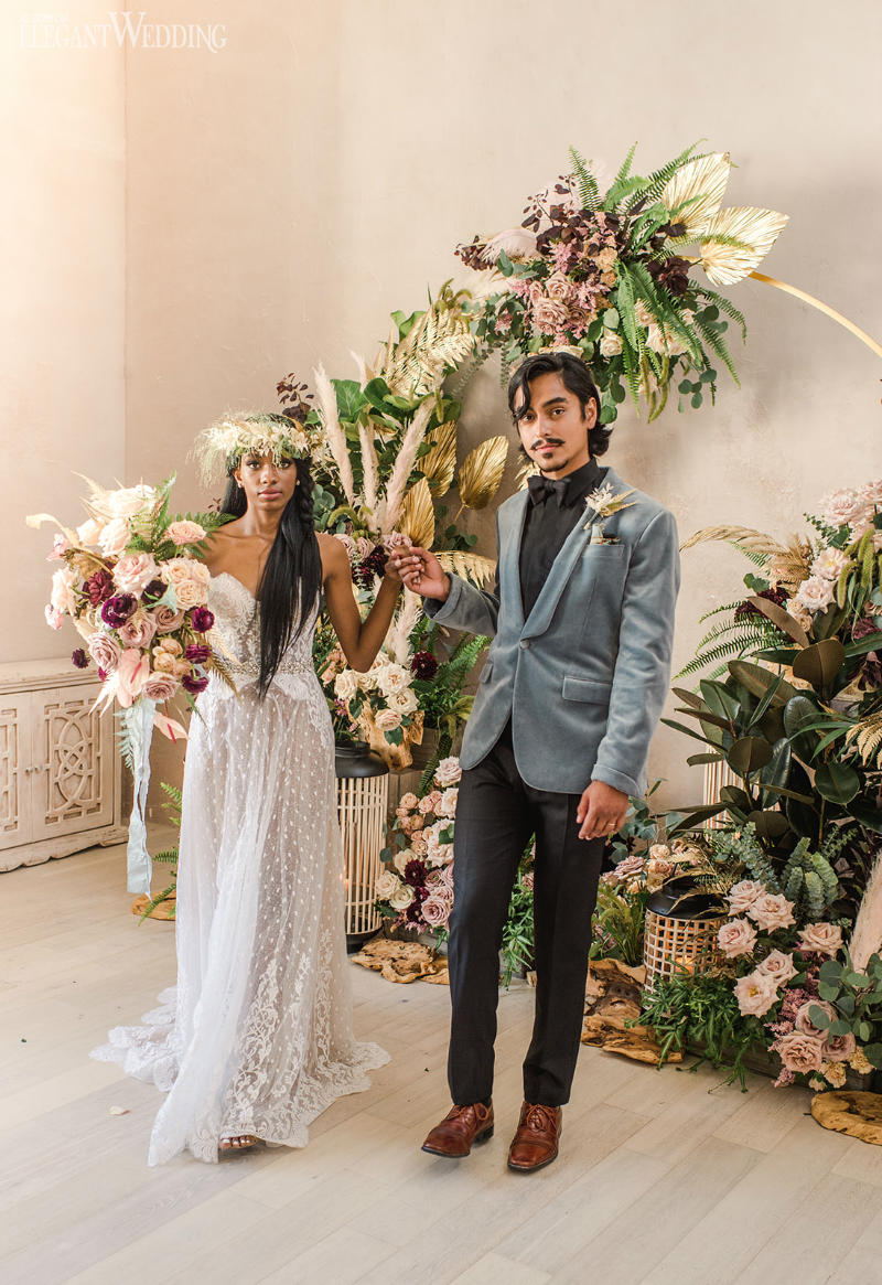 Boho weddings have become quite the trend as of late. The airy, nature vibe is beyond picturesque. The team was able to elevate this stunning theme through florals, candles, gorgeous gowns, intricate suits, and a mix of wood and glam for the table and chairs. The florals used for the opulent table setting was a mix of blush pampas grass, ostrich feathers, and preserved ferns. The circular arch was a combination of plants and flowers, including pampas grass, preserved ferns, and plants of fiddle figs, majesty palms, rubber trees, and ferns.