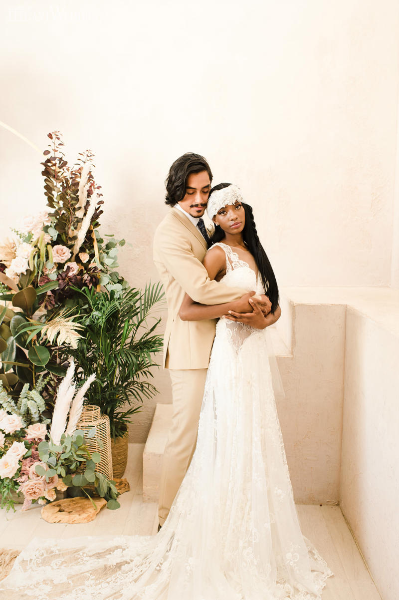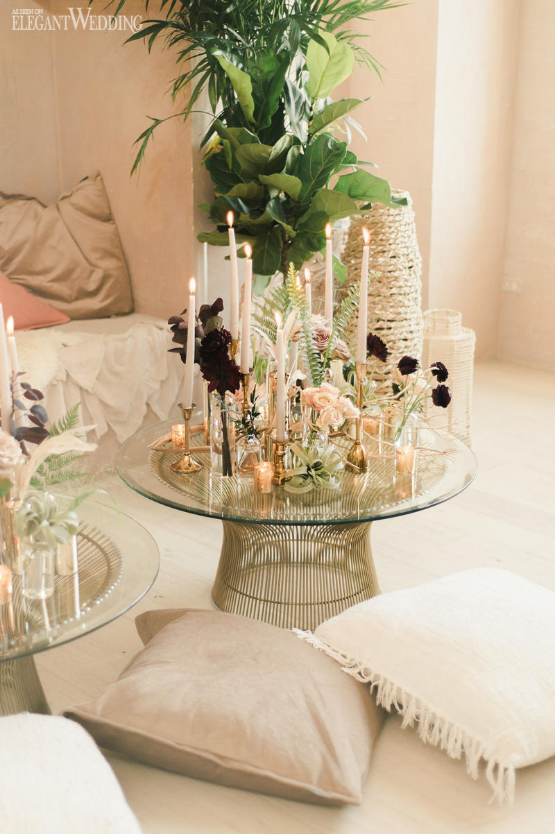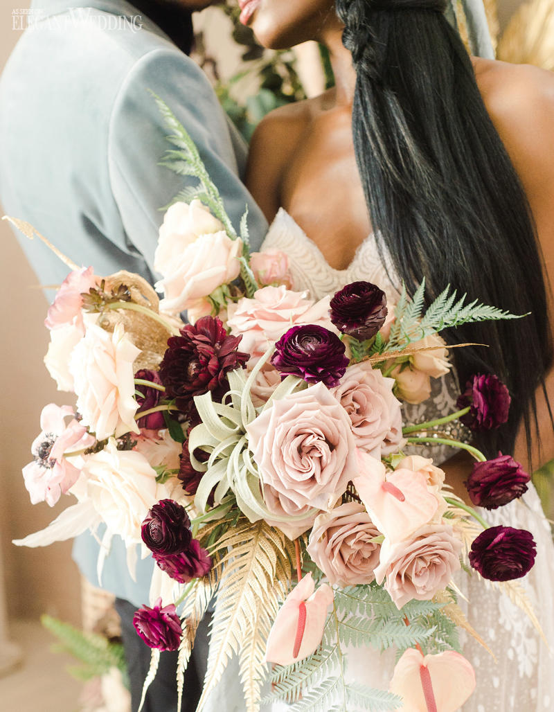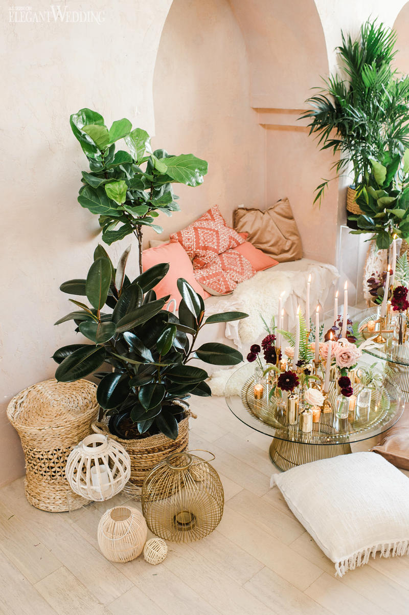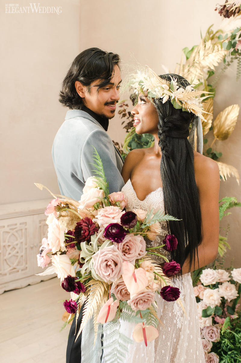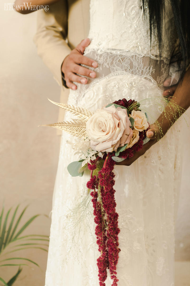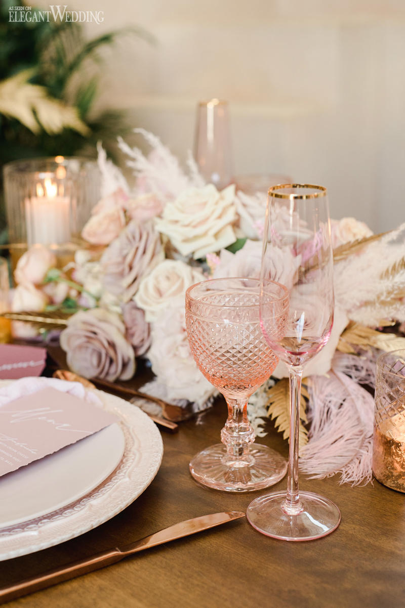 Boho weddings have become quite the trend as of late. The airy, nature vibe is beyond picturesque. The team was able to elevate this stunning theme through florals, candles, gorgeous gowns, intricate suits, and a mix of wood and glam for the table and chairs. The florals used for the opulent table setting was a mix of blush pampas grass, ostrich feathers, and preserved ferns. The circular arch was a combination of plants and flowers, including pampas grass, preserved ferns, and plants of fiddle figs, majesty palms, rubber trees, and ferns.