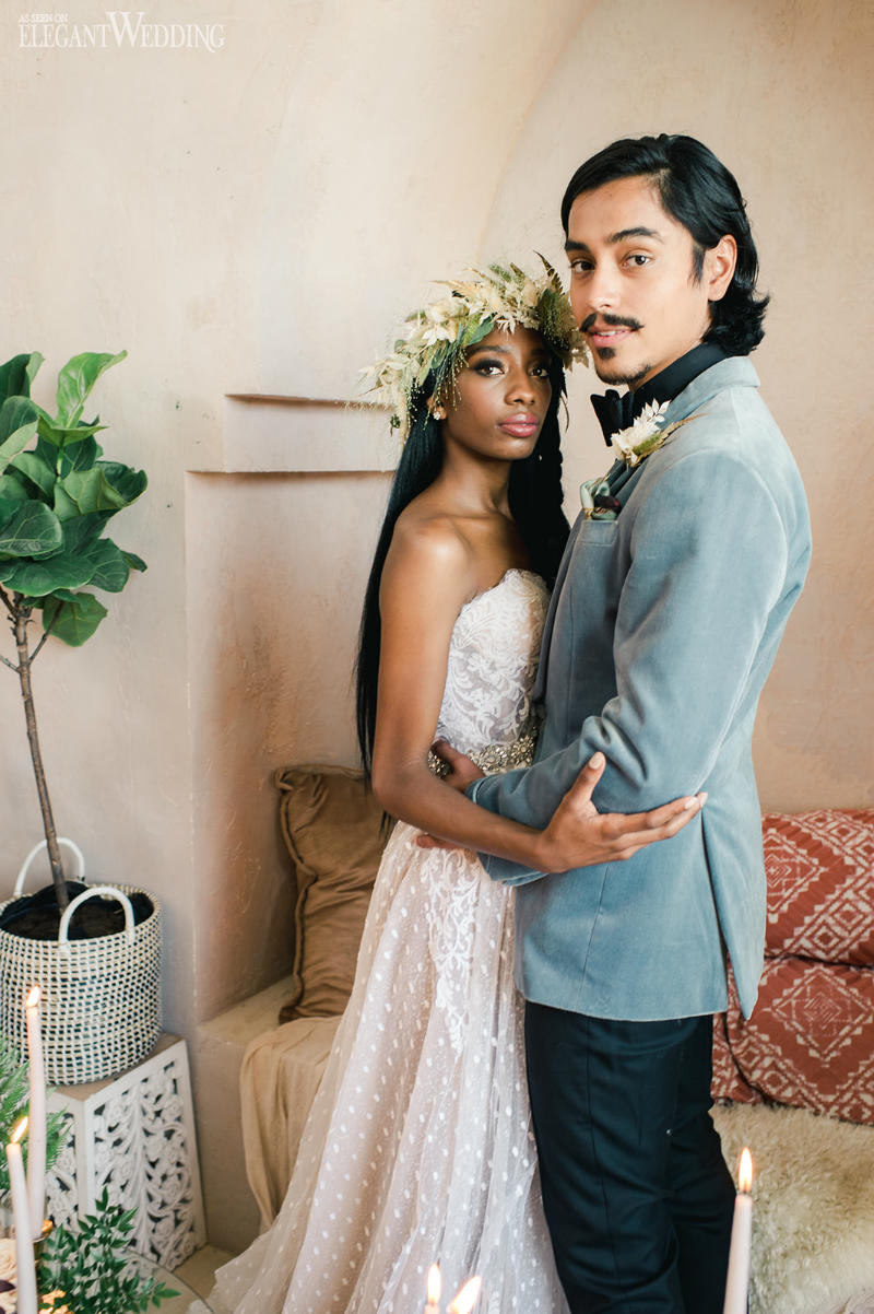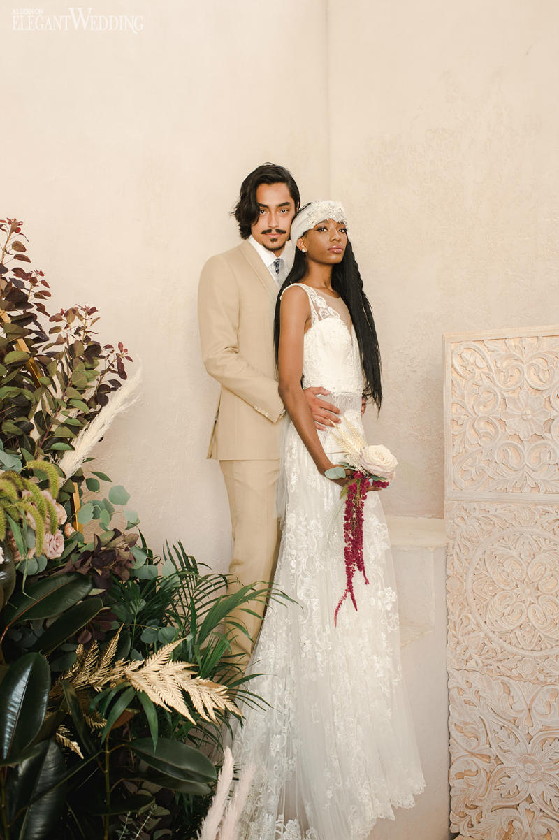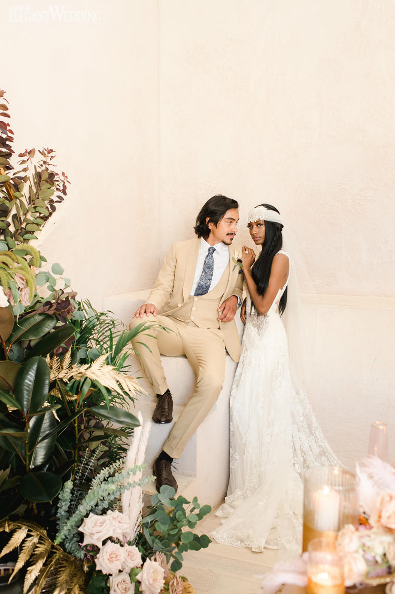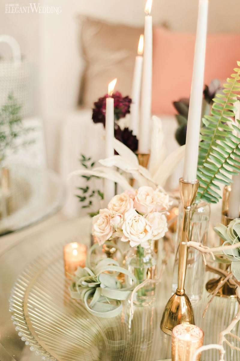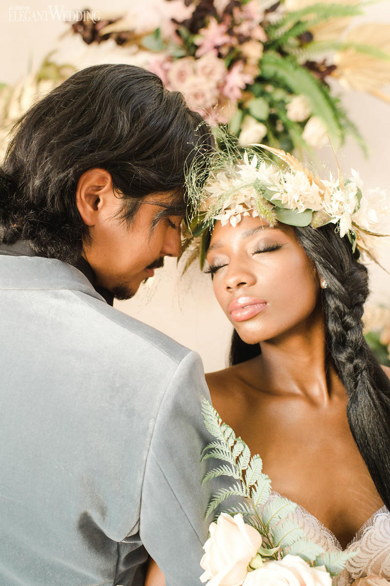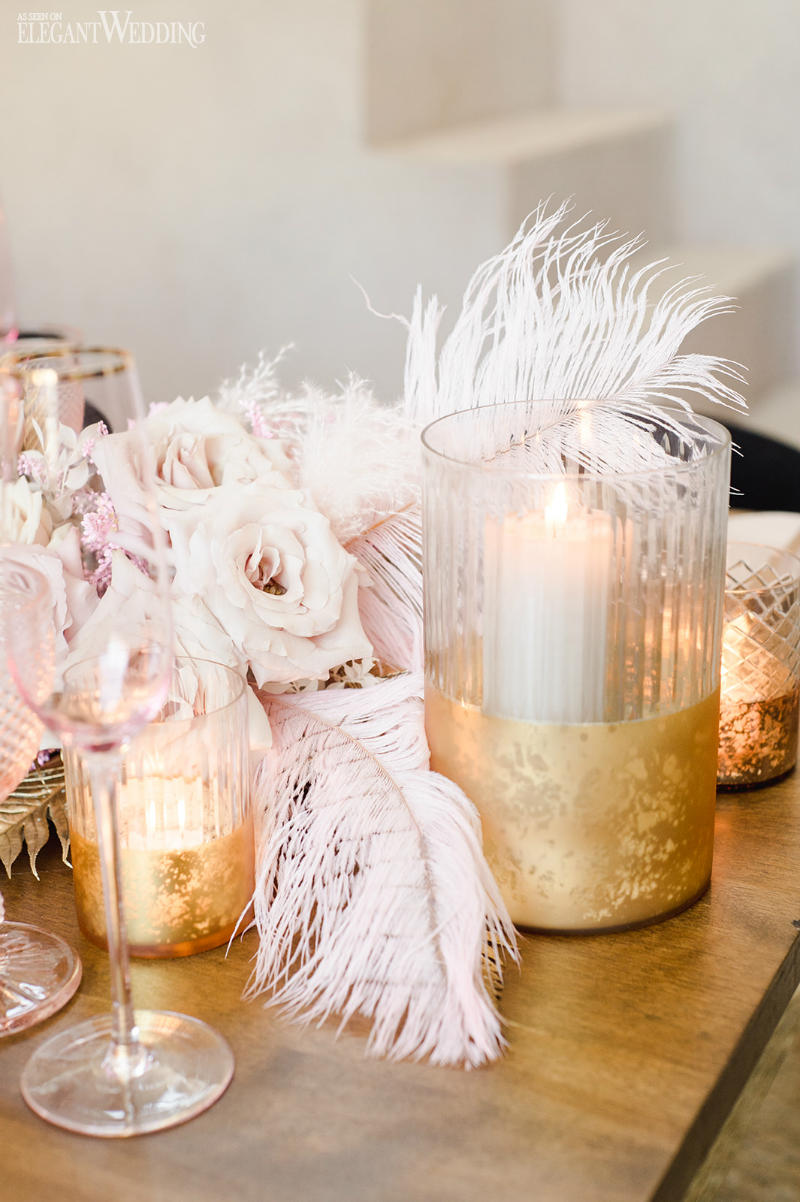 Boho weddings have become quite the trend as of late. The airy, nature vibe is beyond picturesque. The team was able to elevate this stunning theme through florals, candles, gorgeous gowns, intricate suits, and a mix of wood and glam for the table and chairs. The florals used for the opulent table setting was a mix of blush pampas grass, ostrich feathers, and preserved ferns. The circular arch was a combination of plants and flowers, including pampas grass, preserved ferns, and plants of fiddle figs, majesty palms, rubber trees, and ferns.
