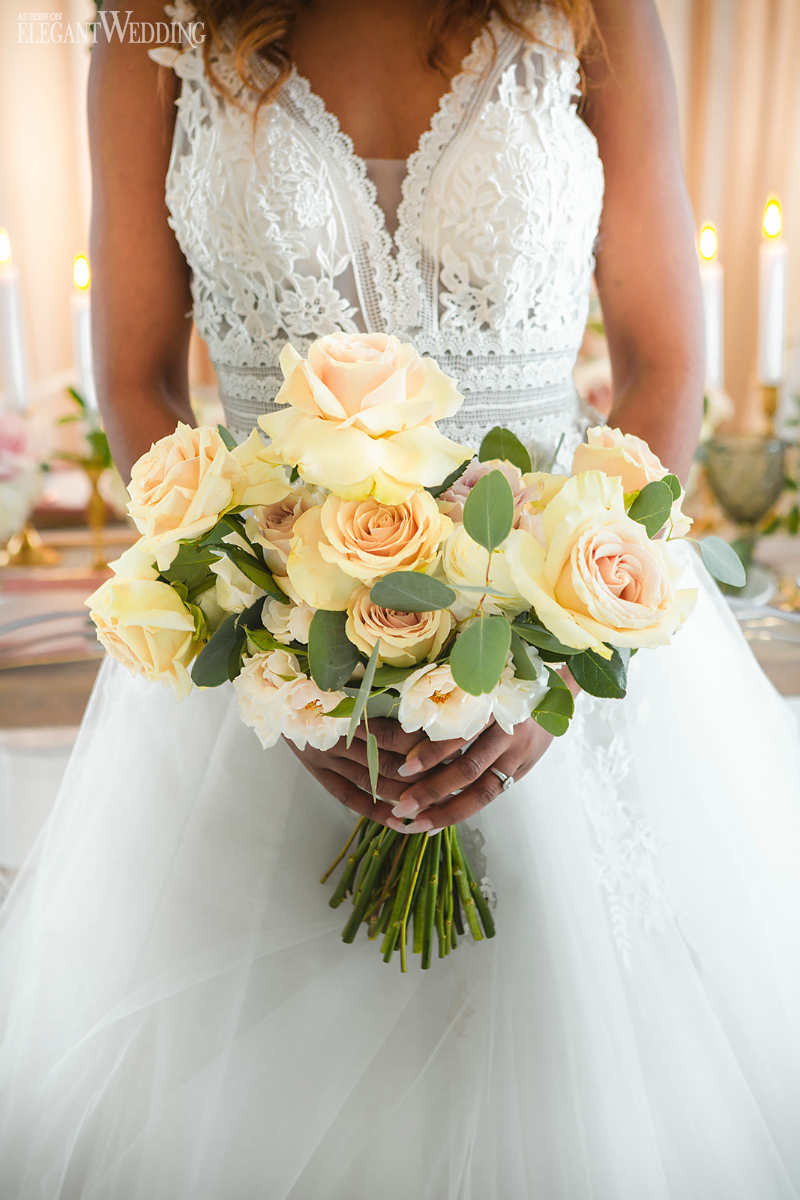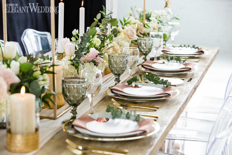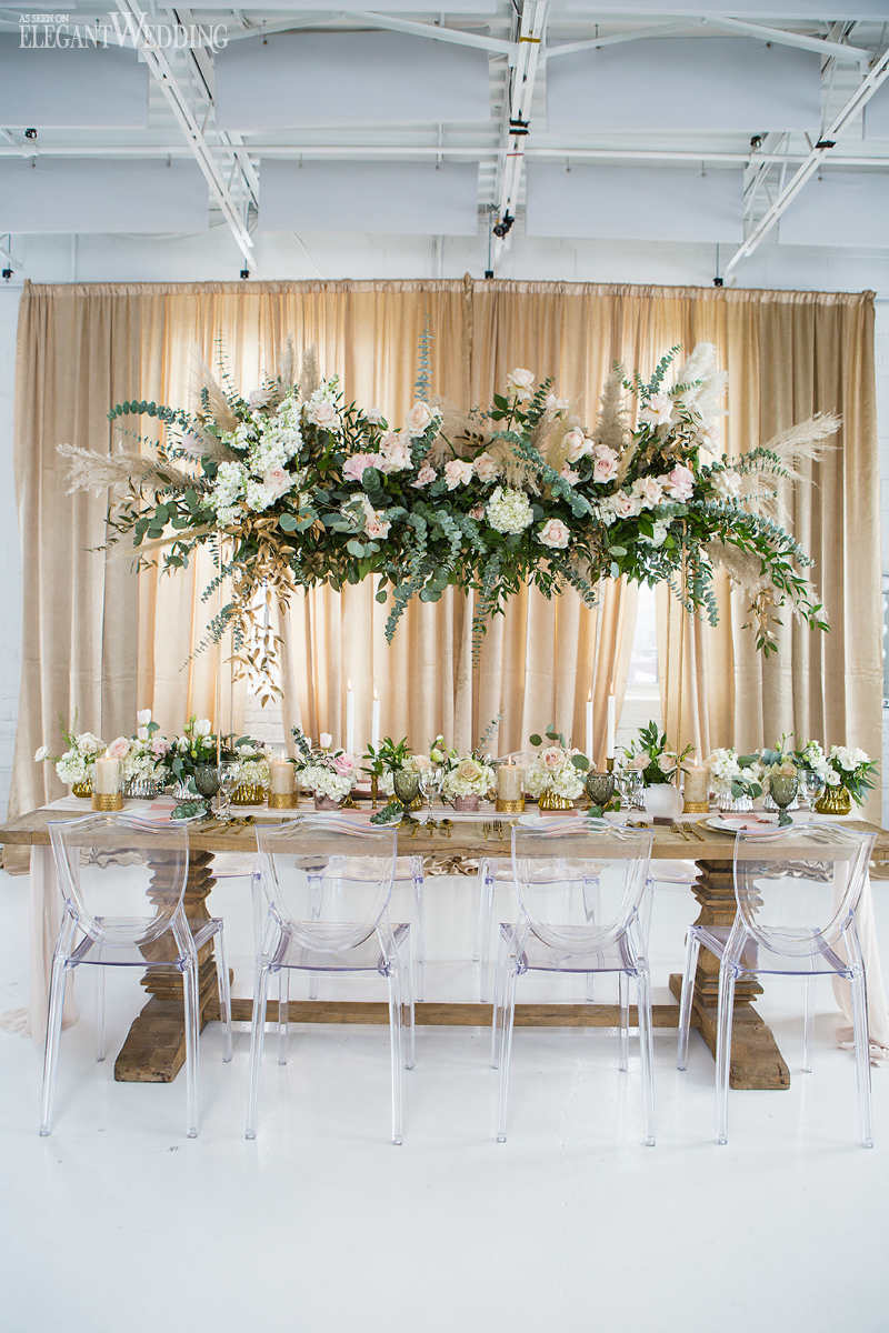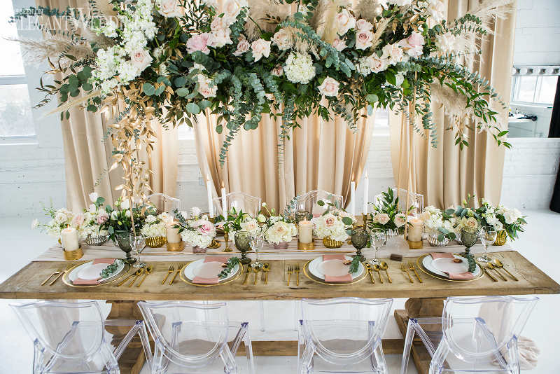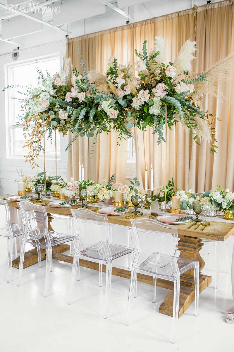 The floral design composed of lots of green foliage but with a touch of roses, blush and cream color; eucalyptus flowers and pampas grass stems to accentuate the magical and exotic side of the decor. The goal was to recreate a glamorous and vintage universe while remaining close to nature. A natural wooden table to get closer to the rustic, natural aspect and transparent chairs to bring forward the modern aspect. A mixture of texture always gives character to any wedding. Don’t be afraid to mix and match, the results can be stunning.