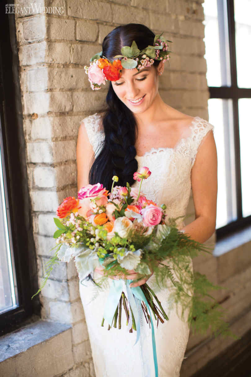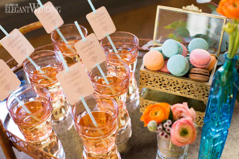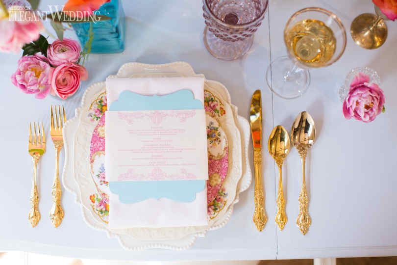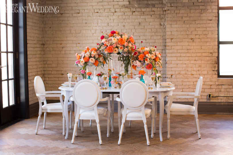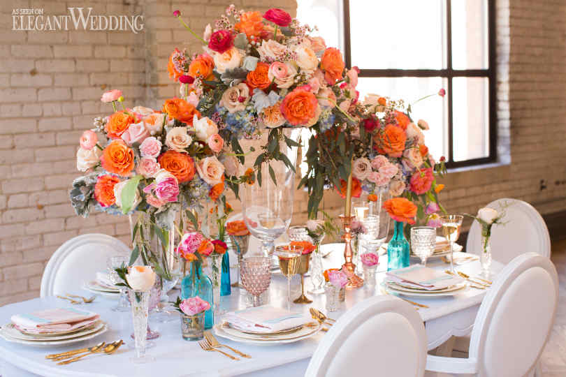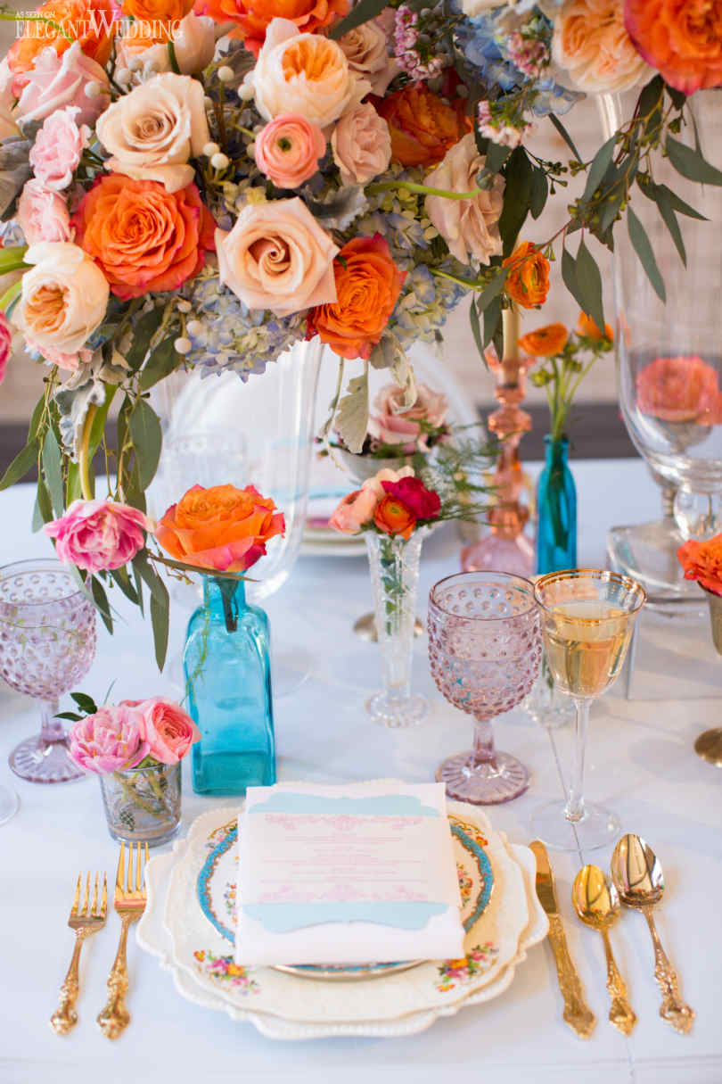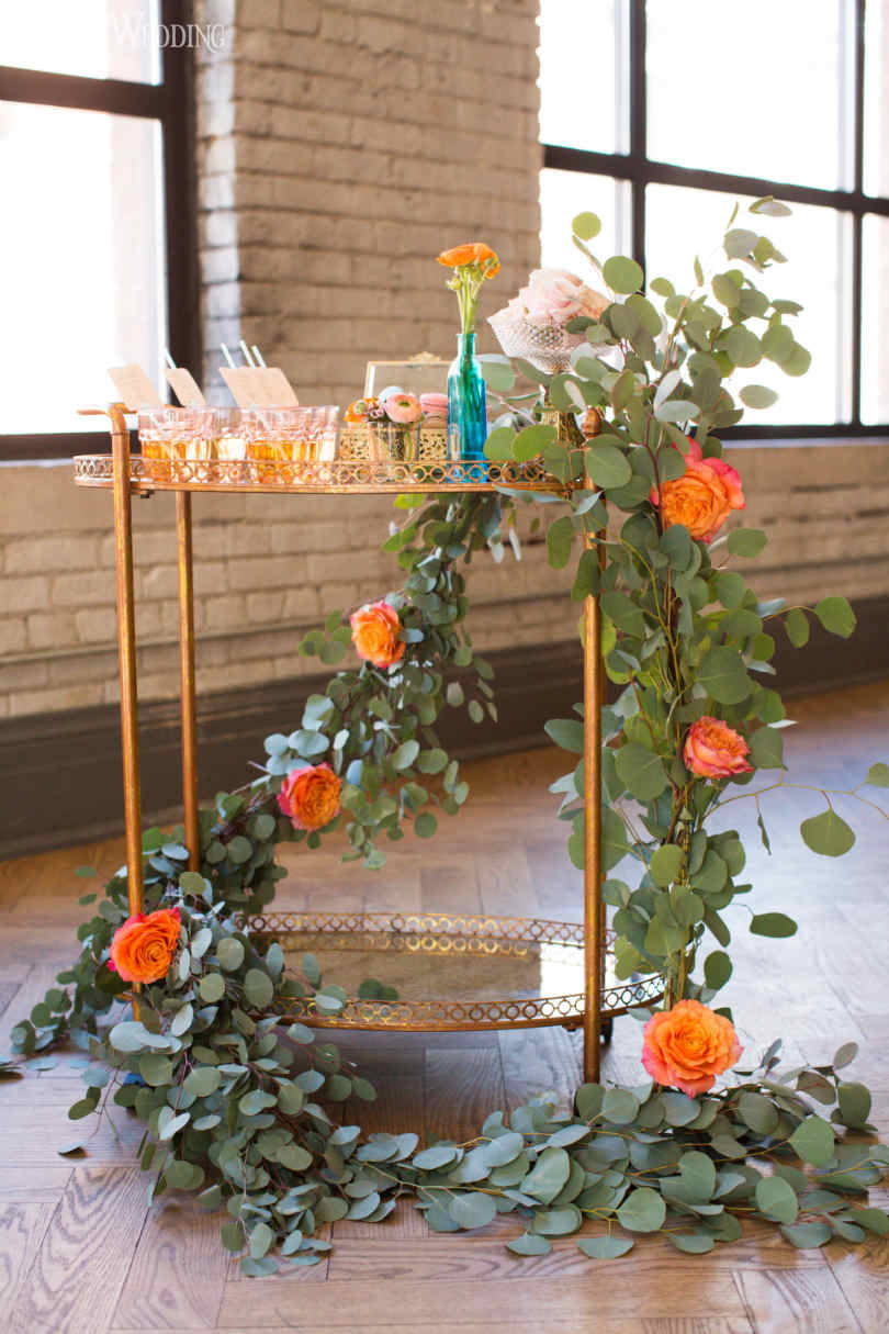 This “ Bohemian Princess ” style shoot marries the colours of the rainbow with life in the forest. Wherever there’s a hue of orange, blue or pink, there’s a hint of wildlife. Whether sprouting from the sweet table, draping from the drink cart or outlining the invitations, greenery finds a way to makes its presence known. Create exquisite centrepieces by picking surrounding furniture that has minimal detail. Let the flowers speak for themselves. Place them in vases that won’t take away any attention. The way these flowers have been arranged – with the stems cut short – make the vases appear to be empty, only they are cleverly resting on top.