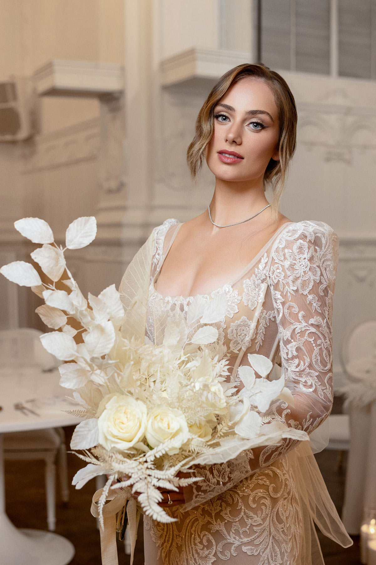 Picture a historic venue with intricate architectural details, soaring ceilings, and chandeliers that glisten under the soft glow of candlelight. This refined setting provides the ultimate backdrop for a white wedding, allowing the neutral hues to shine with unparalleled grace.