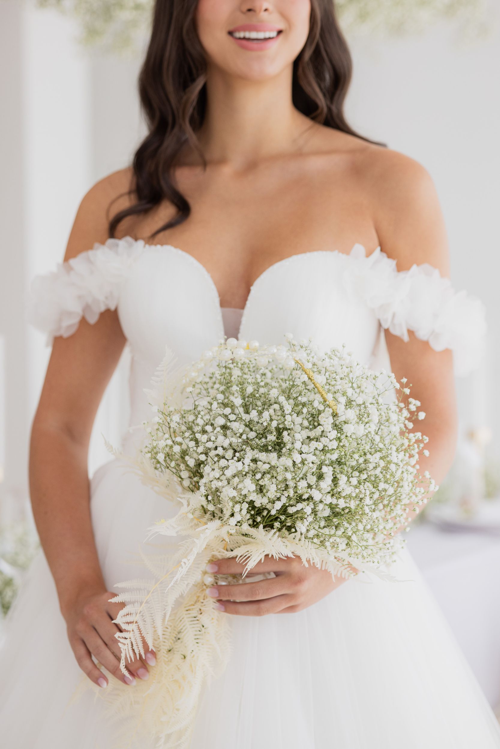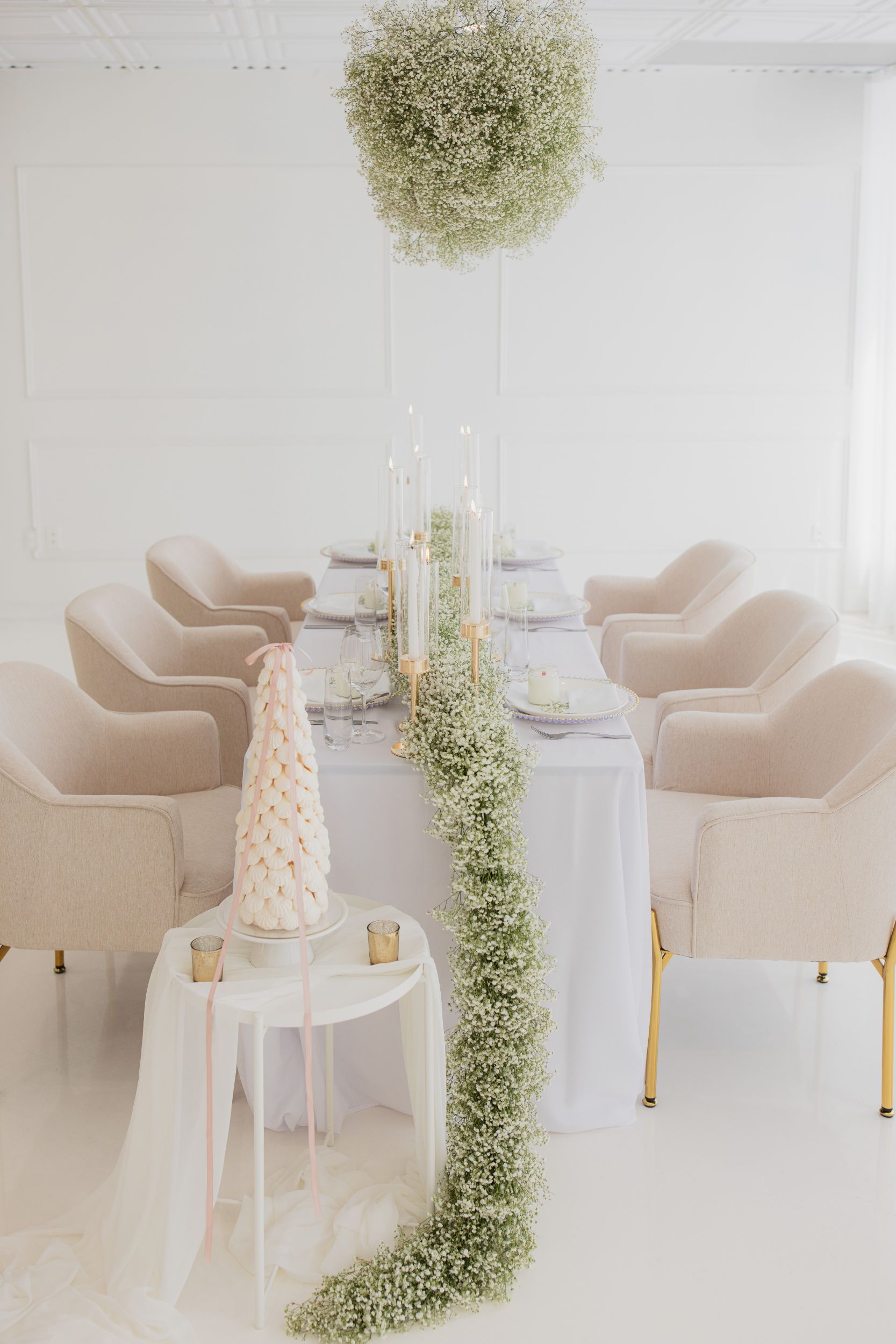 For this stunning editorial feature, we embraced the delicate beauty of baby’s breath, using its airy blooms to craft an atmosphere of elegance and whimsy. Cascading floral installations and cloud-like arrangements set the scene, complementing a refined palette of soft neutrals and gold accents.