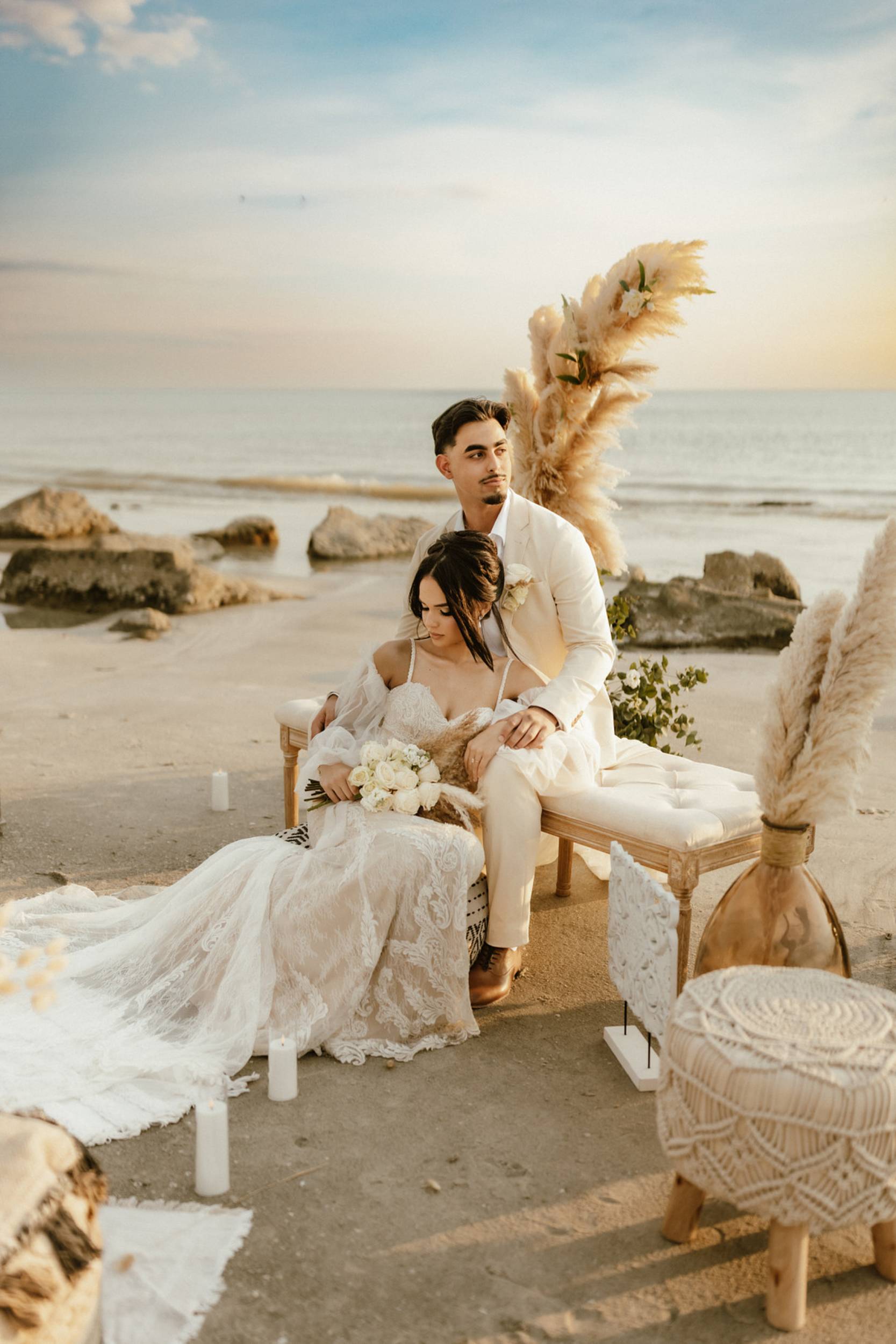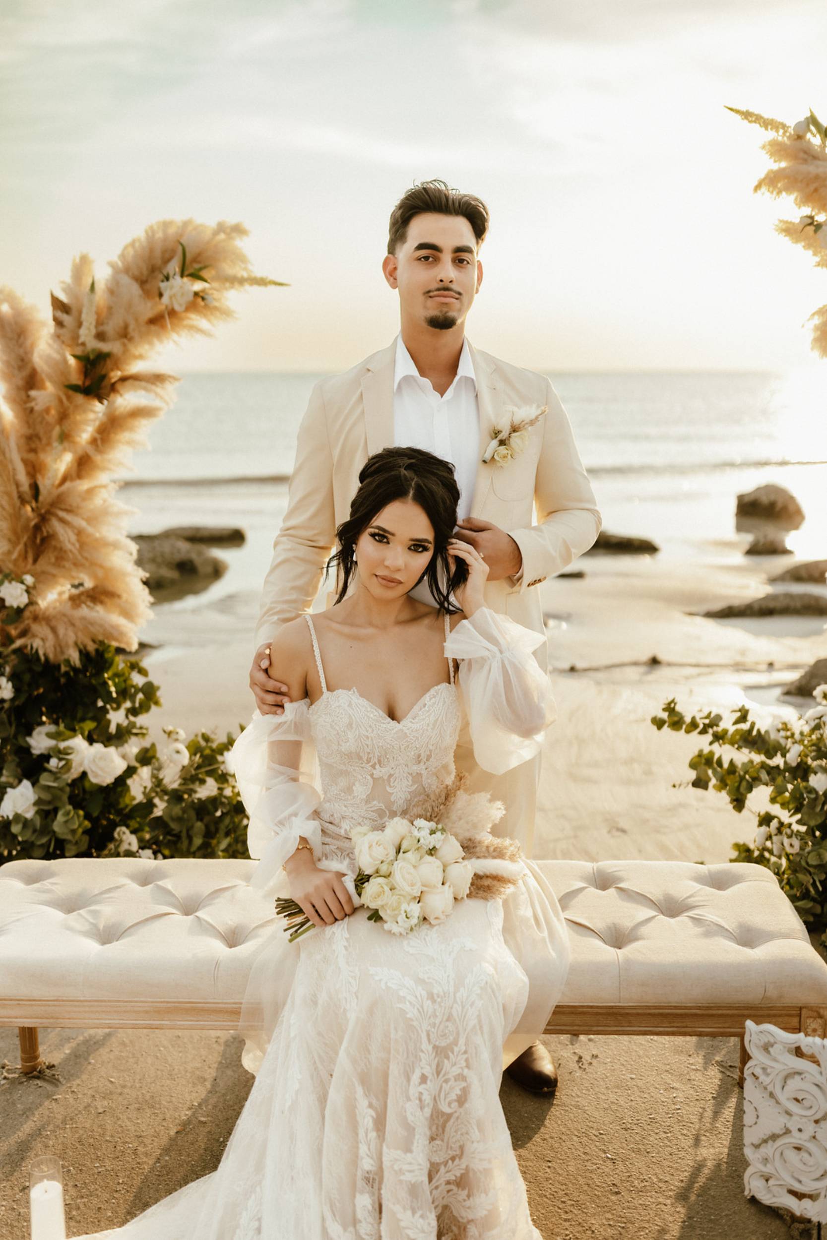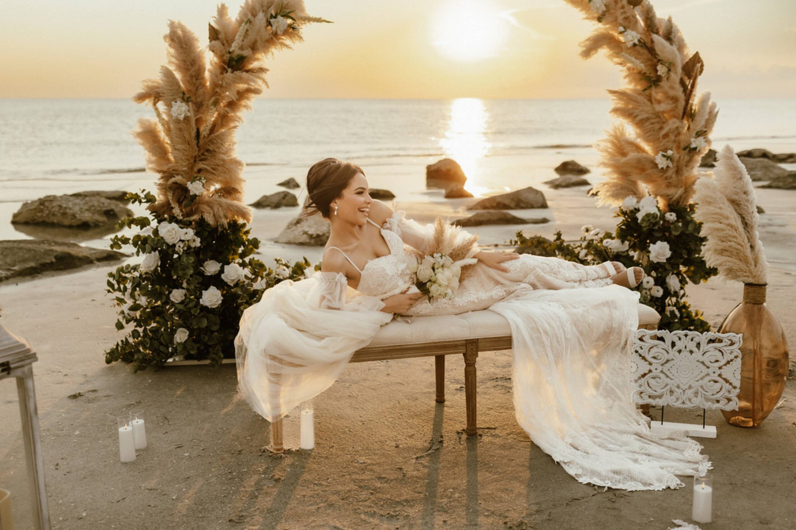 This stunning setup is the epitome of simple elegance, where natural elements like pampas grass, soft whites, and beige tones harmonize beautifully with the golden hues of a beach sunset. Imagine exchanging vows surrounded by this serene atmosphere, where every detail feels both intimate and timeless.