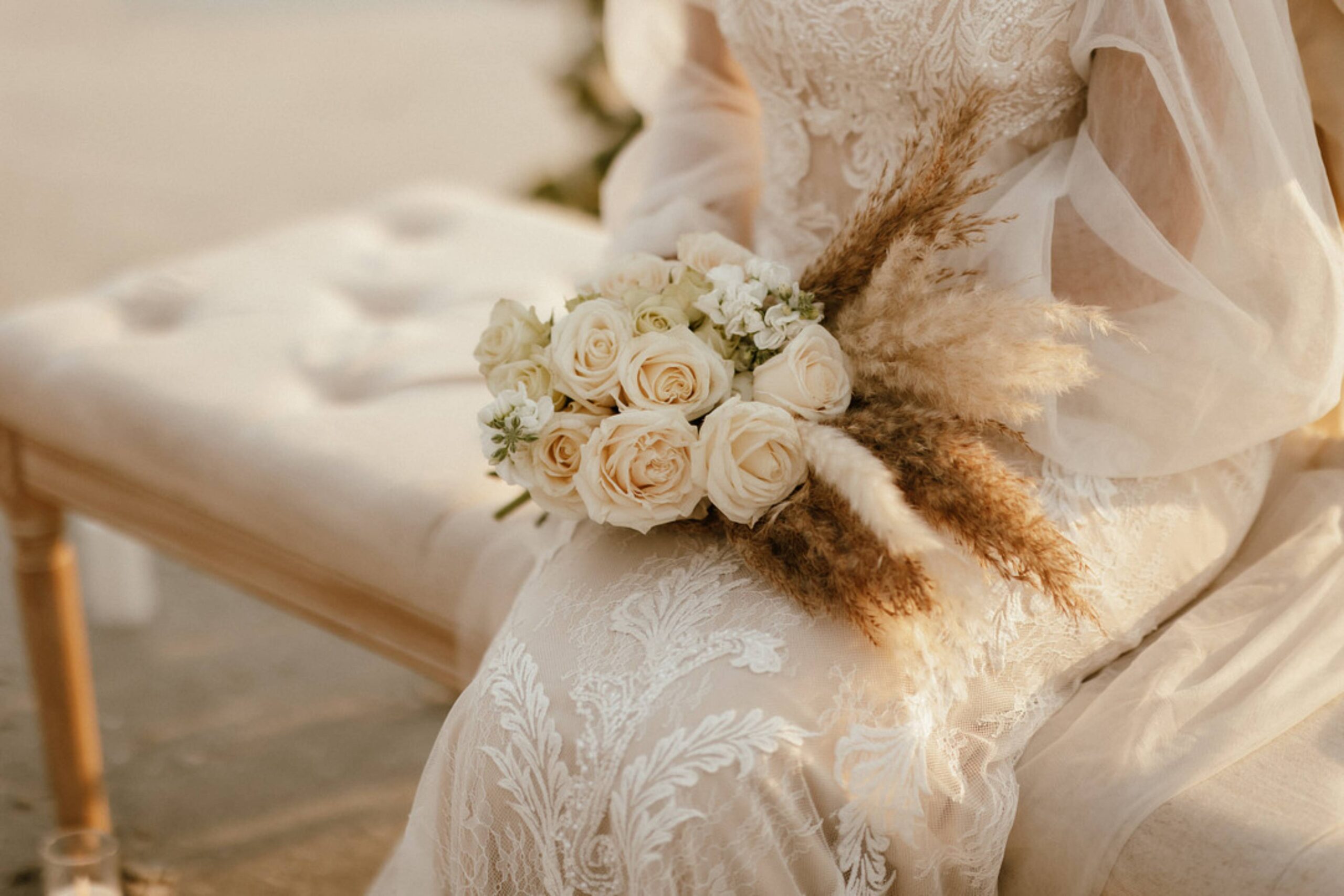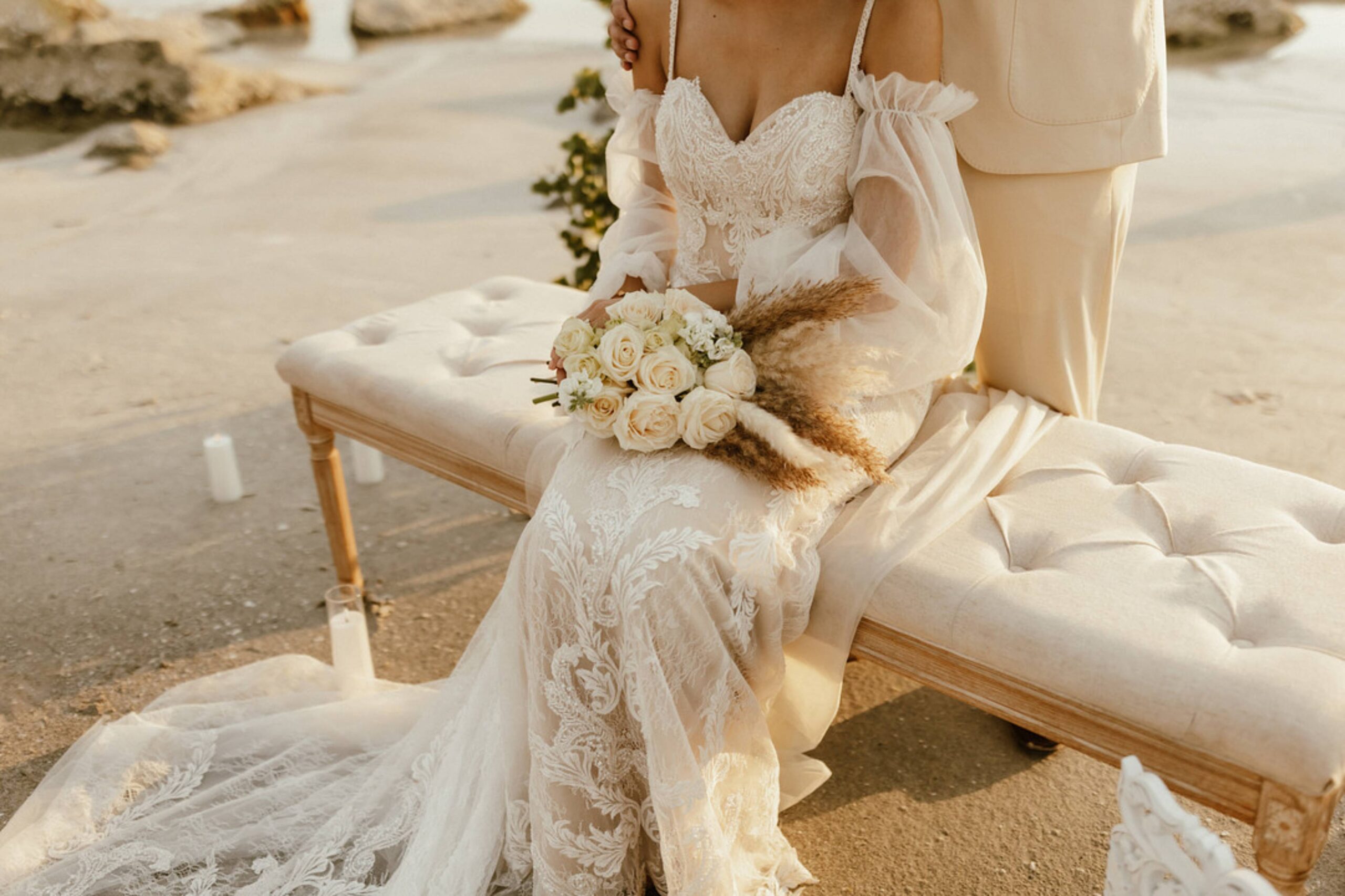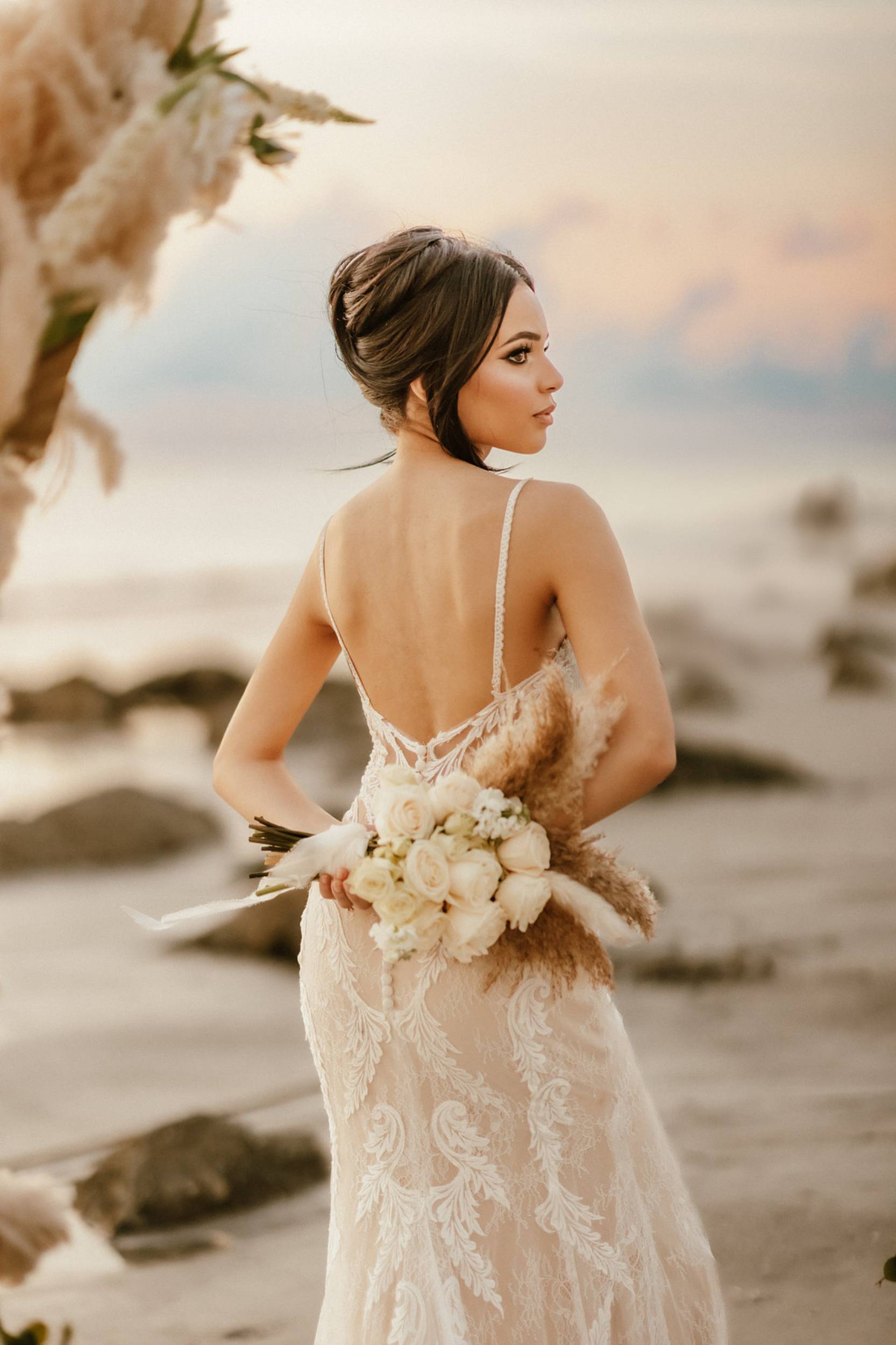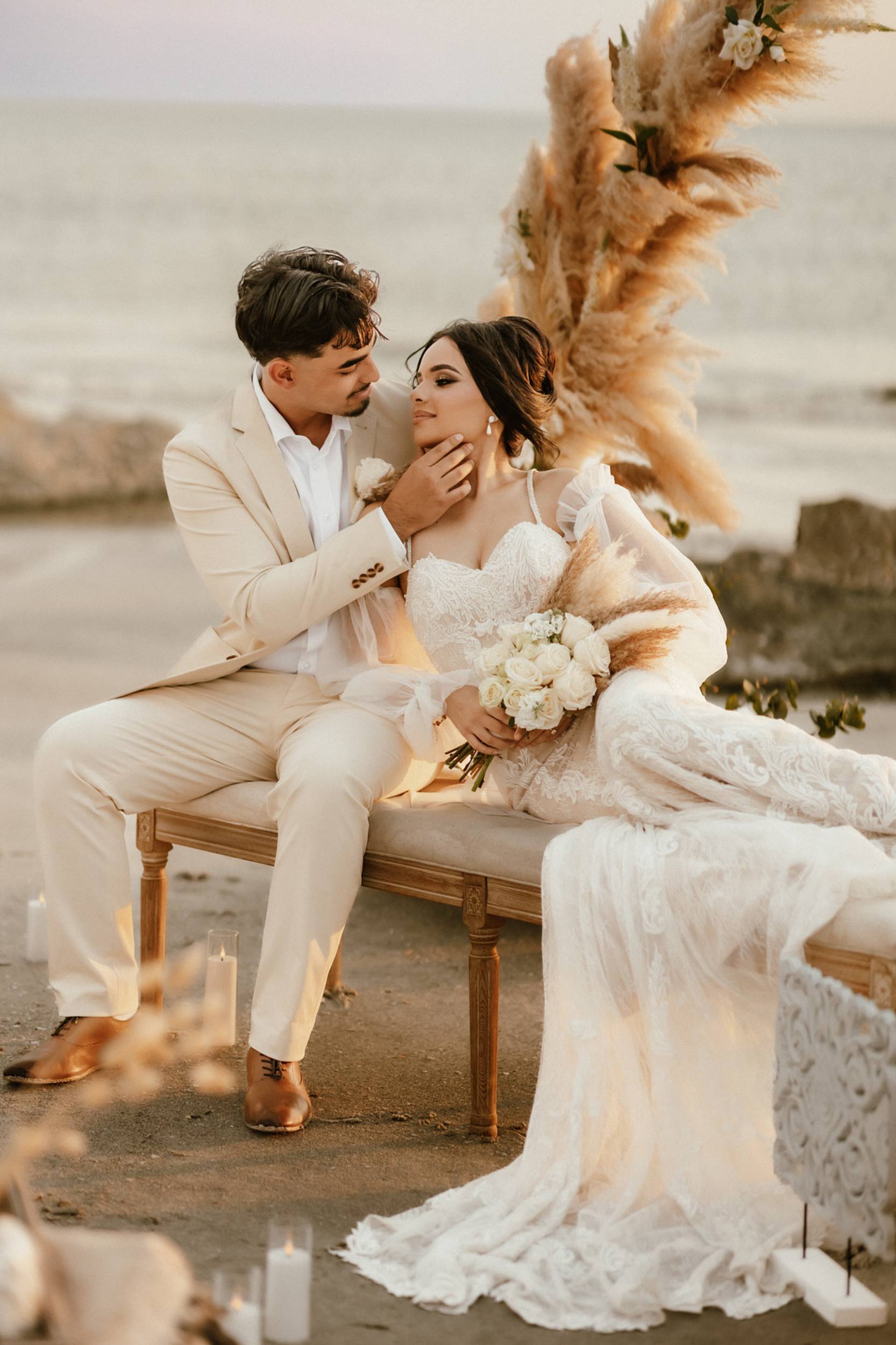 This stunning setup is the epitome of simple elegance, where natural elements like pampas grass, soft whites, and beige tones harmonize beautifully with the golden hues of a beach sunset. Imagine exchanging vows surrounded by this serene atmosphere, where every detail feels both intimate and timeless.