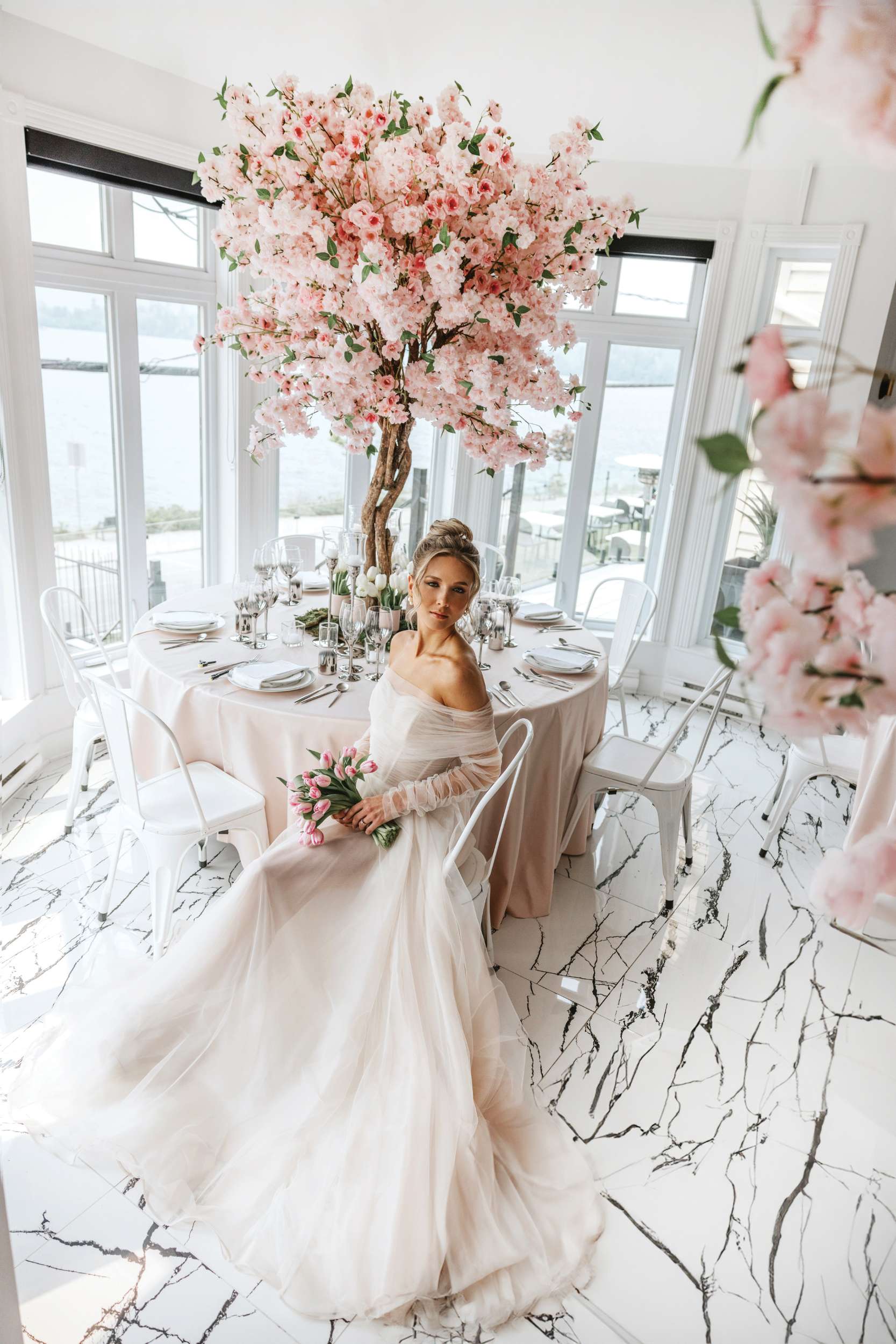 Pink and white wedding theme unfolds like a fairy tale, enveloping the celebration in a soft, timeless elegance that whispers romance and sophistication.