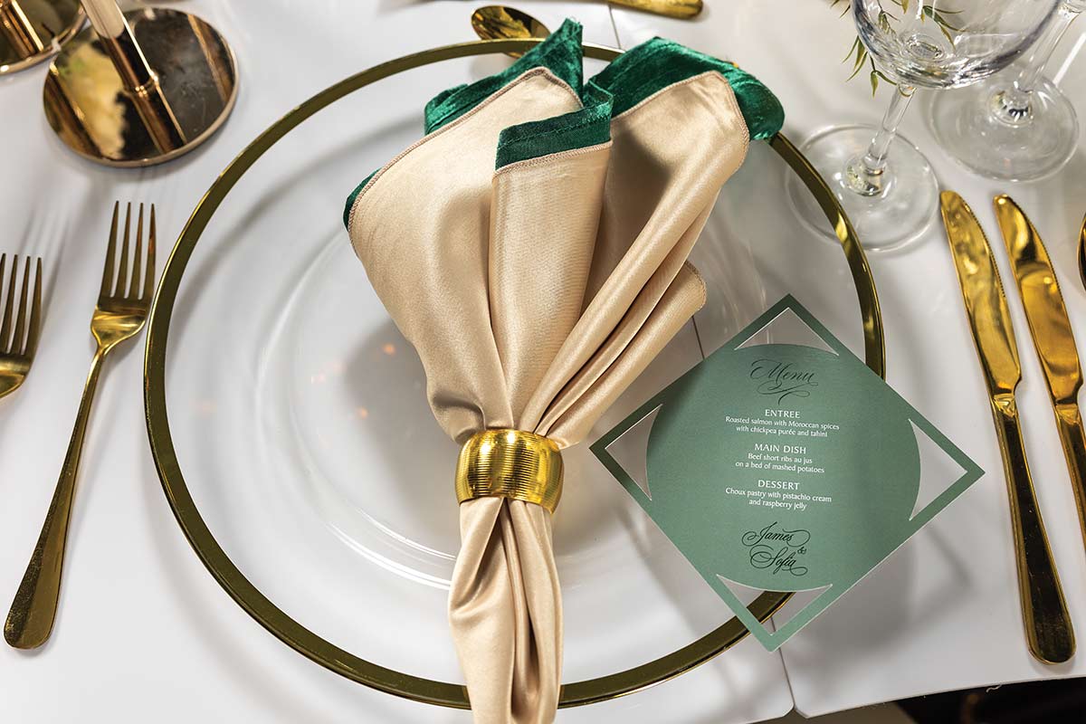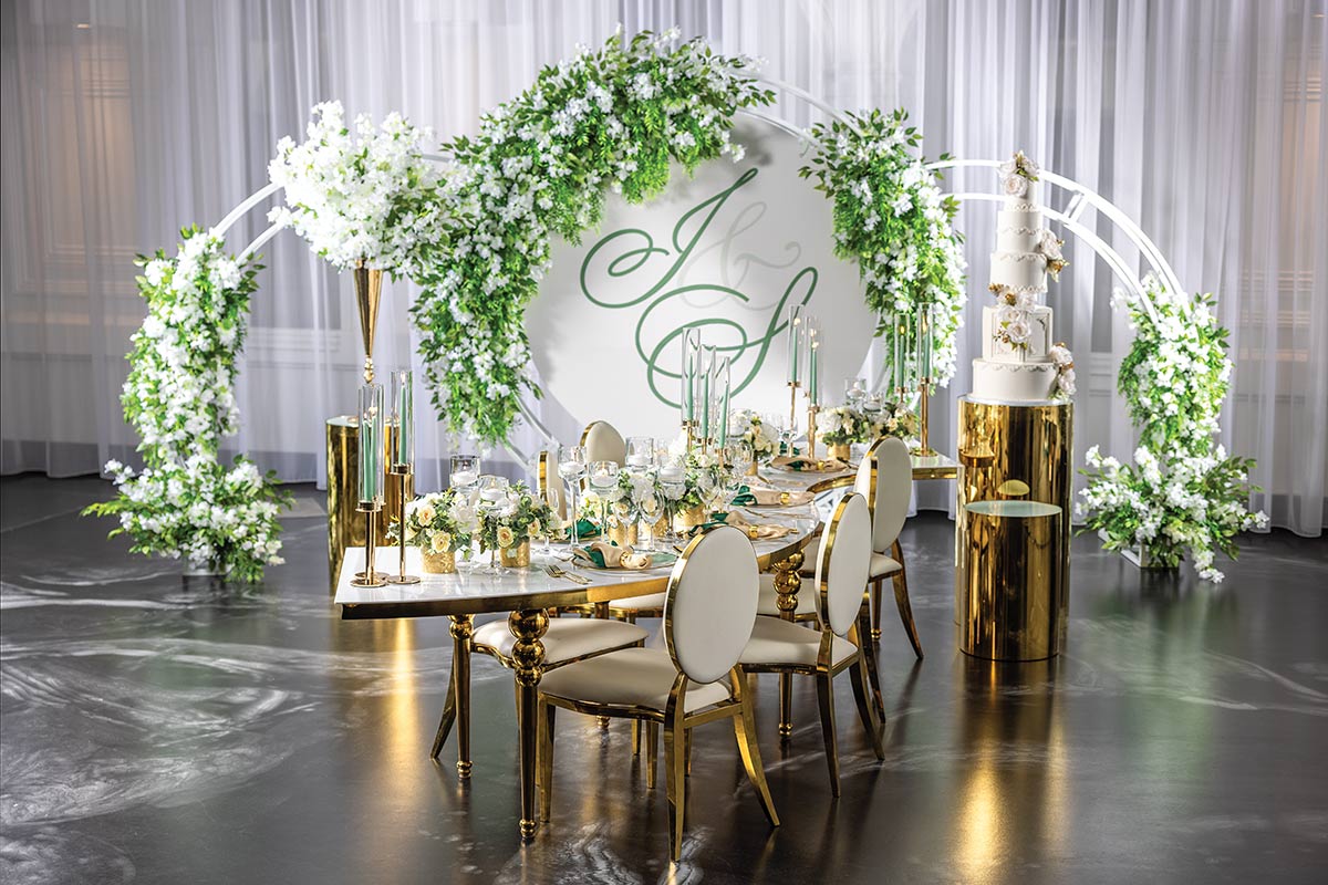 Imagine walking into a venue adorned with cascading greenery and delicate white florals, just like the lush arch framing the couple. The simplicity of white paired with vibrant green foliage brings nature’s beauty indoors, creating a fresh and romantic ambiance. Tables set with gold accents, soft candlelight, and ivory blooms elevate the sophistication while maintaining a natural charm.