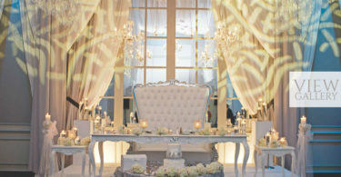 Mirrored tabletop decor, hanging chandeliers and breathtaking drapery brought a timeless feel with a modern...